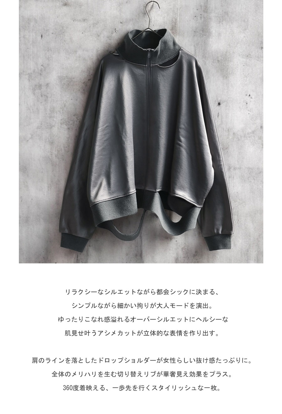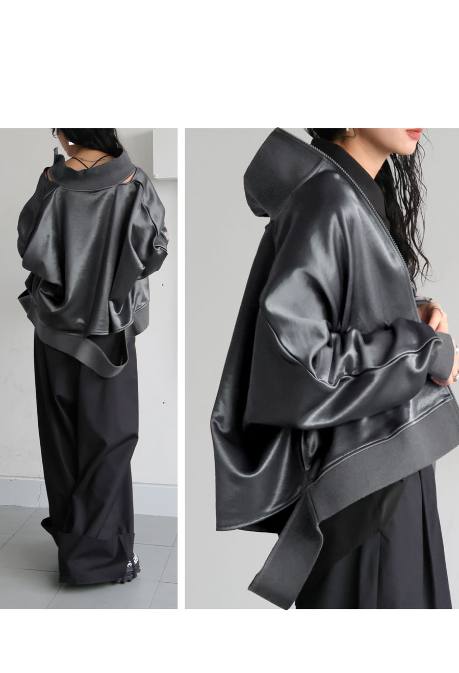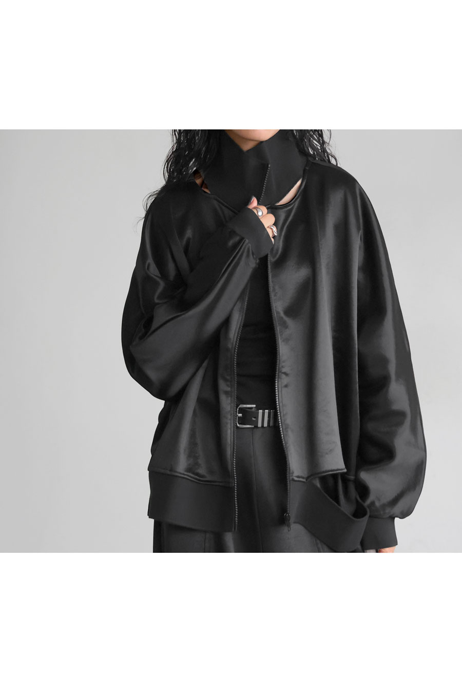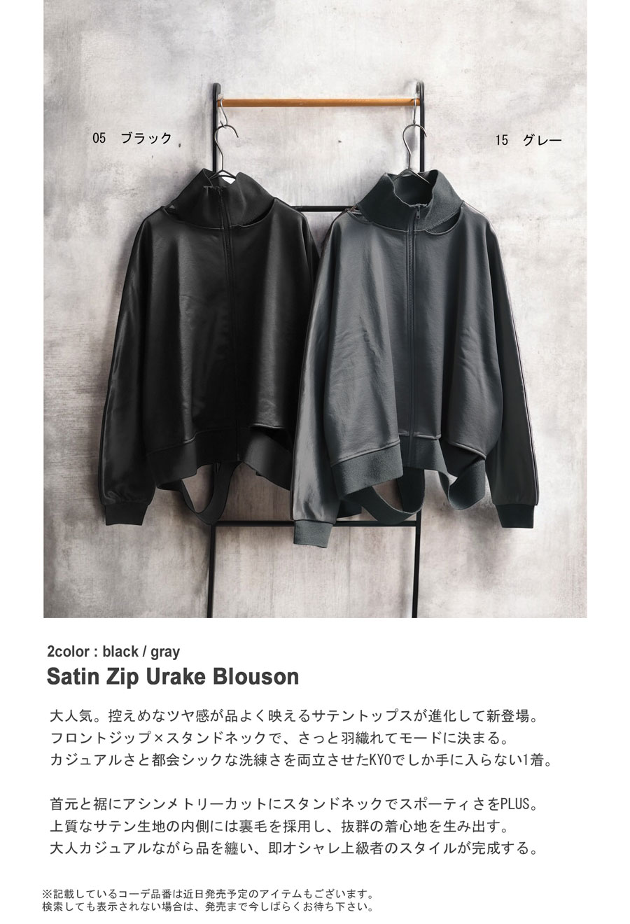 艶やかなサテン生地と独自の立体フォルムが目を惹く、KYOらしい感性が光るジップブルゾン。
