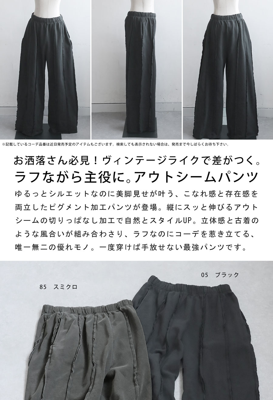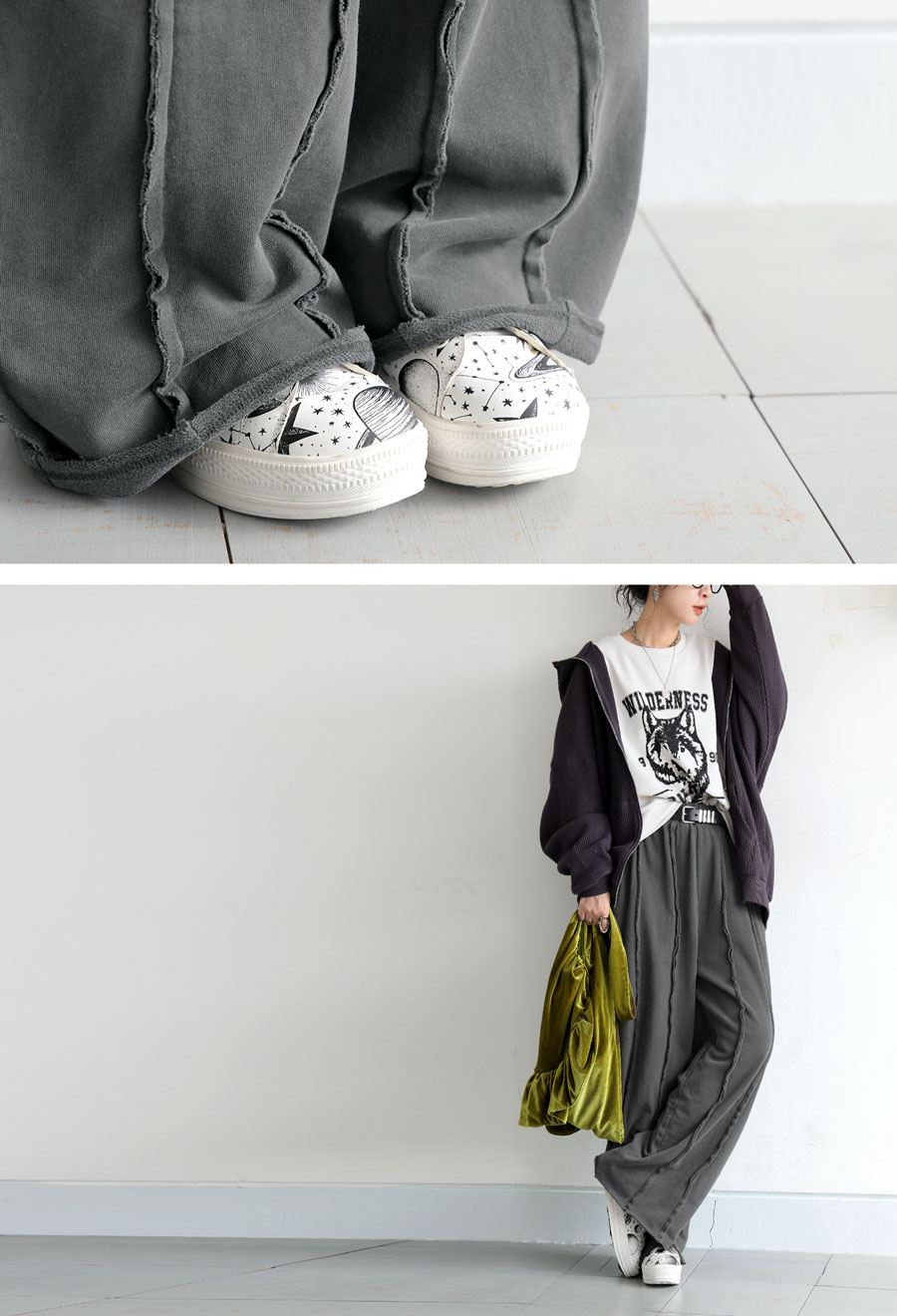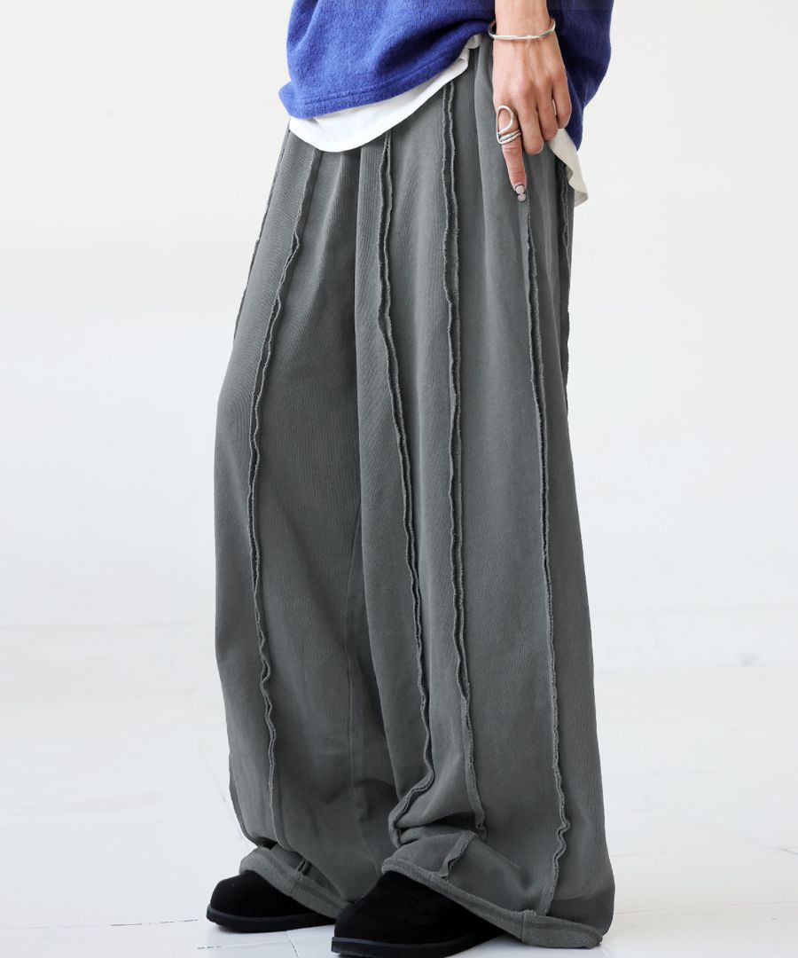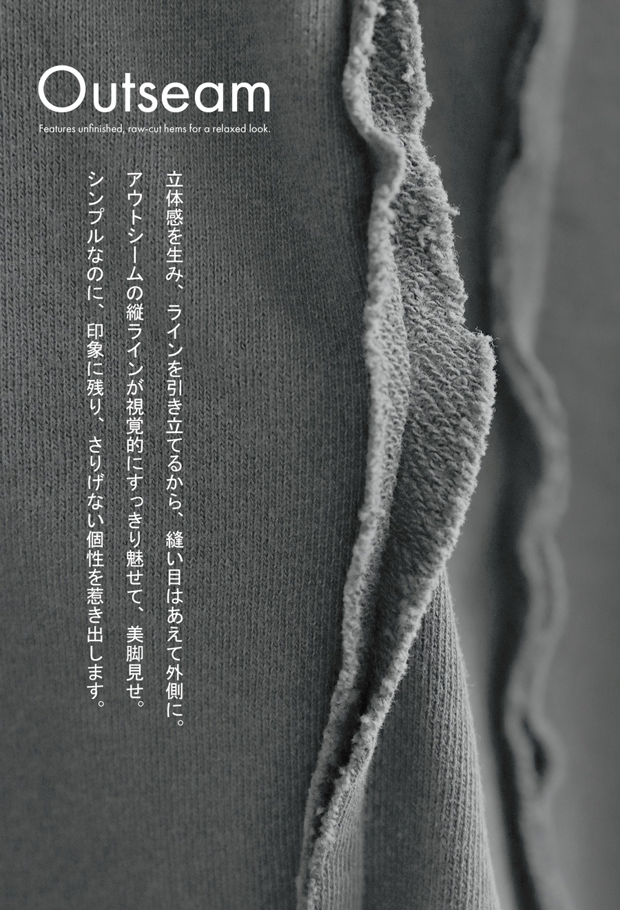 アウトシームの切り替えラインと裾の切りっぱなし仕様が、古着風のラフな雰囲気を演出。