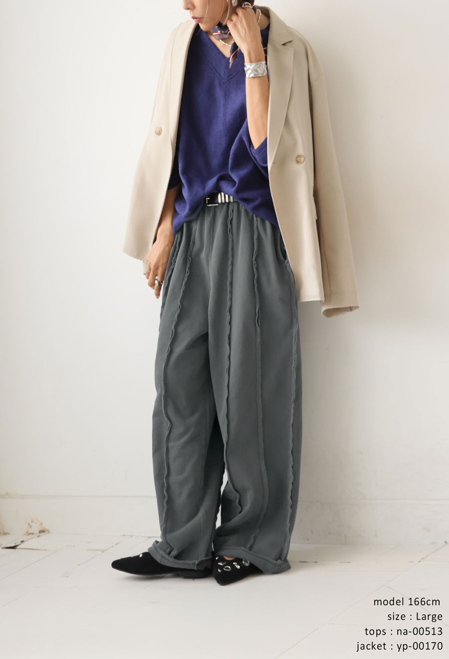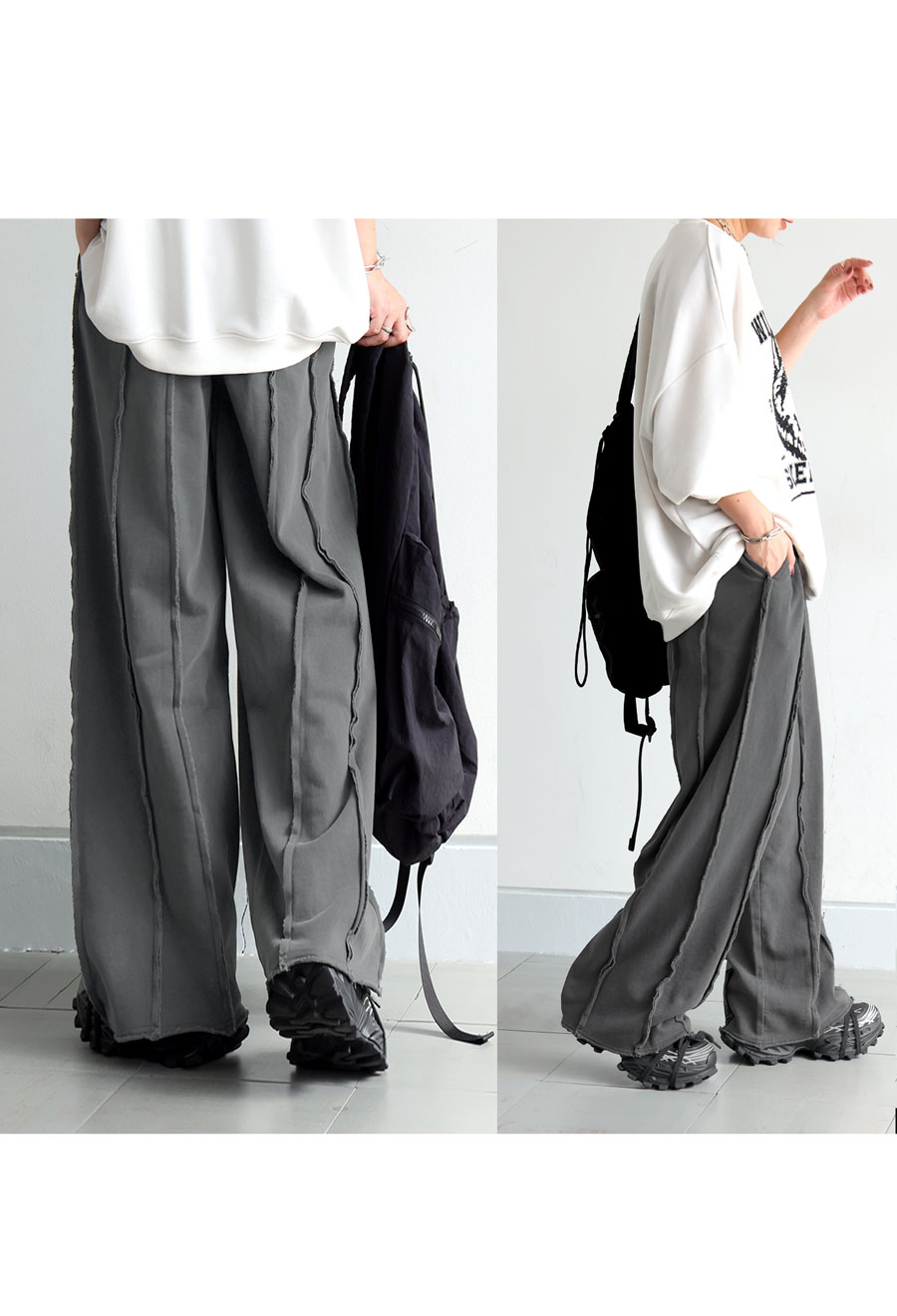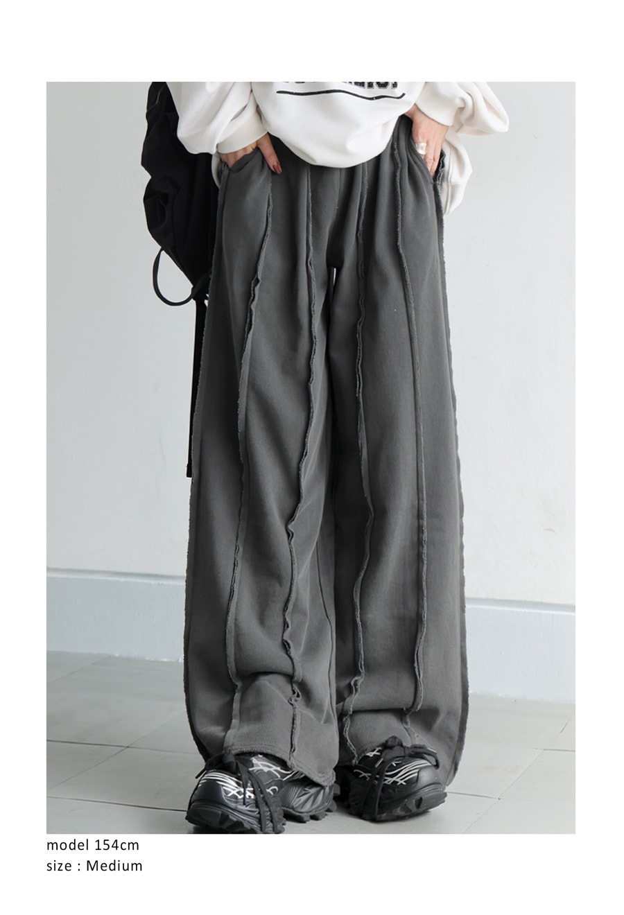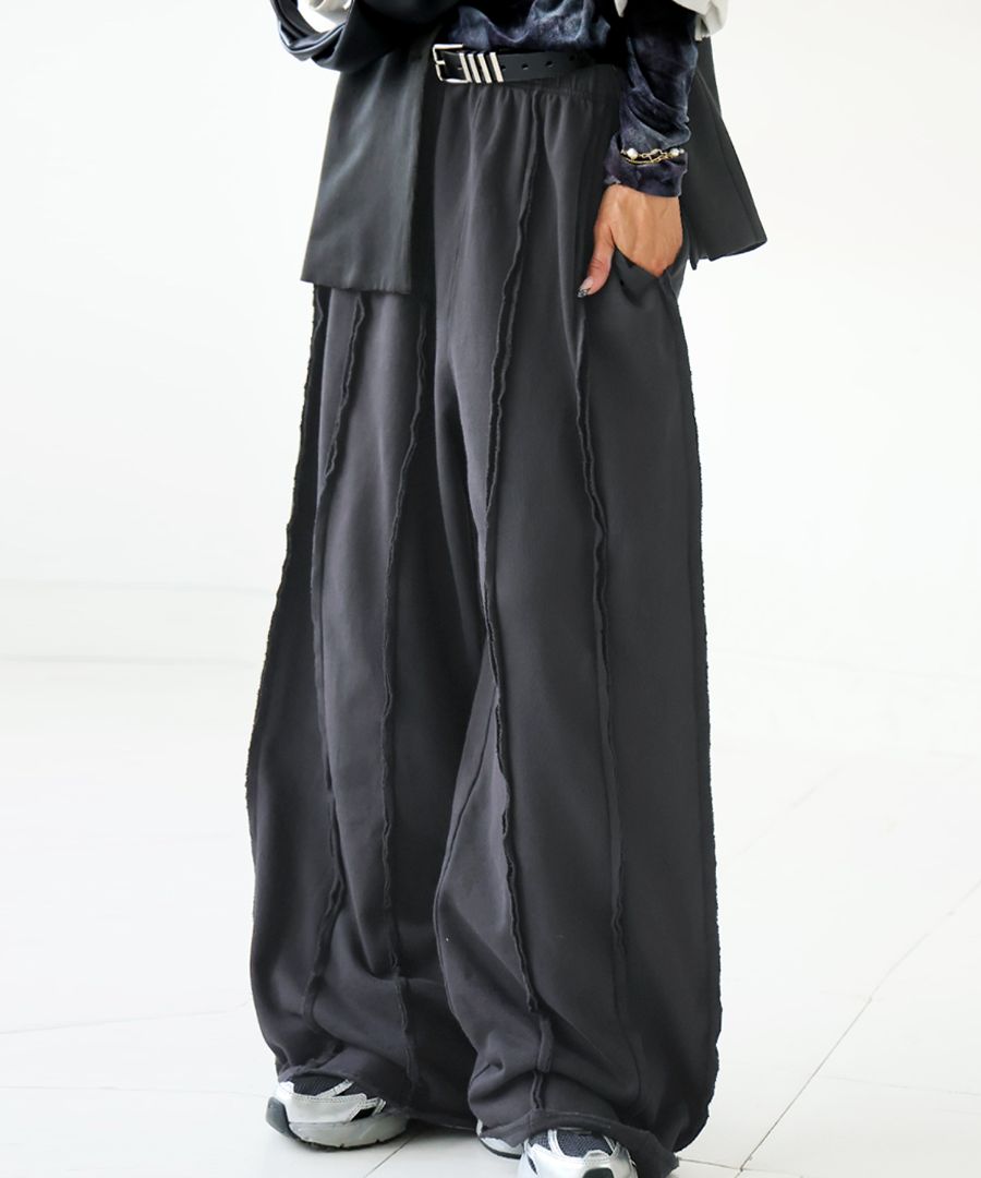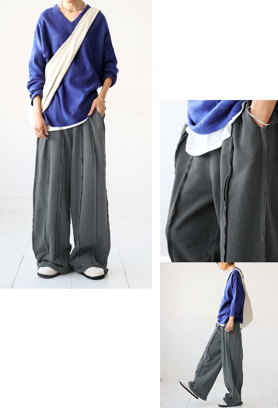 アウトシームの切り替えラインと裾の切りっぱなし仕様が、古着風のラフな雰囲気を演出。