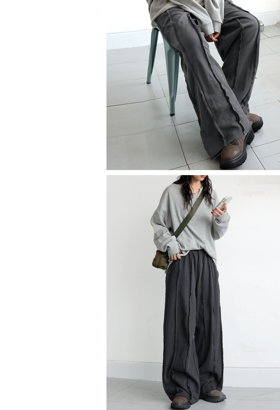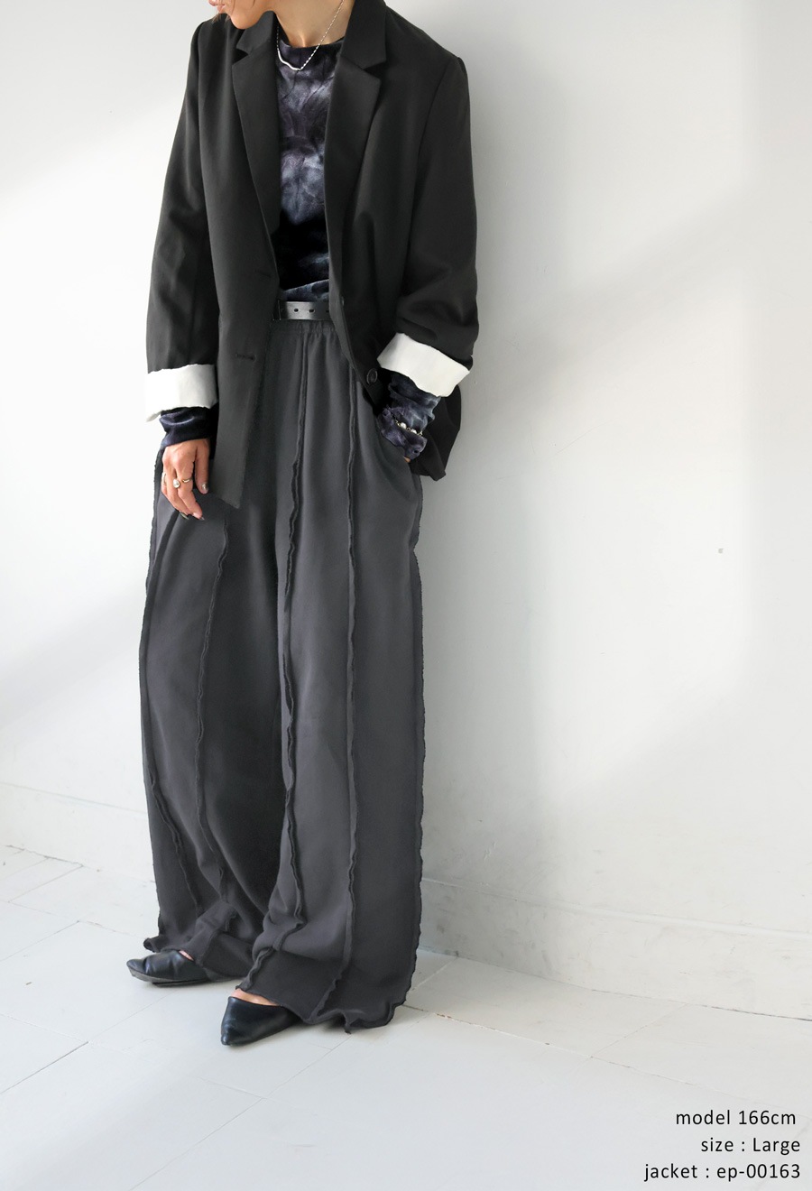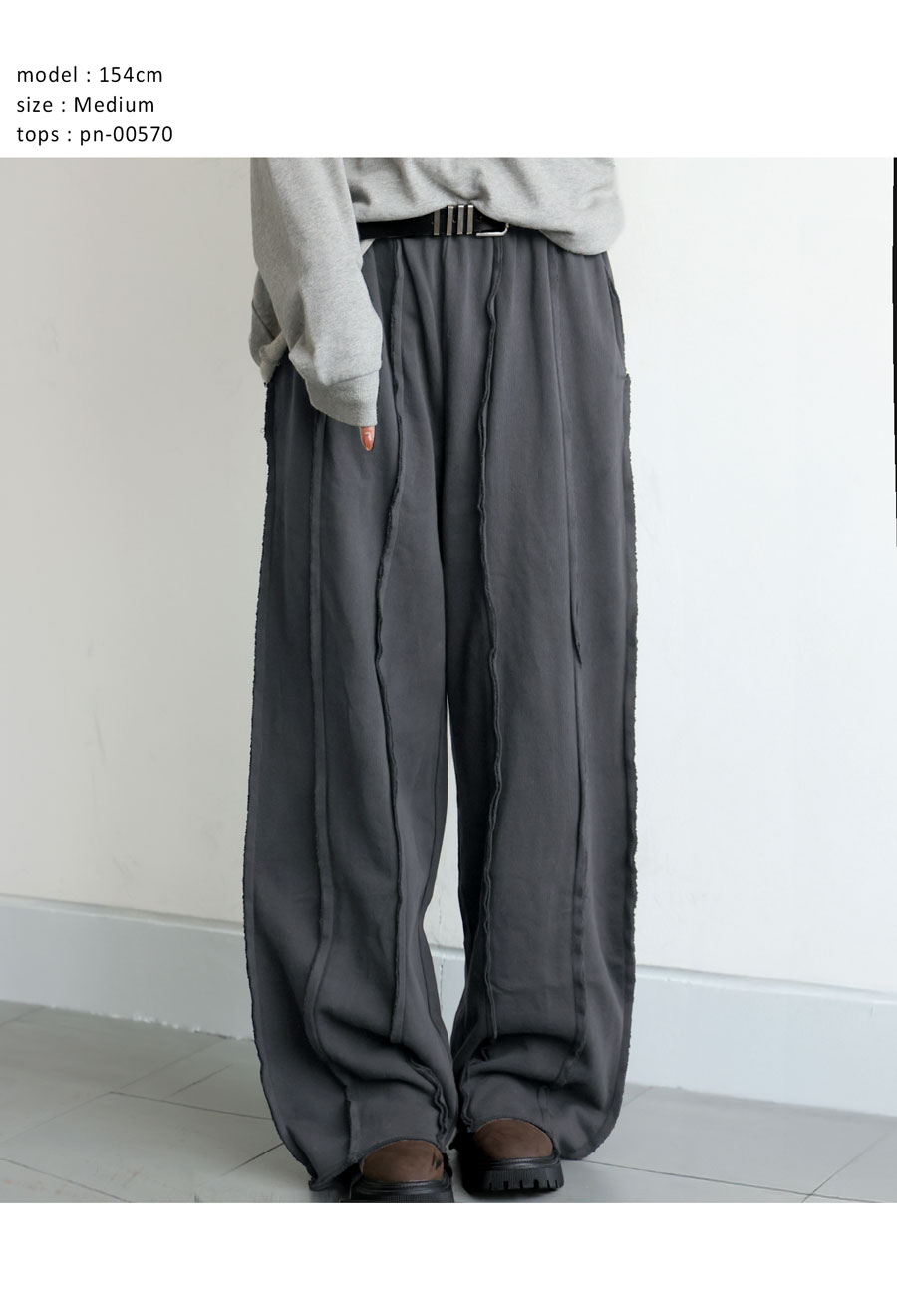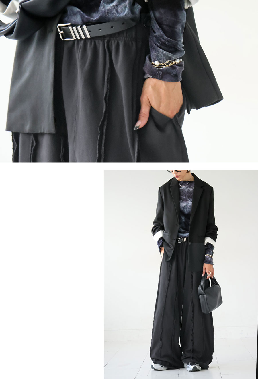 アウトシームの切り替えラインと裾の切りっぱなし仕様が、古着風のラフな雰囲気を演出。