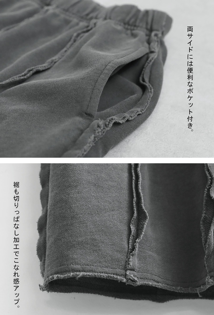 ウエストは総ゴム仕様で脱ぎ着しやすく、両サイドには便利なポケット付き。
