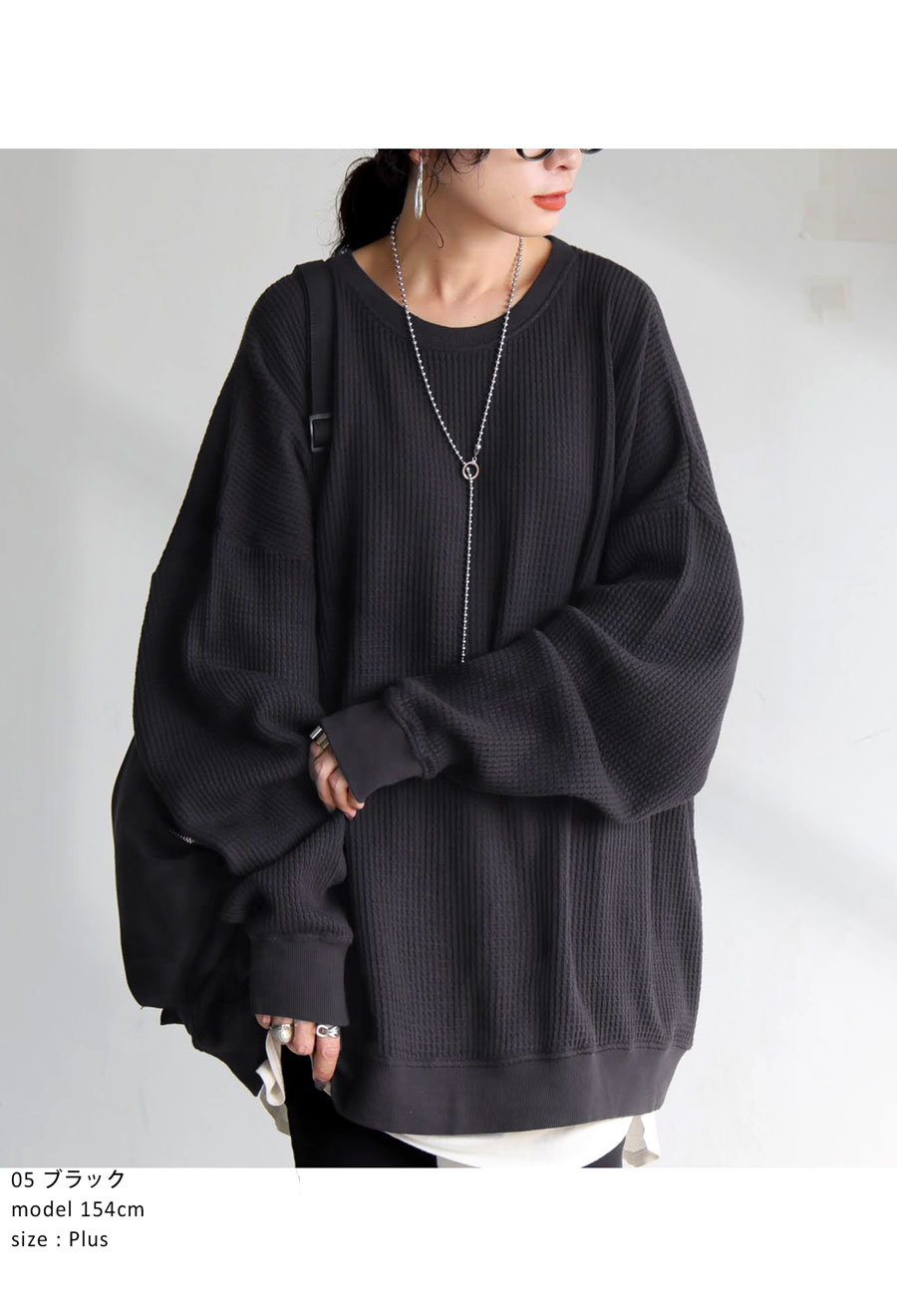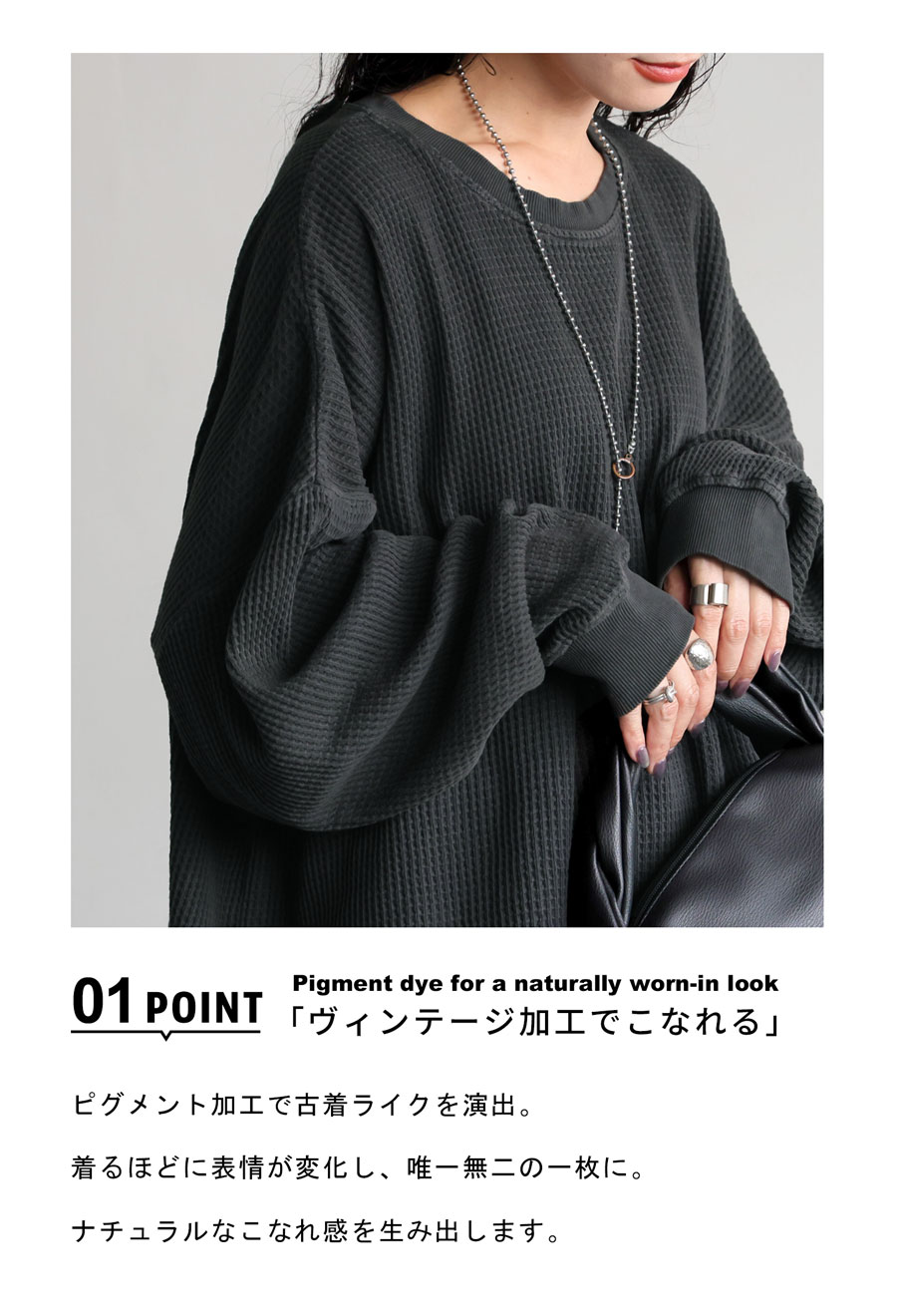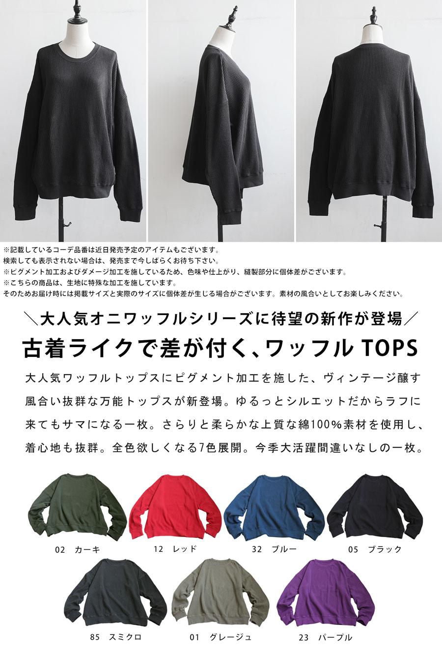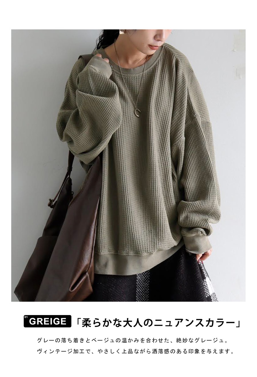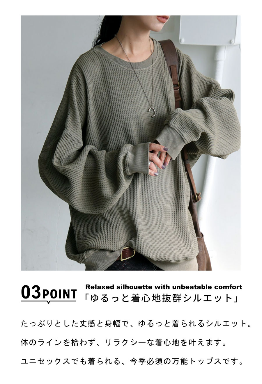 立体感のある鬼ワッフル(オニワッフル・ビッグワッフル)生地で仕立てた、綿100%の無地カットソーです。