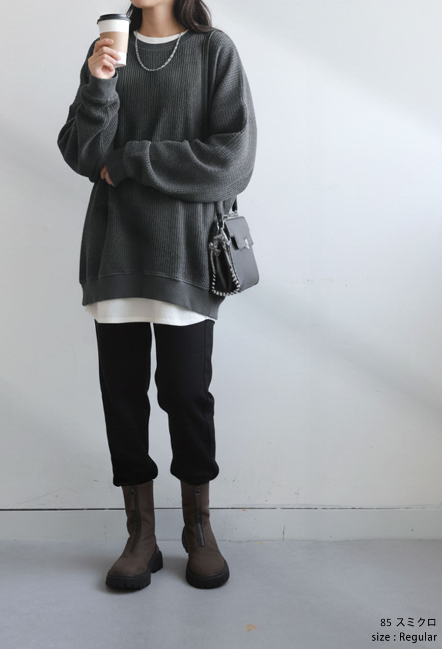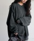 クルーネック(丸首)のネックラインとドロップショルダーの袖丈が抜け感を演出し、身幅にゆとりを持たせたオーバーサイズの形状がカジュアルな印象を引き立てます。