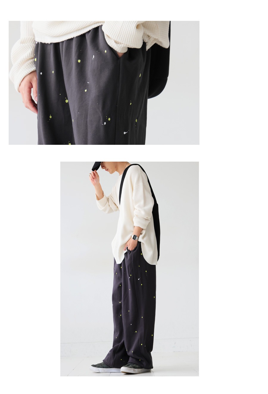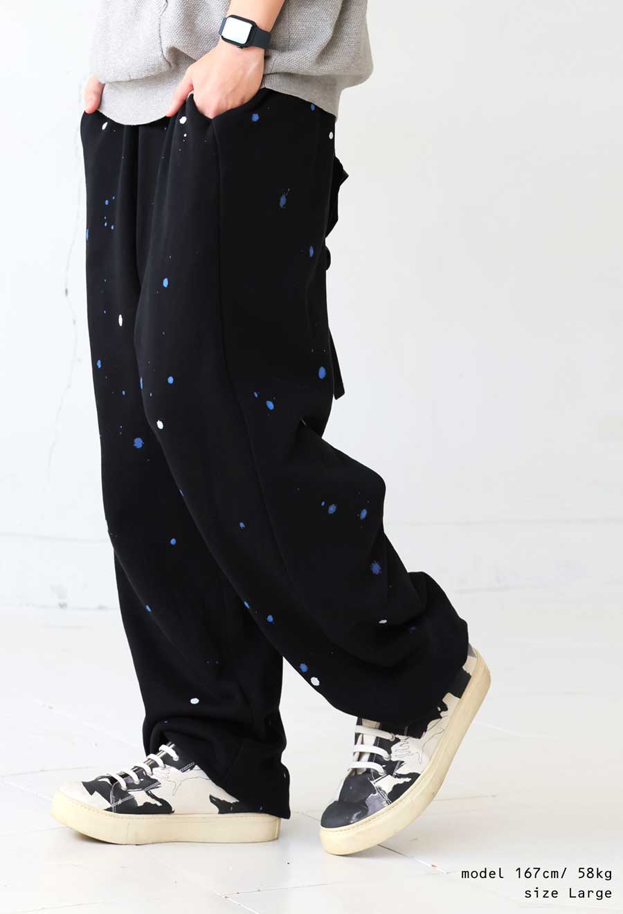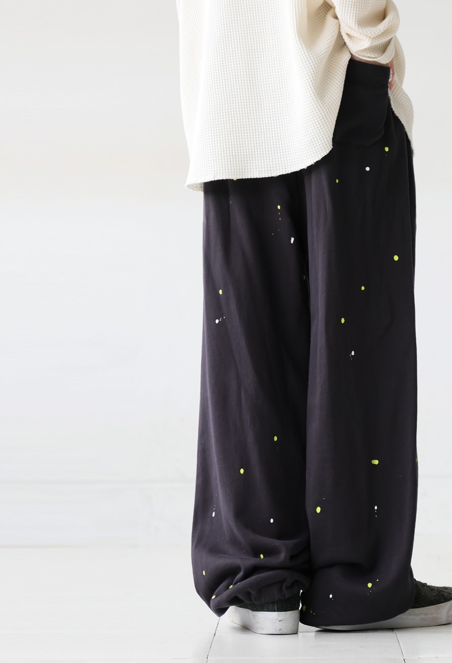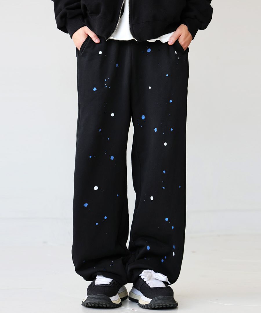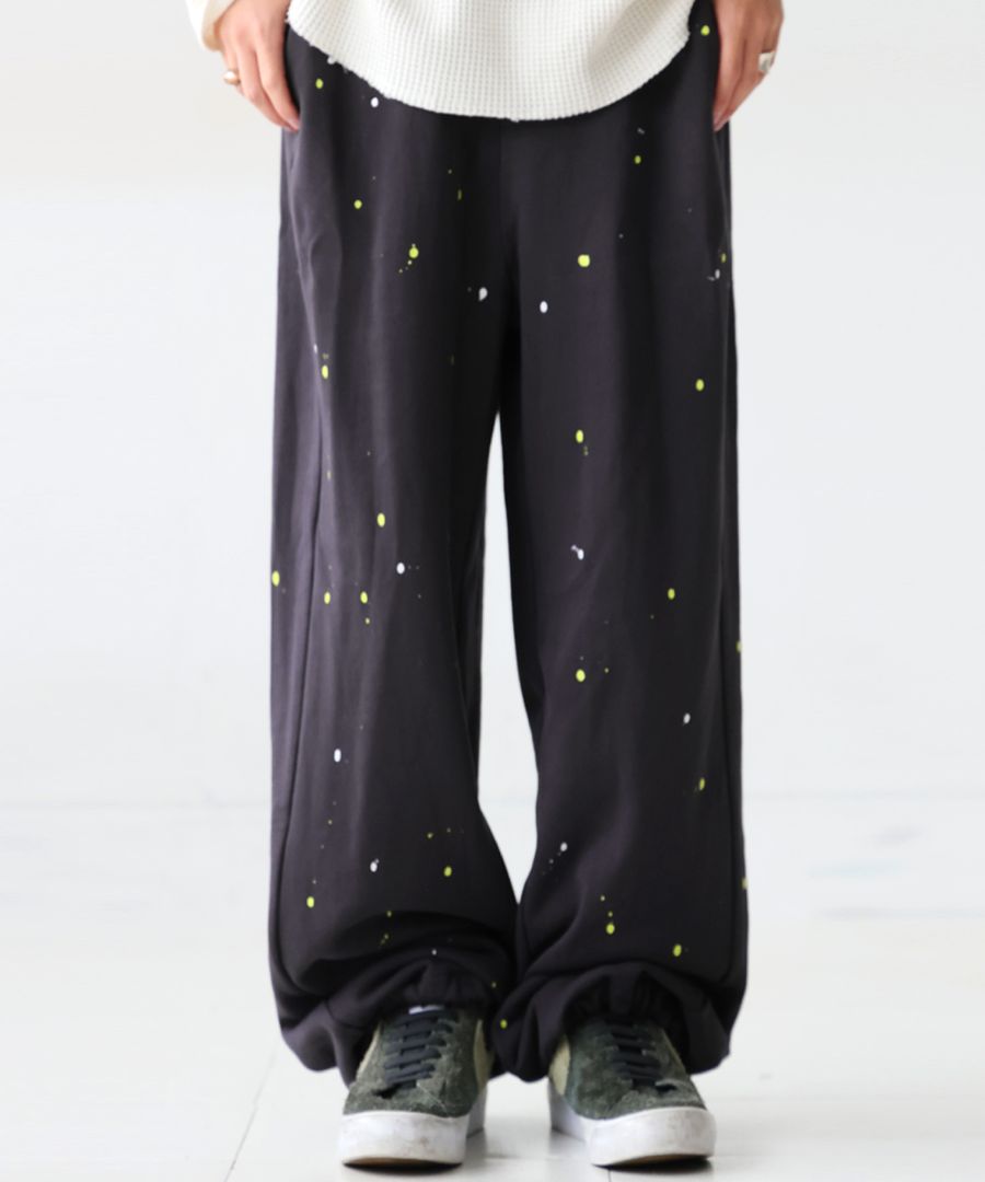 個性的な手描きペイントが映えるワイドシルエットのスウェットパンツです。