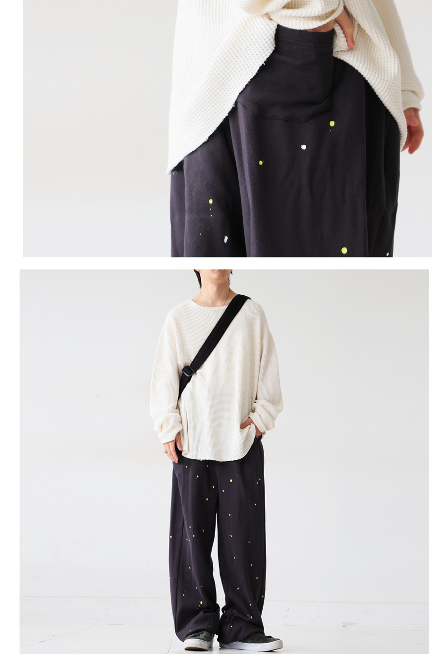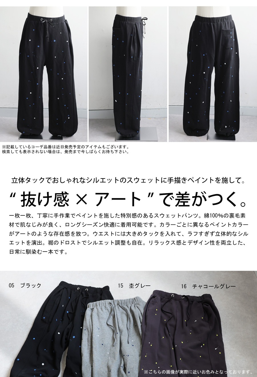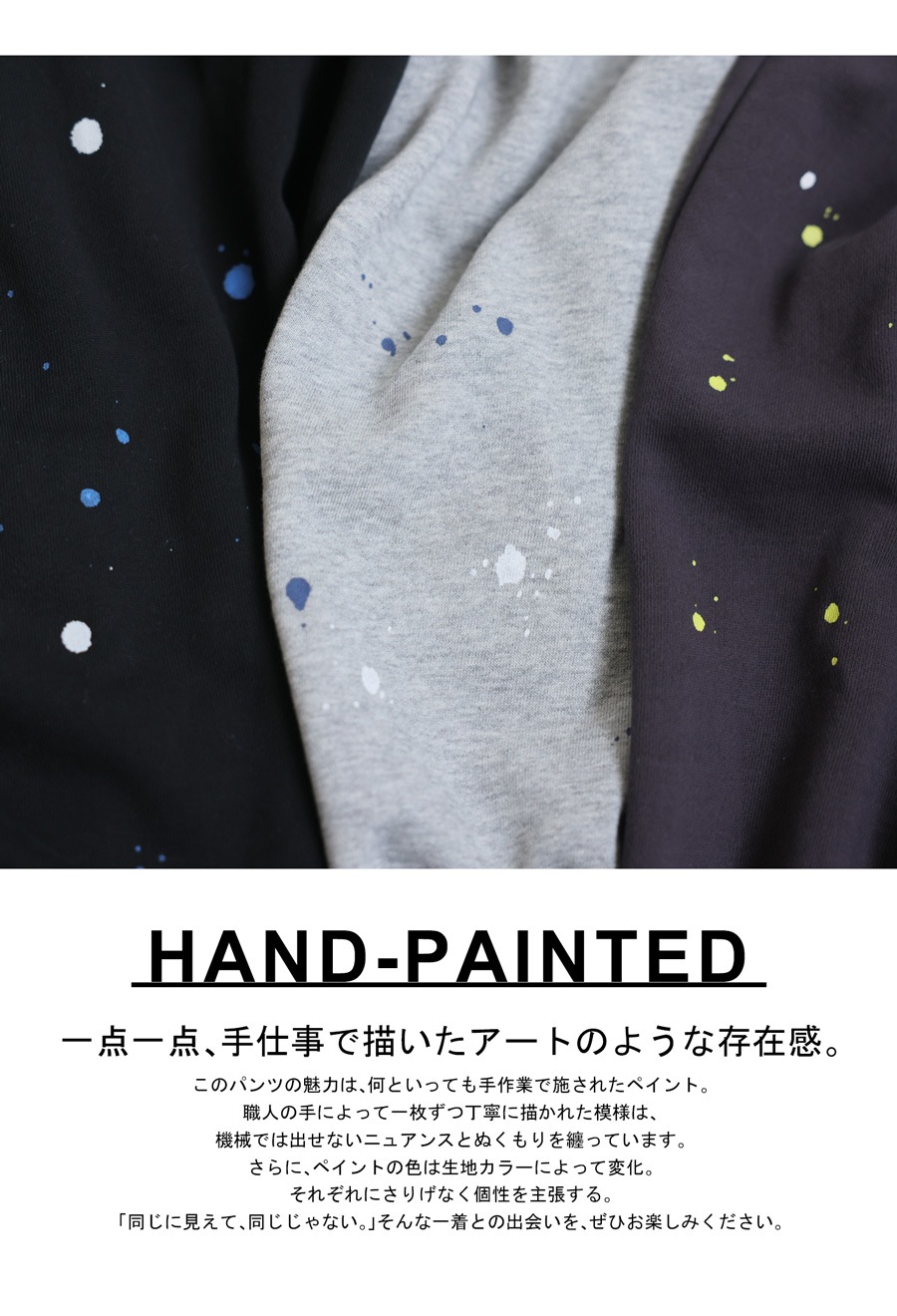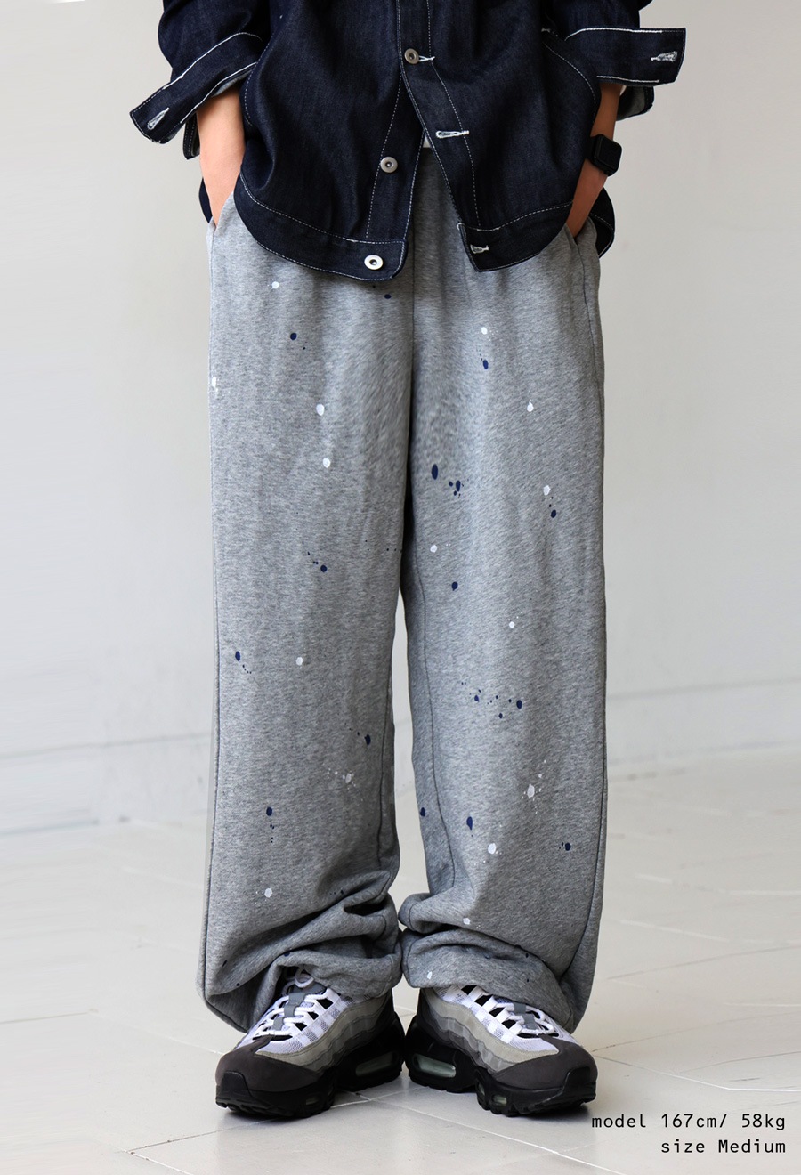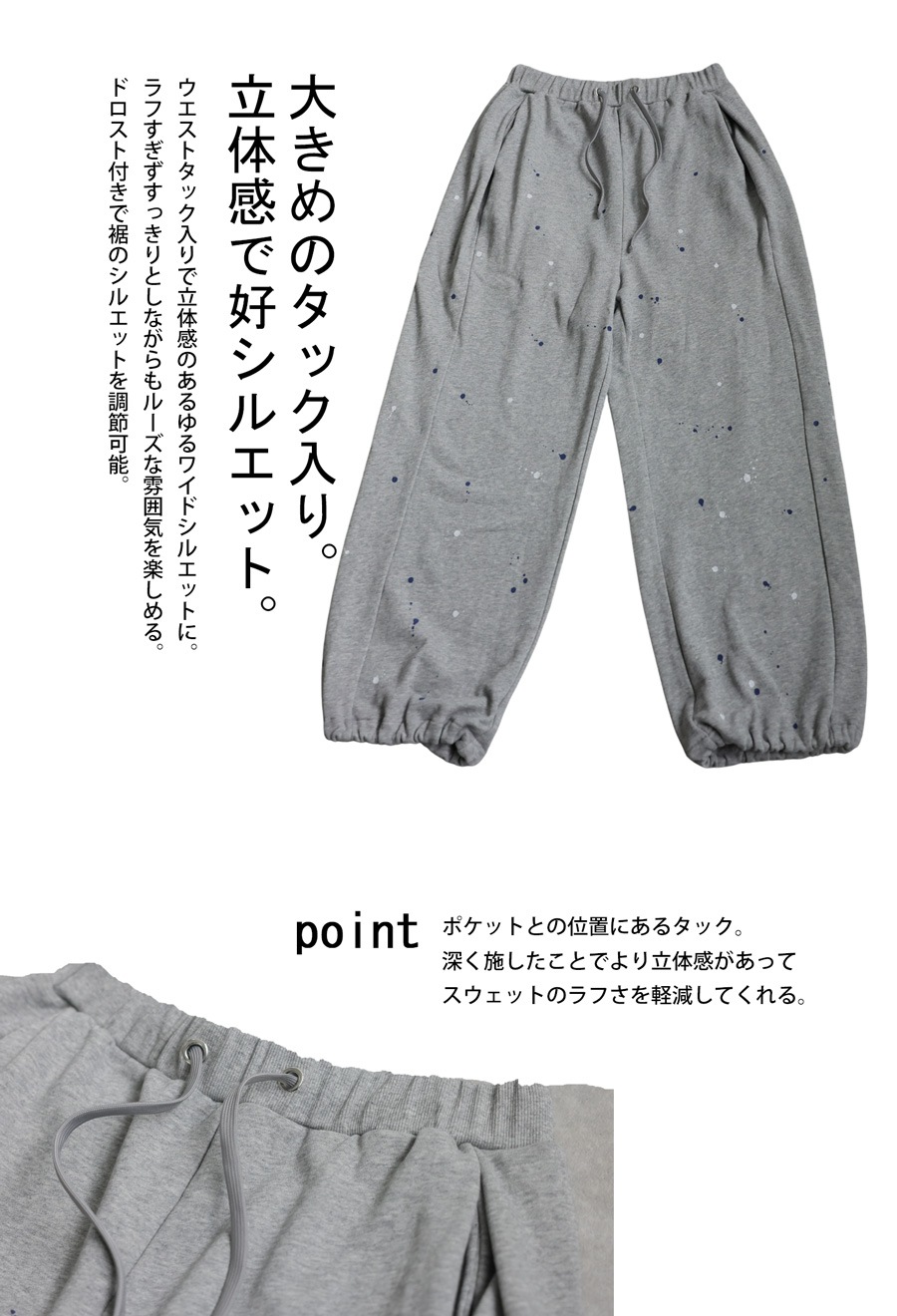 個性的な手描きペイントが映えるワイドシルエットのスウェットパンツです。