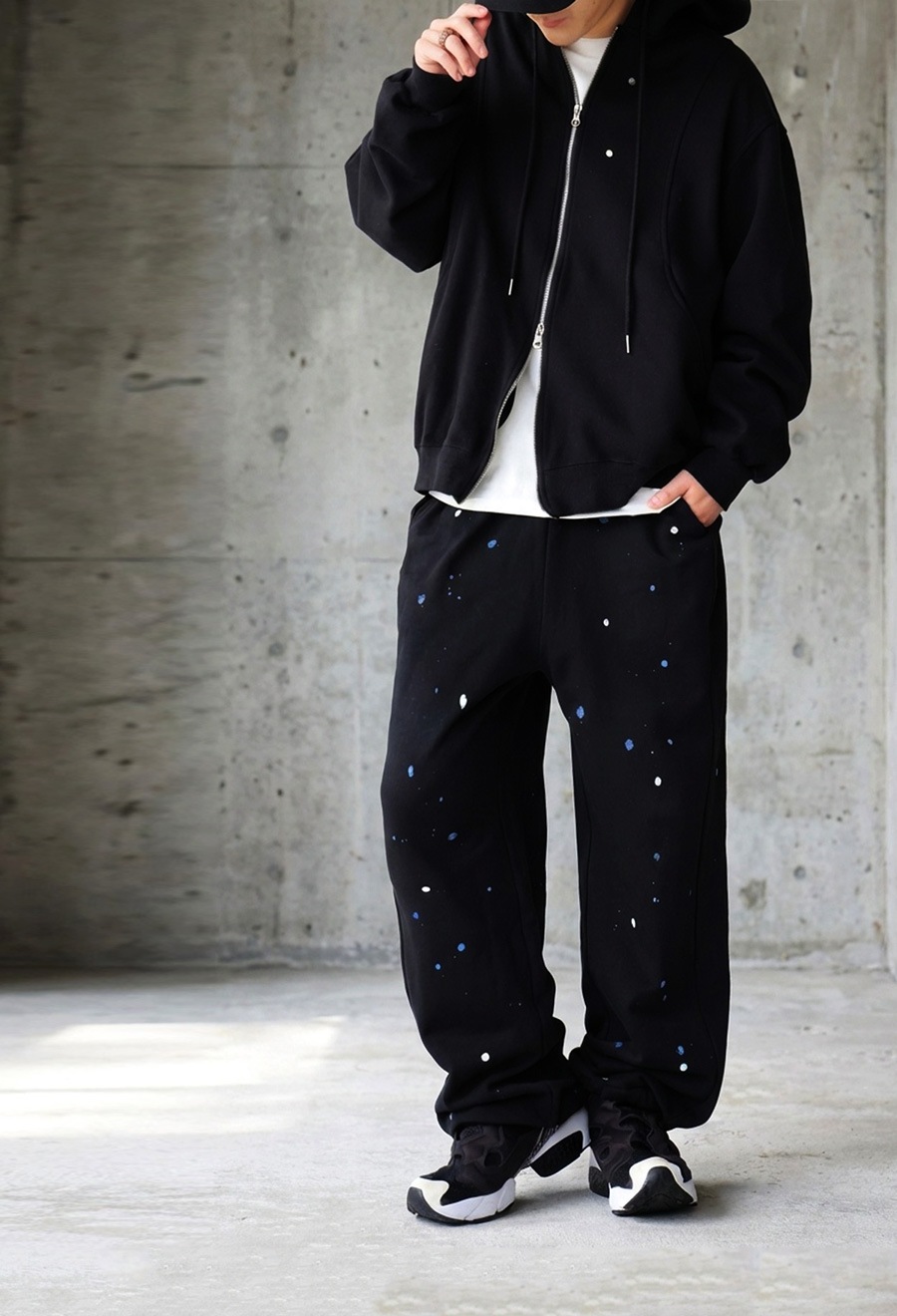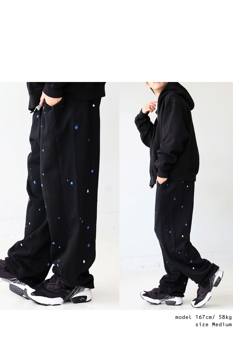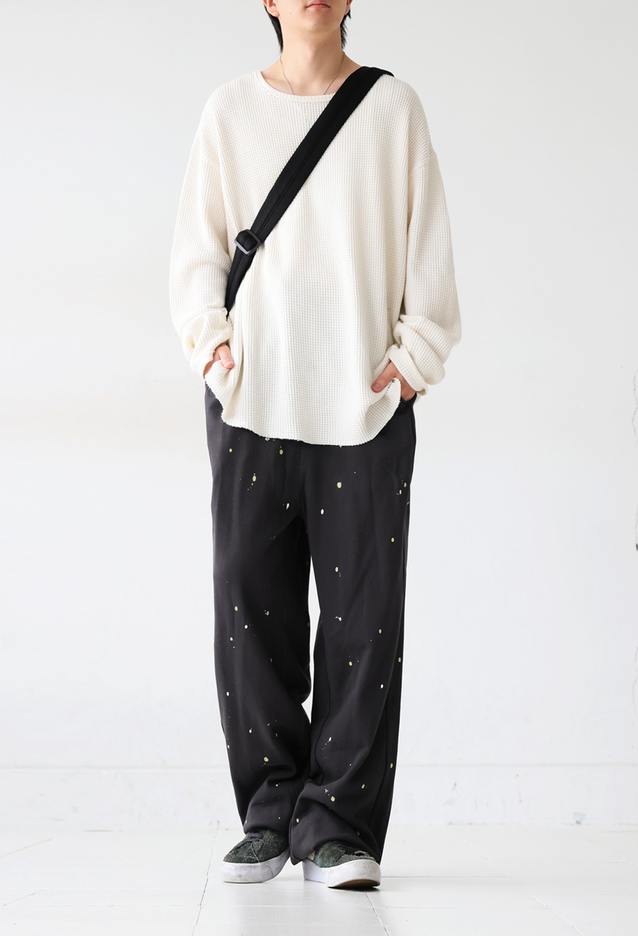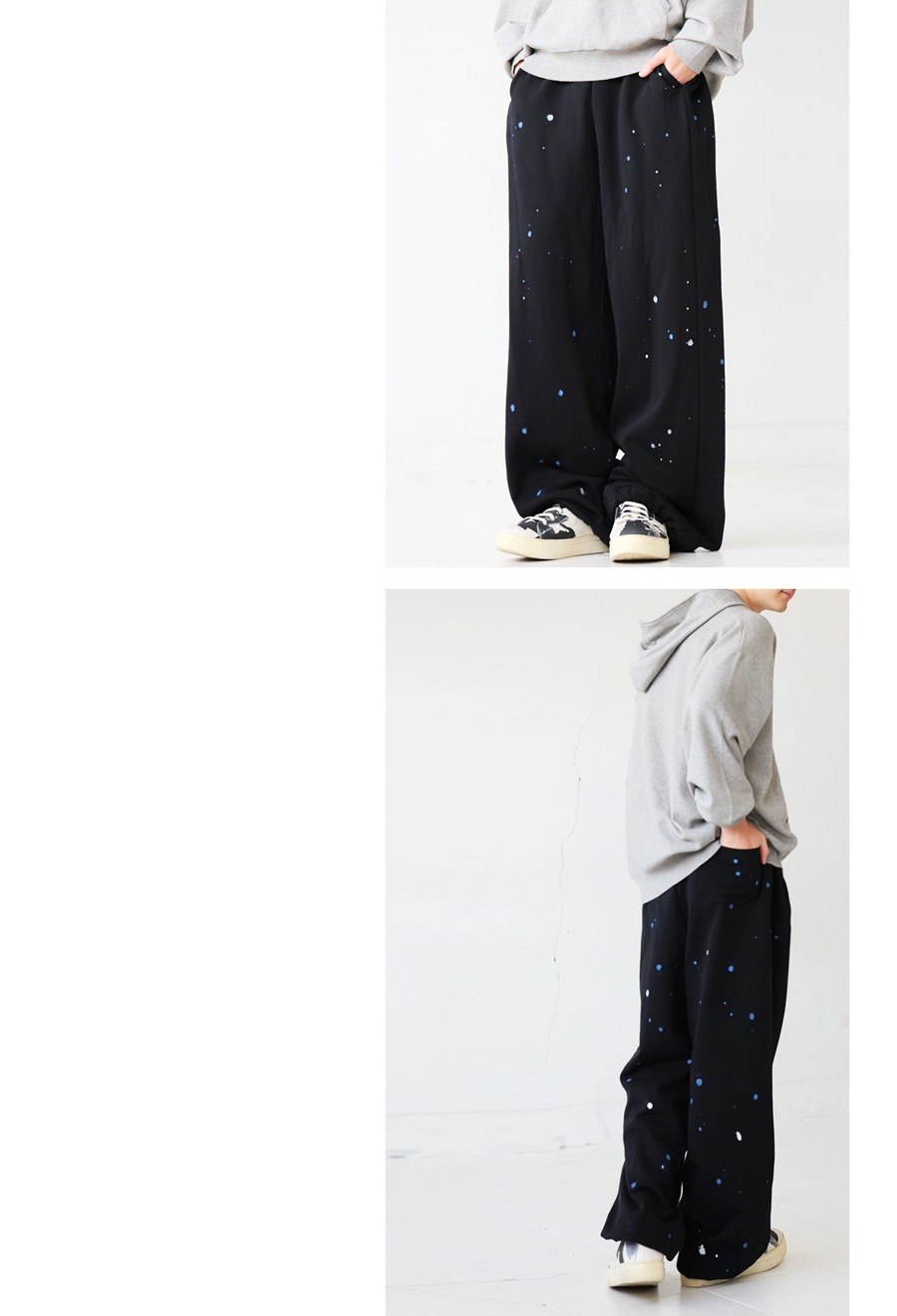 個性的な手描きペイントが映えるワイドシルエットのスウェットパンツです。