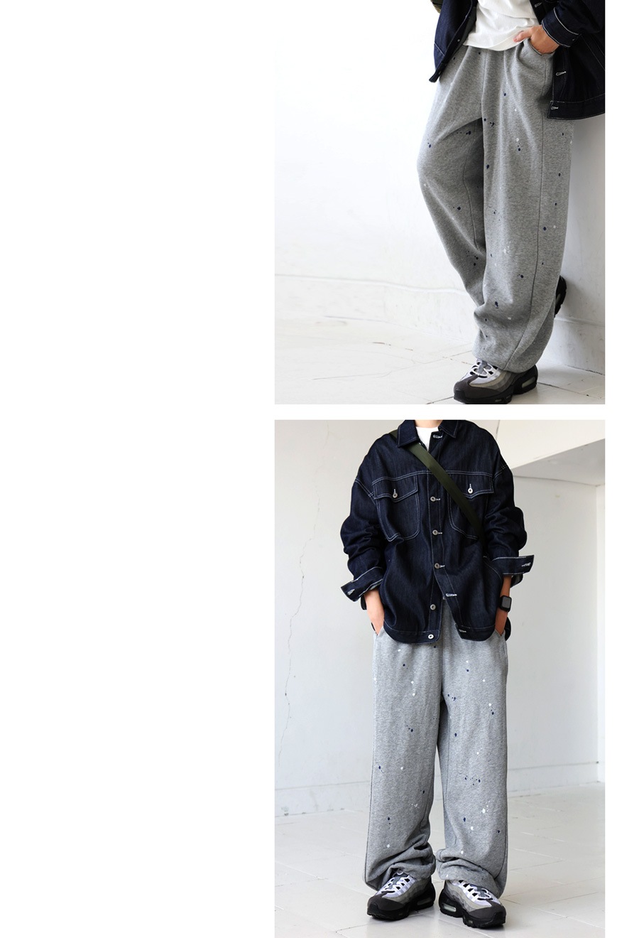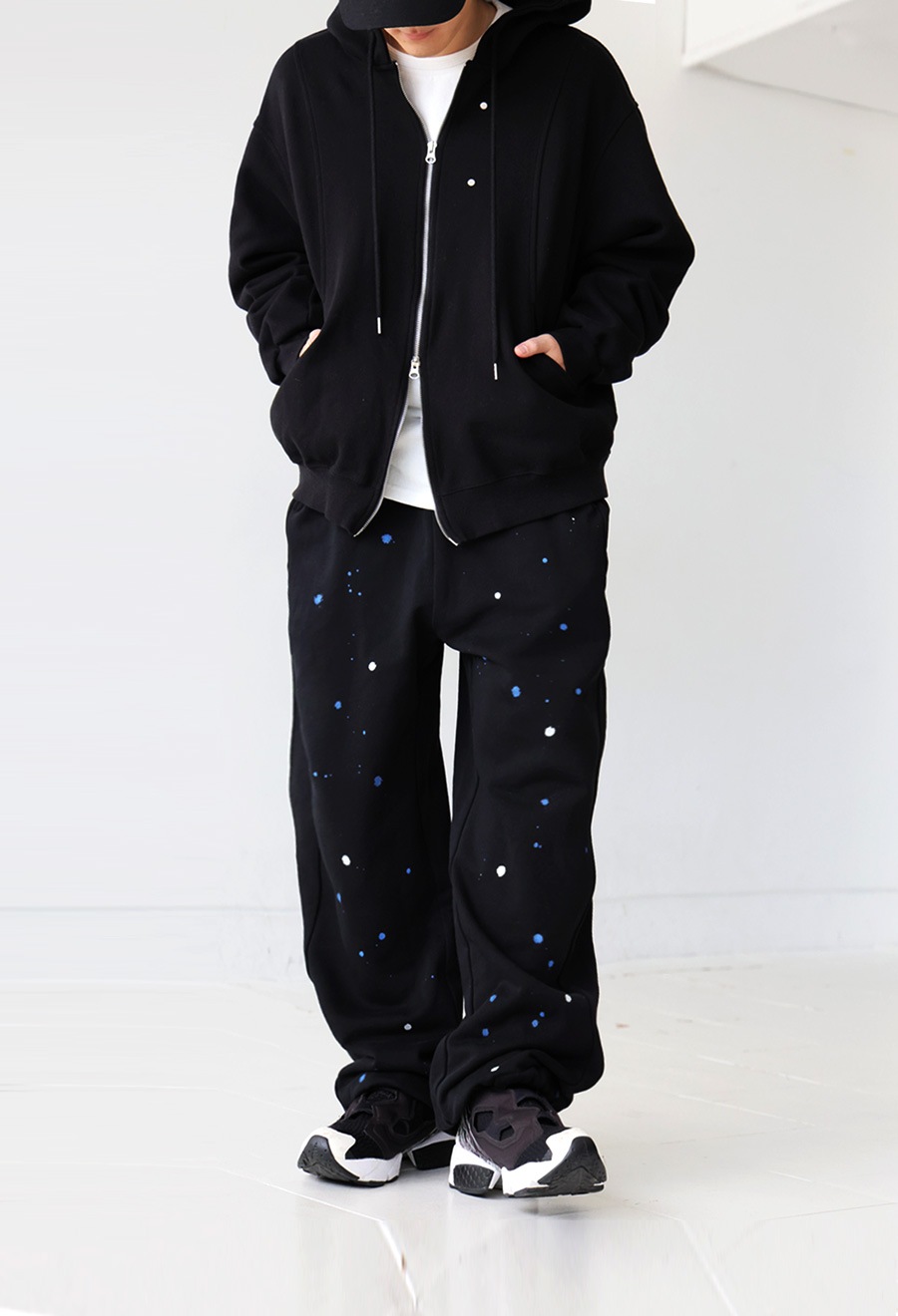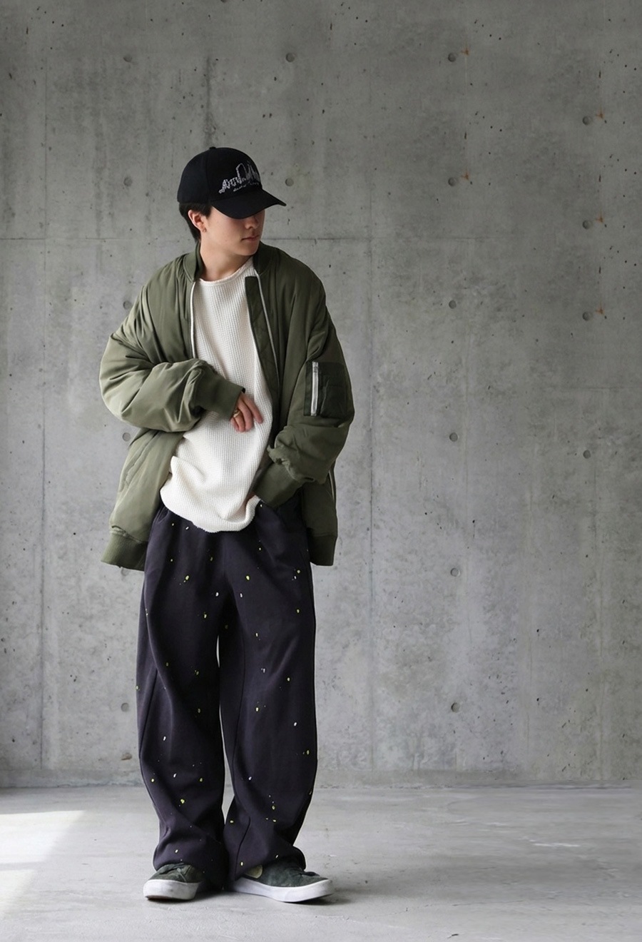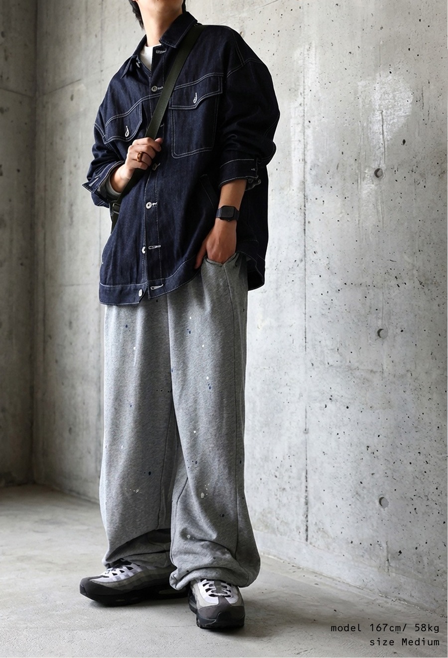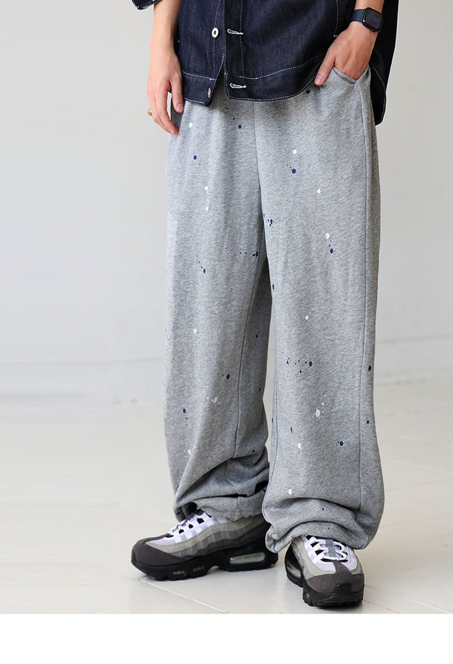 個性的な手描きペイントが映えるワイドシルエットのスウェットパンツです。