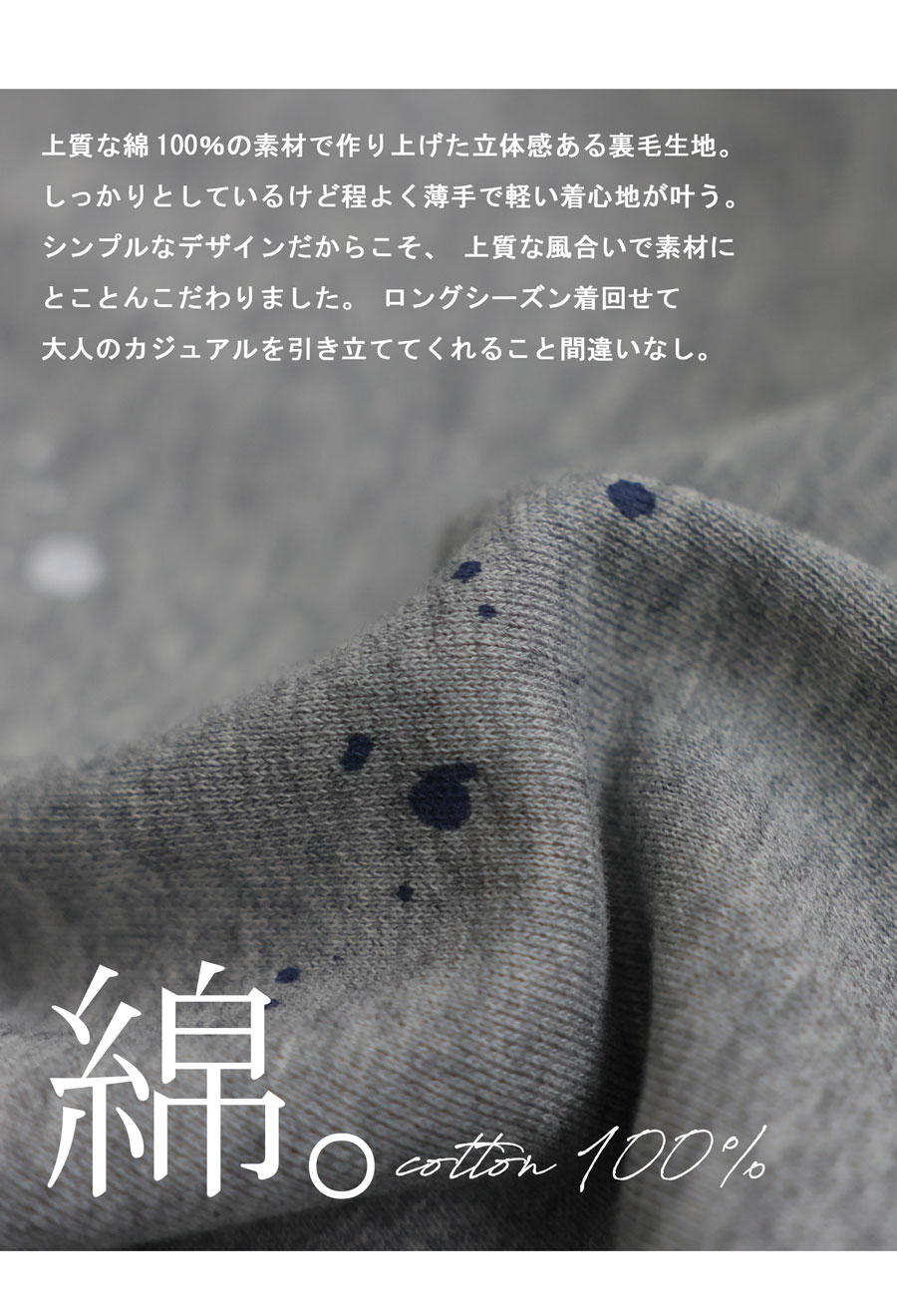 裏毛仕様の綿100%(コットン)素材を使用し、柔らかく肌当たりが良く快適に着用できます。
