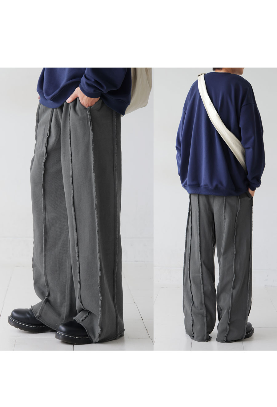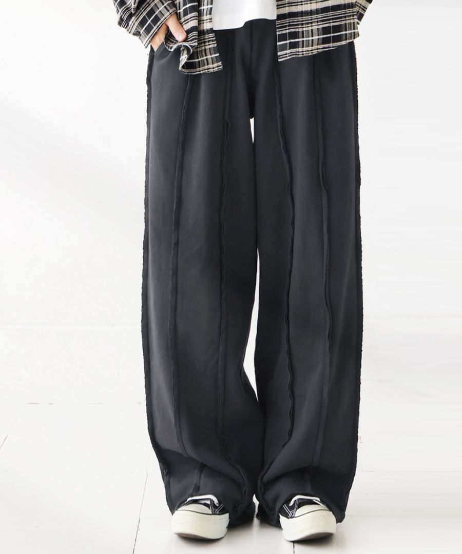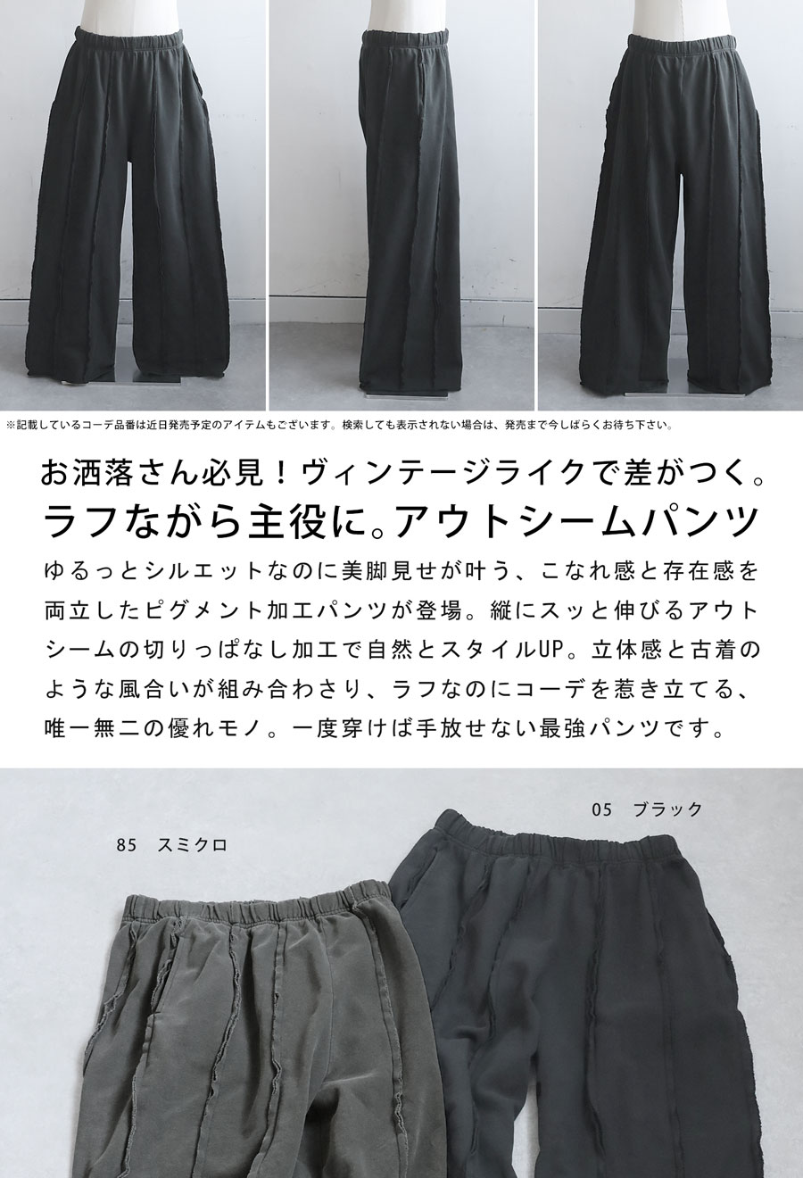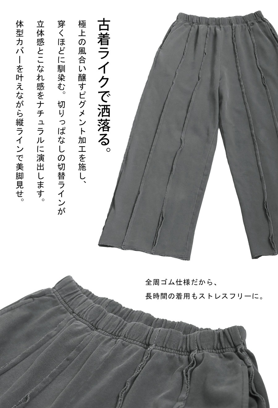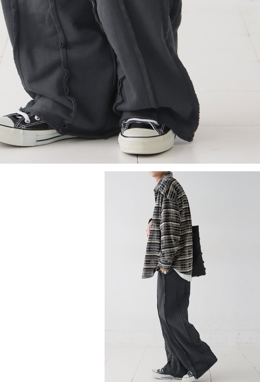 縦の切り替えライン(アウトシーム)と切りっぱなしの裾がアクセントになり、ヴィンテージ感のある古着風の仕上がりに。