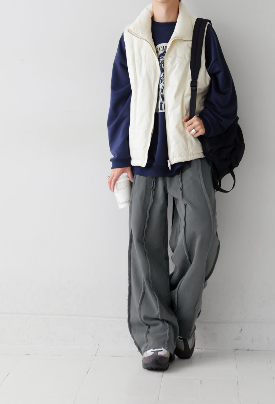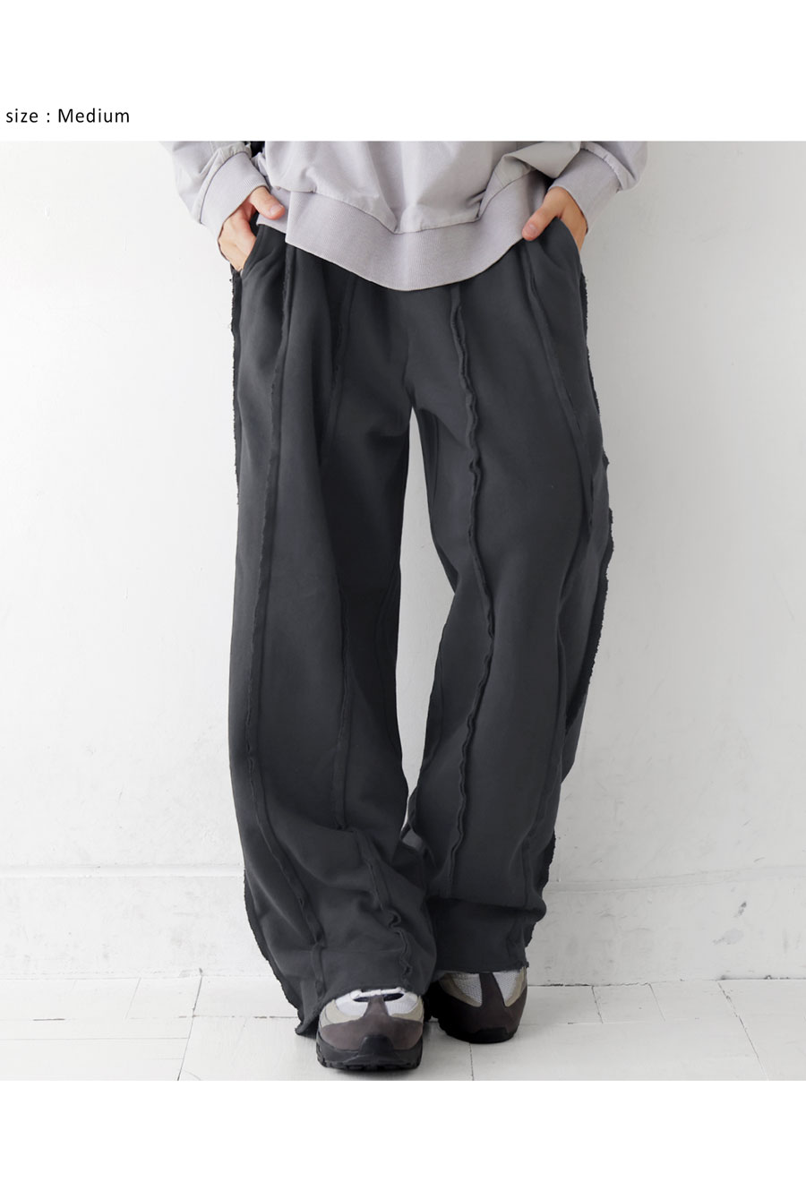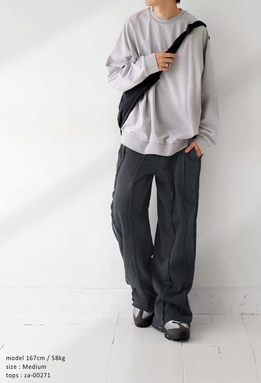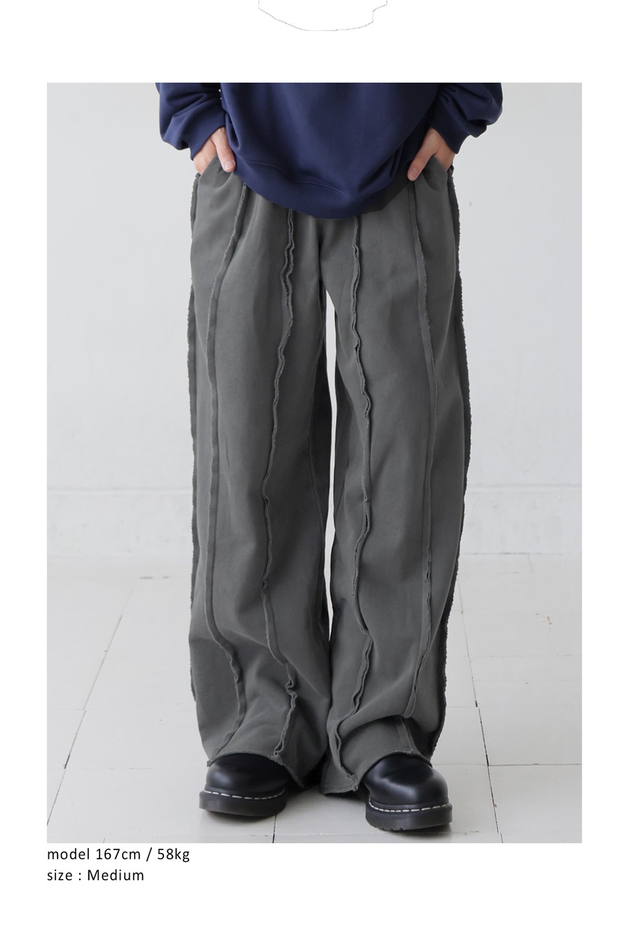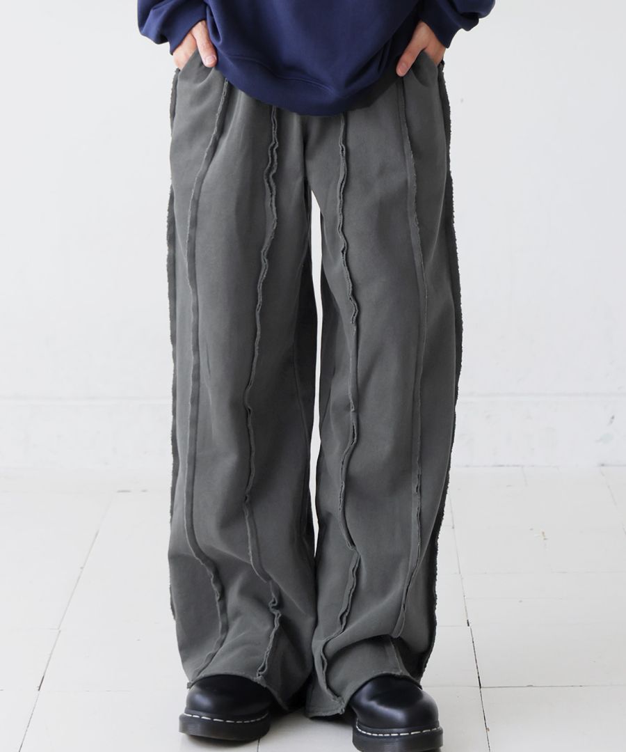 縦の切り替えライン(アウトシーム)と切りっぱなしの裾がアクセントになり、ヴィンテージ感のある古着風の仕上がりに。