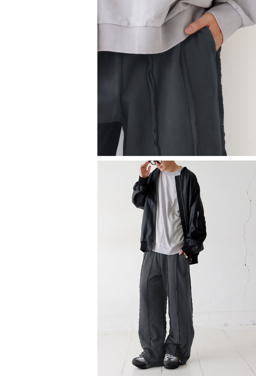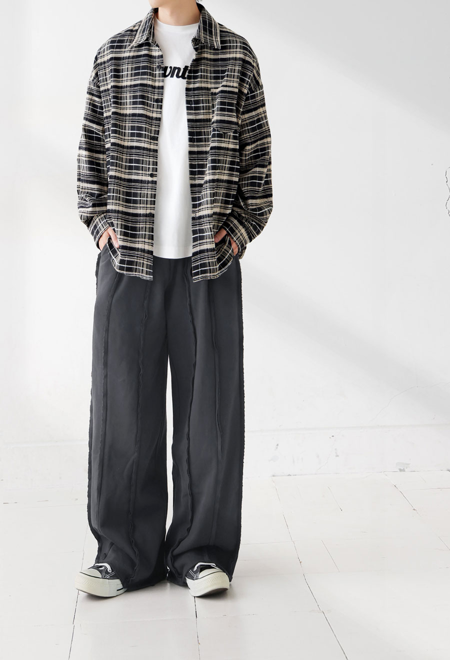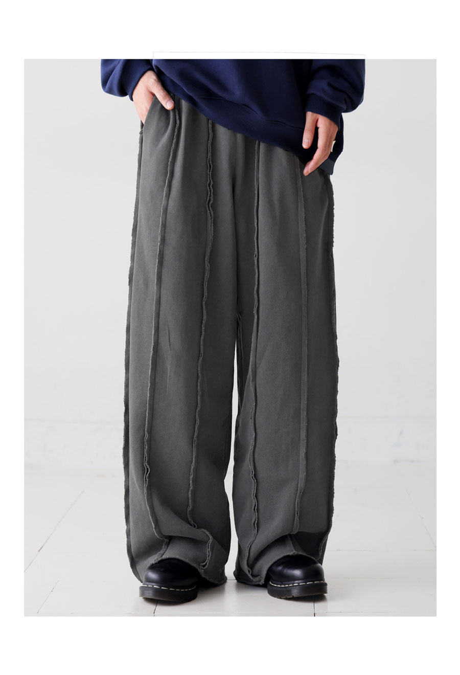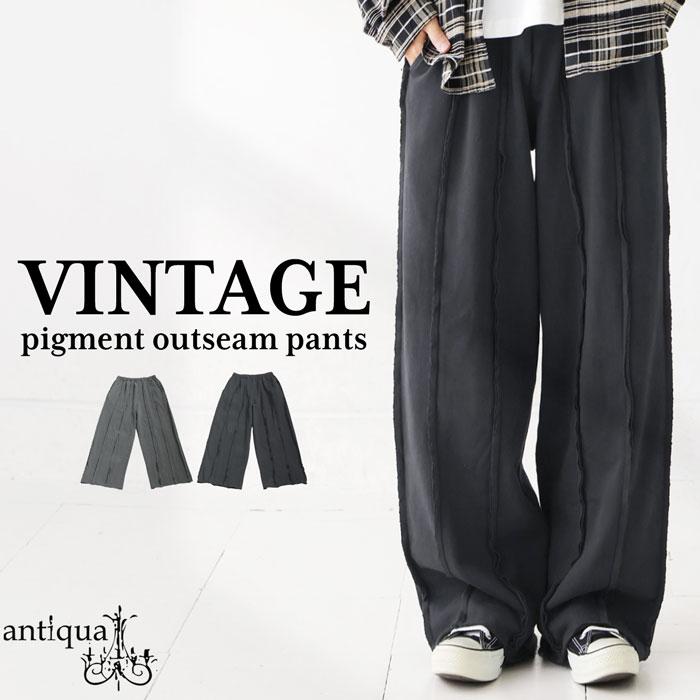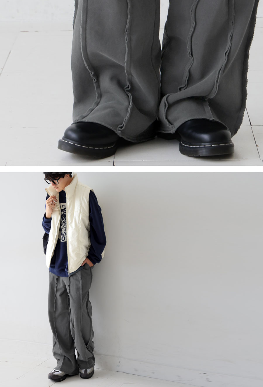 縦の切り替えライン(アウトシーム)と切りっぱなしの裾がアクセントになり、ヴィンテージ感のある古着風の仕上がりに。