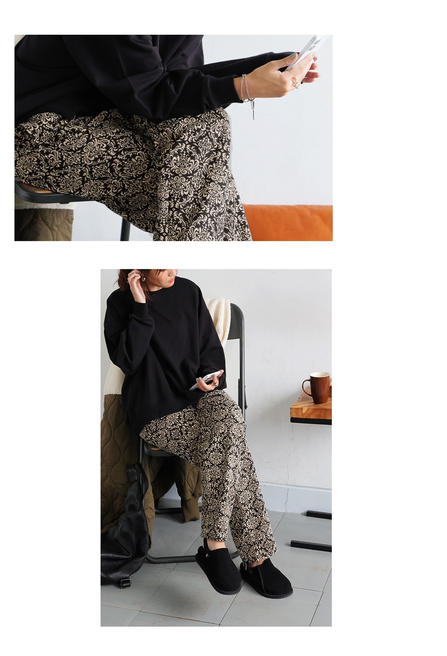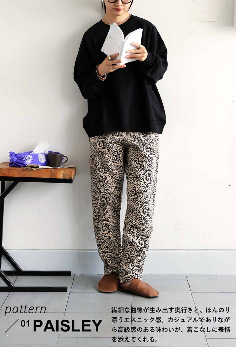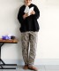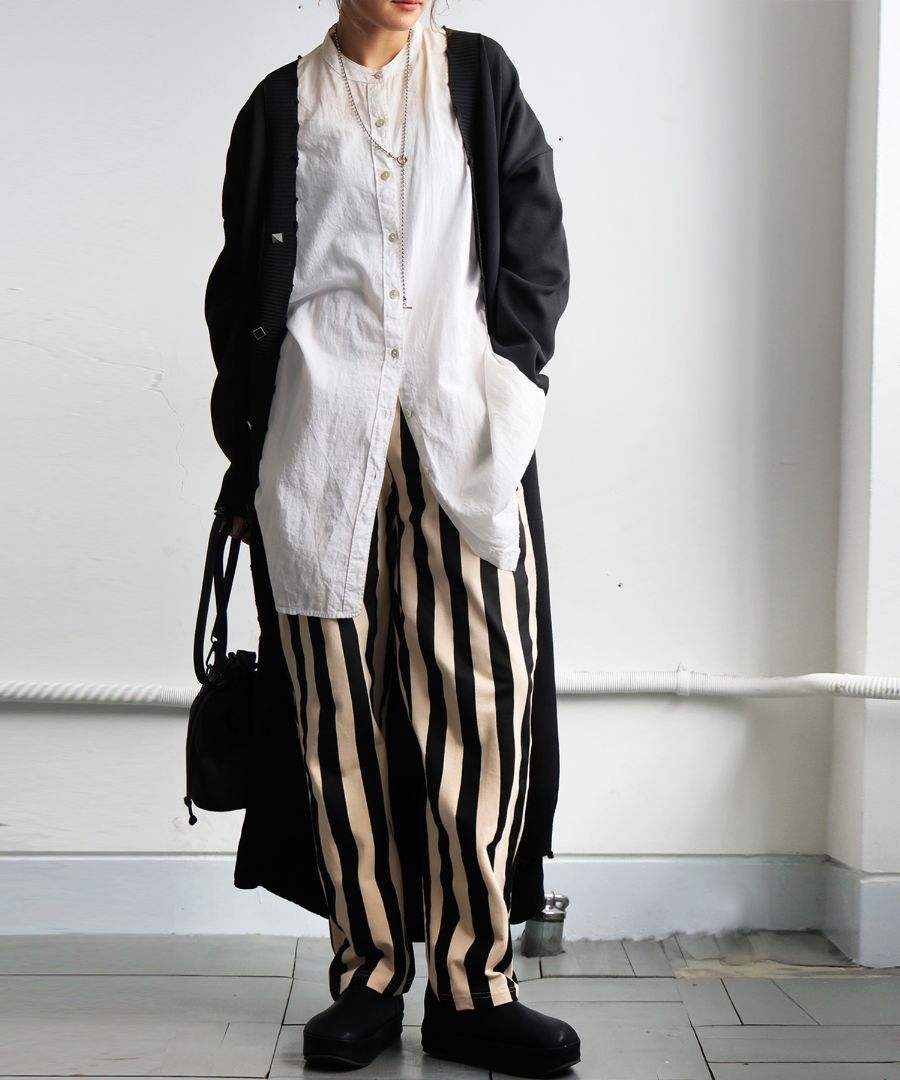 ボトムスはウエストゴム仕様のゆるやかなテーパード形状で、太もも周りはゆったり、裾にかけてすっきりとした丈感に仕上げました。