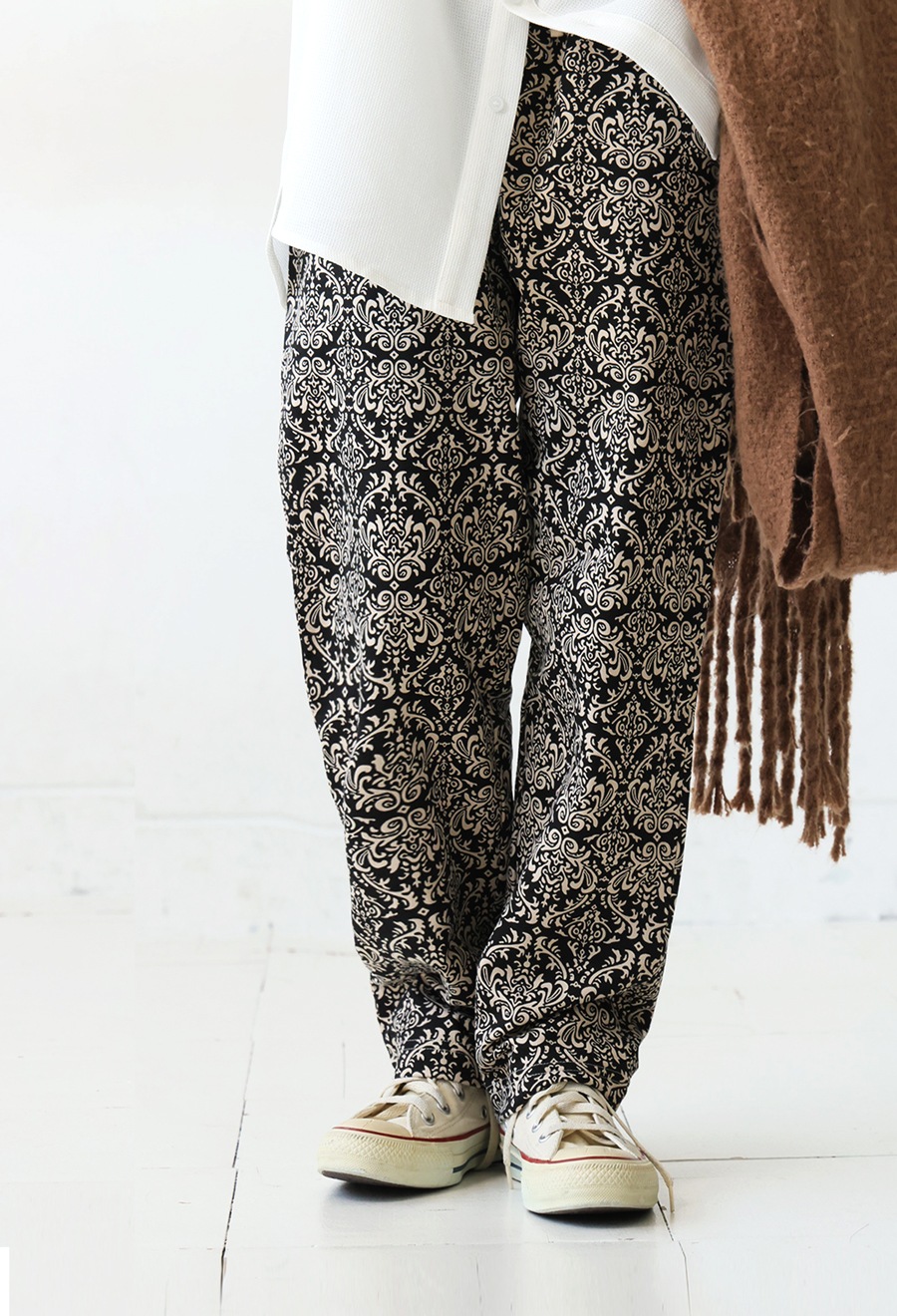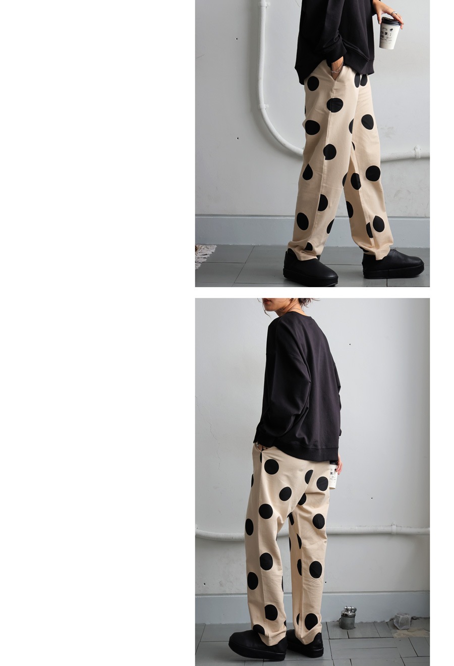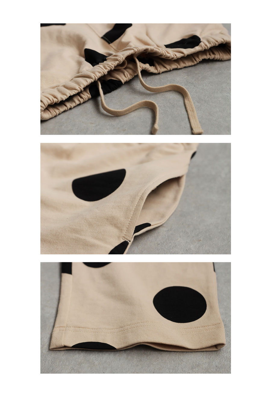 ボトムスはウエストゴム仕様のゆるやかなテーパード形状で、太もも周りはゆったり、裾にかけてすっきりとした丈感に仕上げました。