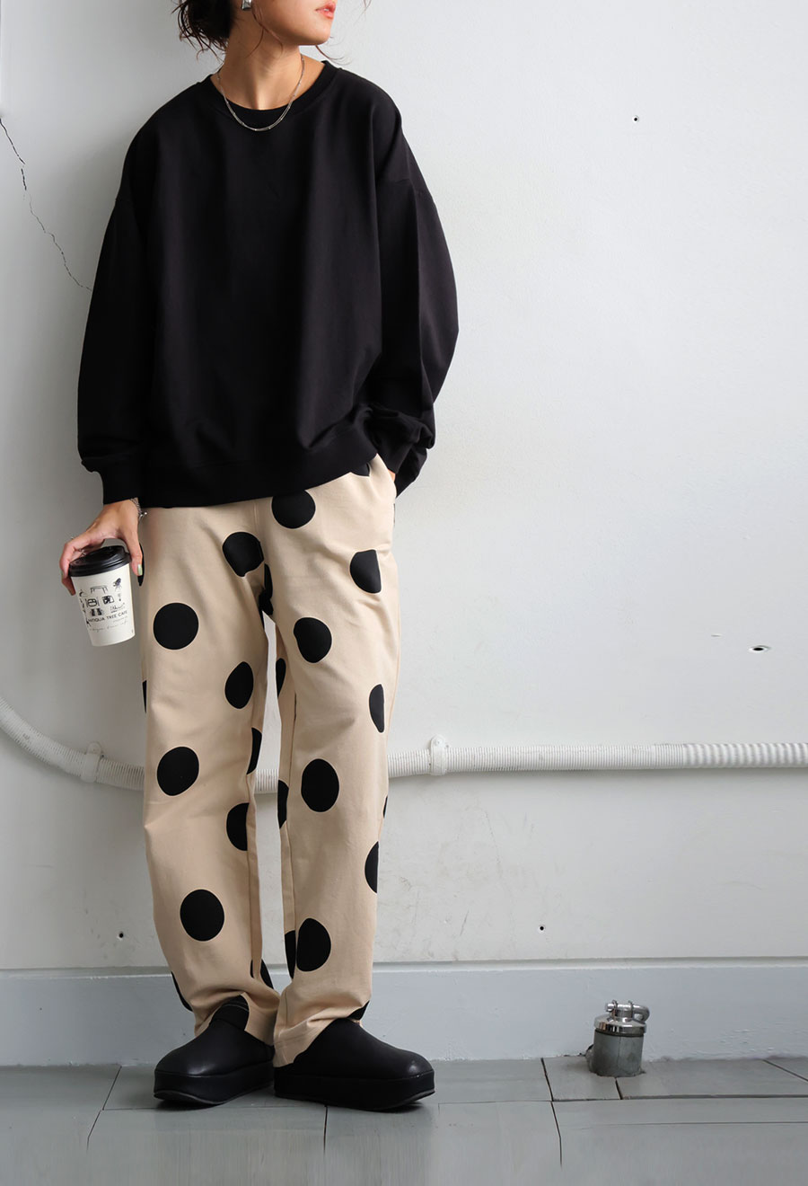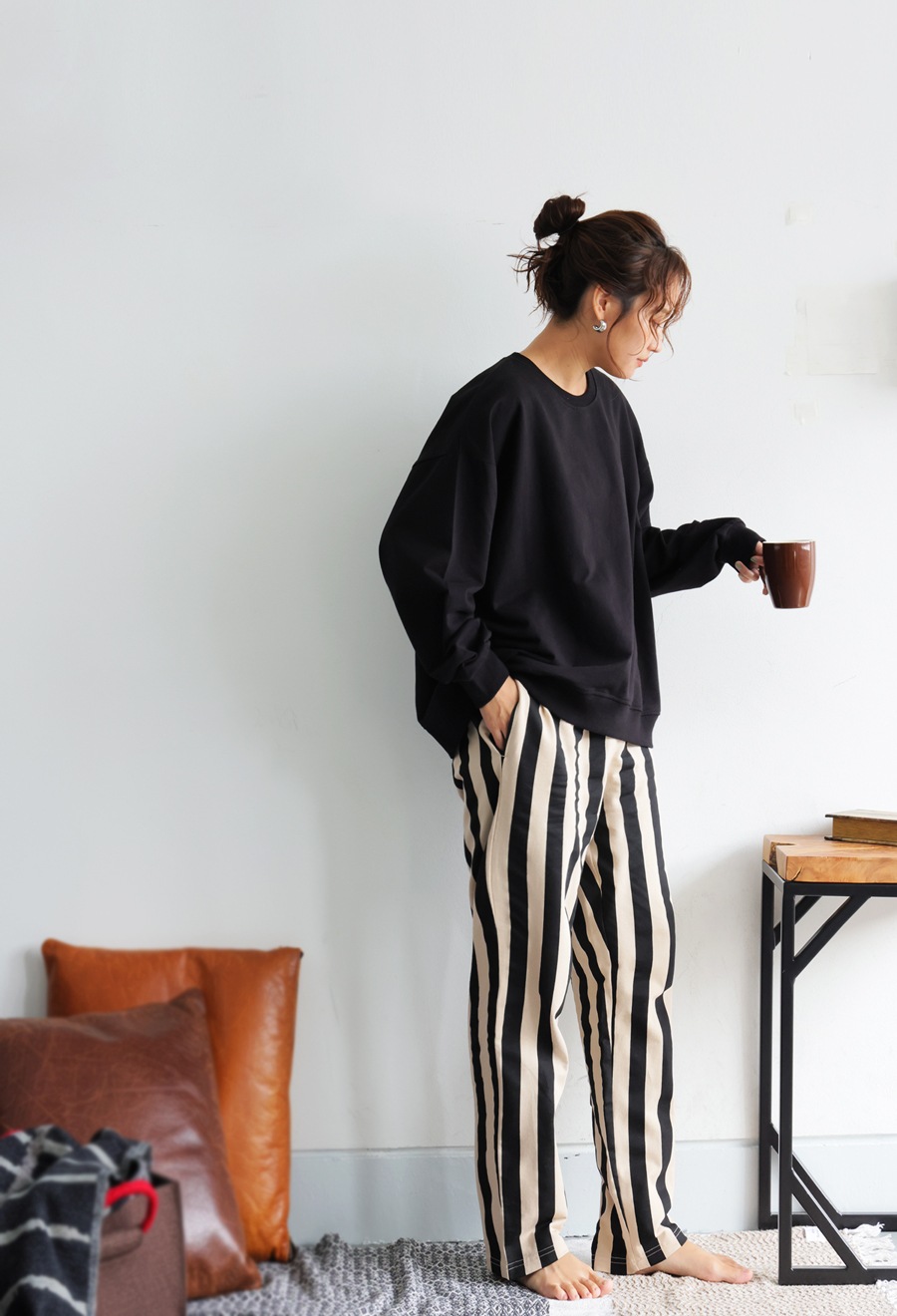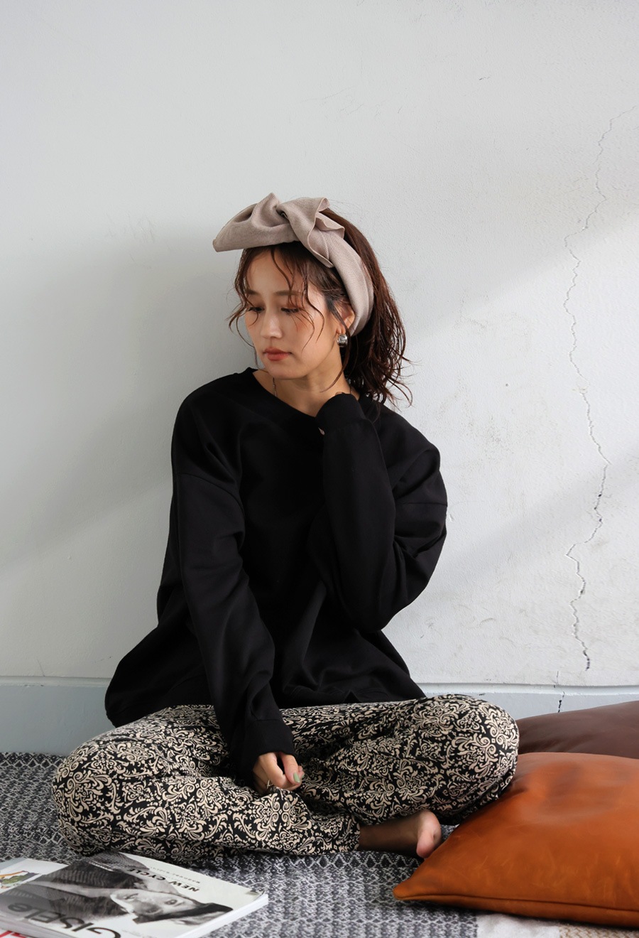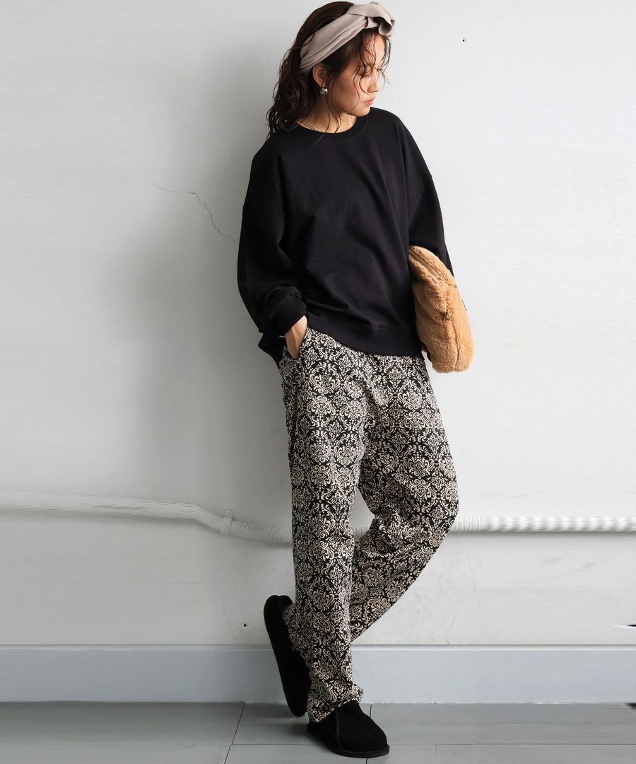 トップスはベーシックなクルーネックで首元を程よくカバーし、長袖仕様で着心地も抜群。
