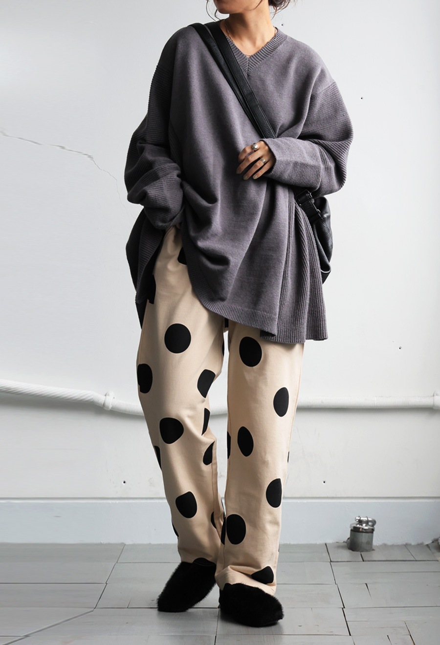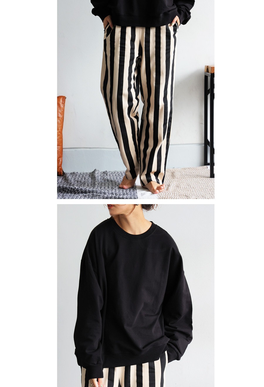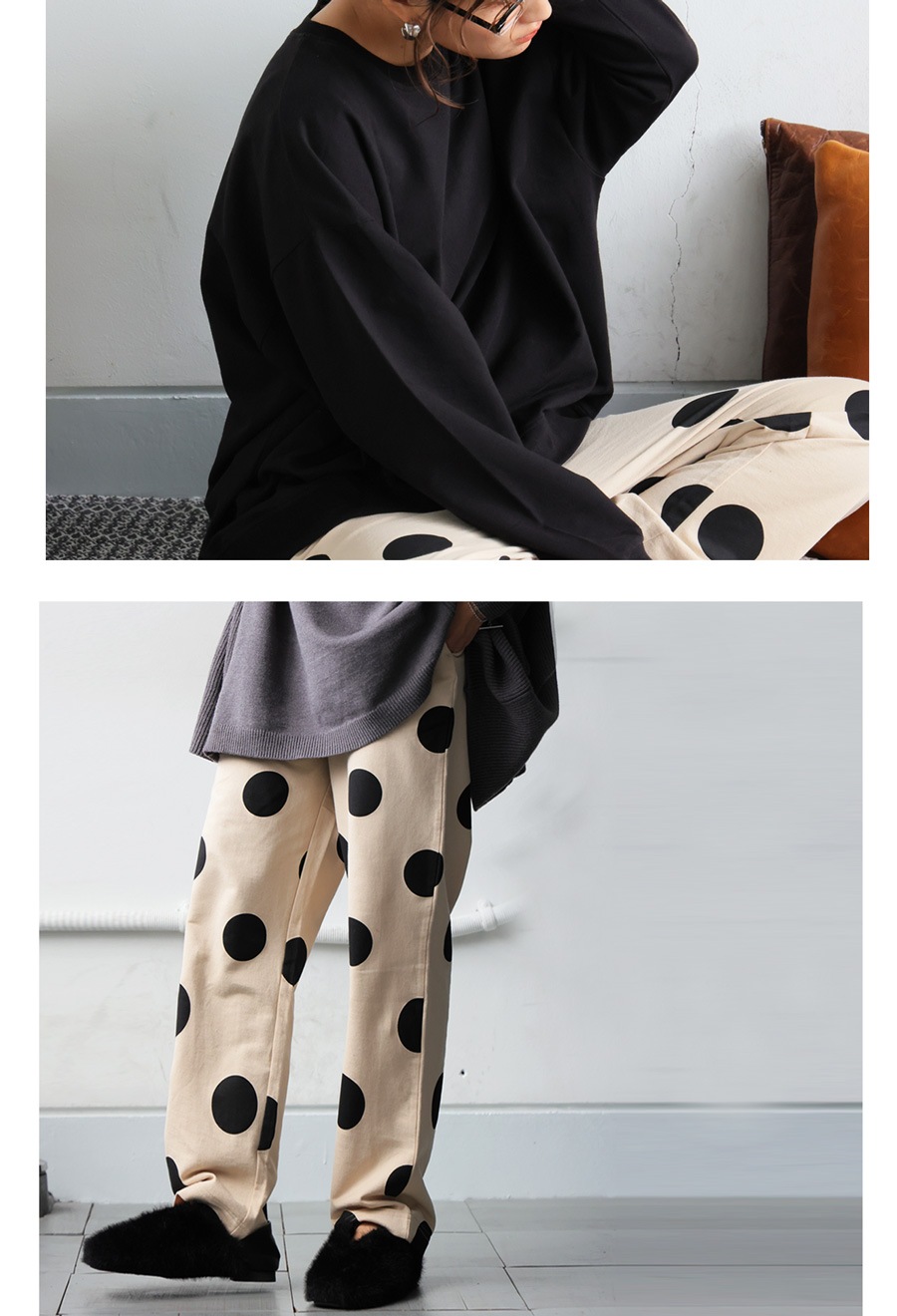 トップスはベーシックなクルーネックで首元を程よくカバーし、長袖仕様で着心地も抜群。