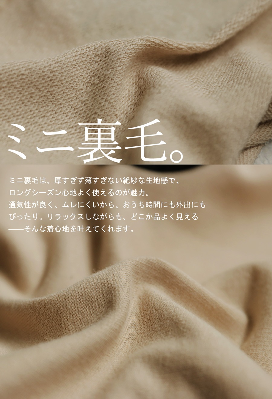綿100%(コットン)のミニ裏毛素材を採用し、厚すぎず薄すぎない絶妙な生地感で、通気性がよくムレにくく、ロングシーズン快適に着られます。