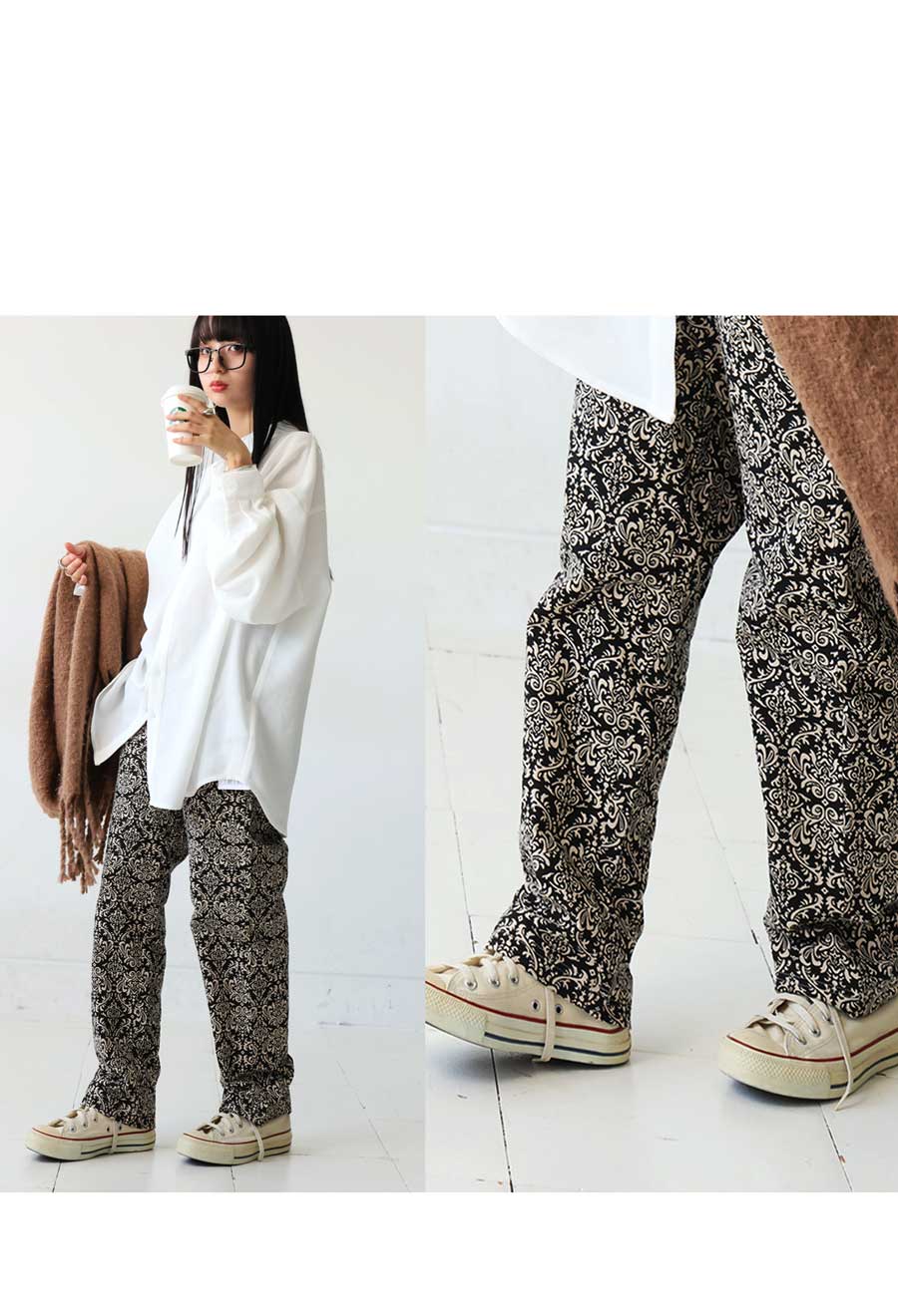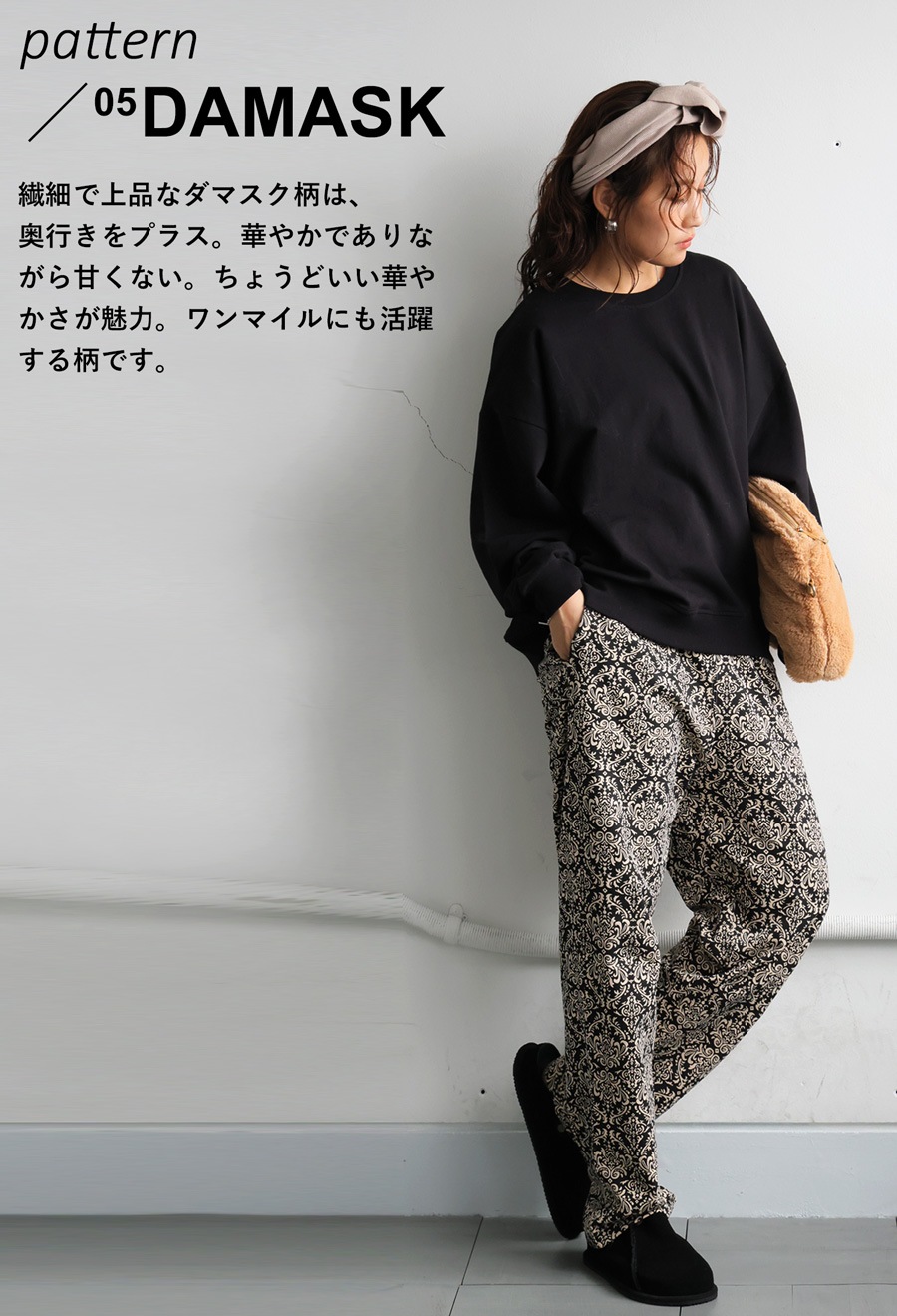 カラーはベージュ×ブラックのドット(ベージュ・黒・ブラック)、ナチュラル×ブラックのダマスク(生成り・黒・ブラック)、生成りベースのペイズリー(アイボリー・ブラック・黒)、ベージュ×ブラックのストライプ(ベージュ・黒・ブラック)の4柄展開です。