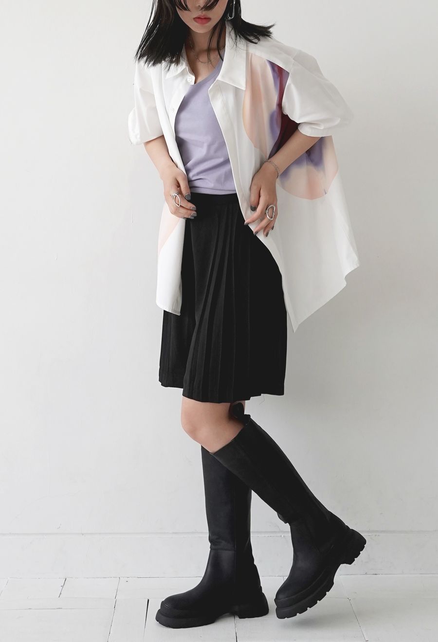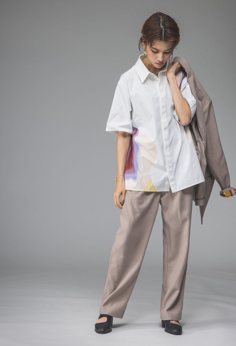 落ち着いたトーンに仕上げたアート柄が、大人のモードな着こなしにフィット。