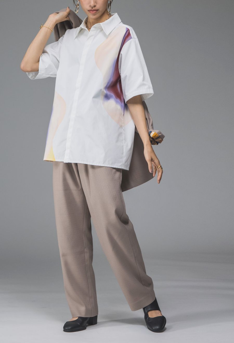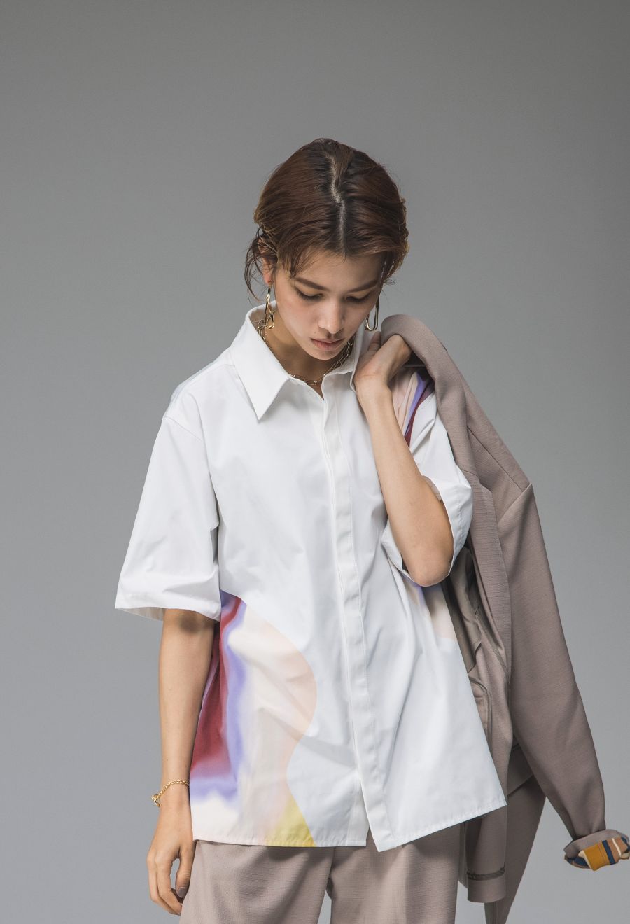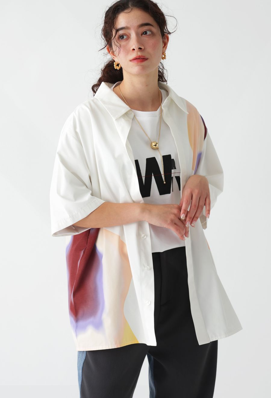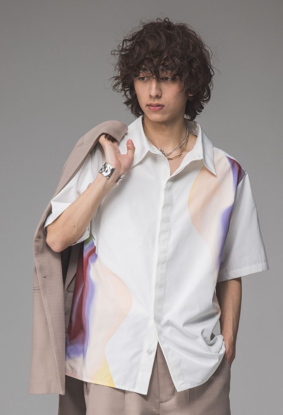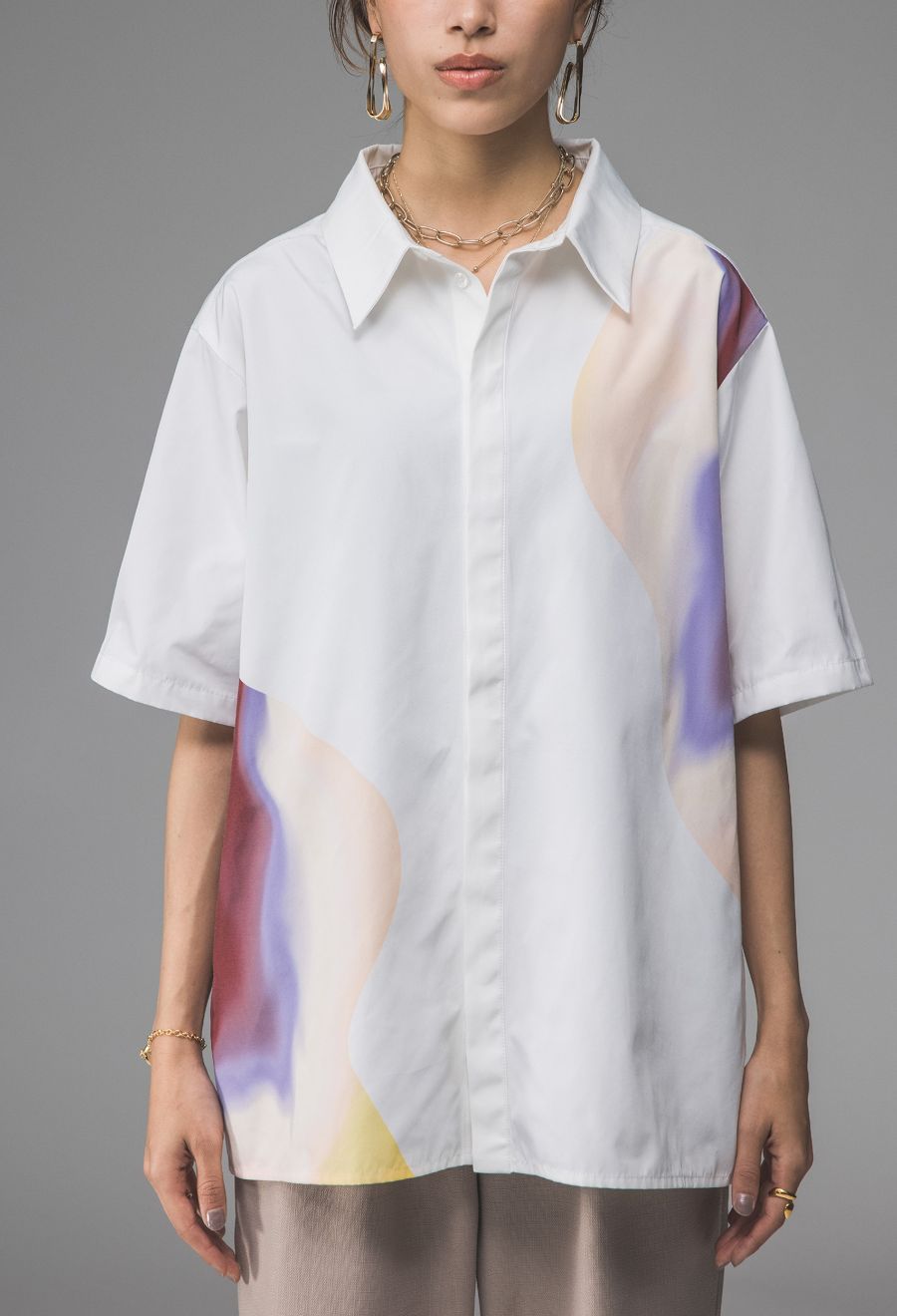 流れるようなウェーブ柄が視線を惹きつける、感度高めなオーバーサイズのレギュラーカラーシャツです。