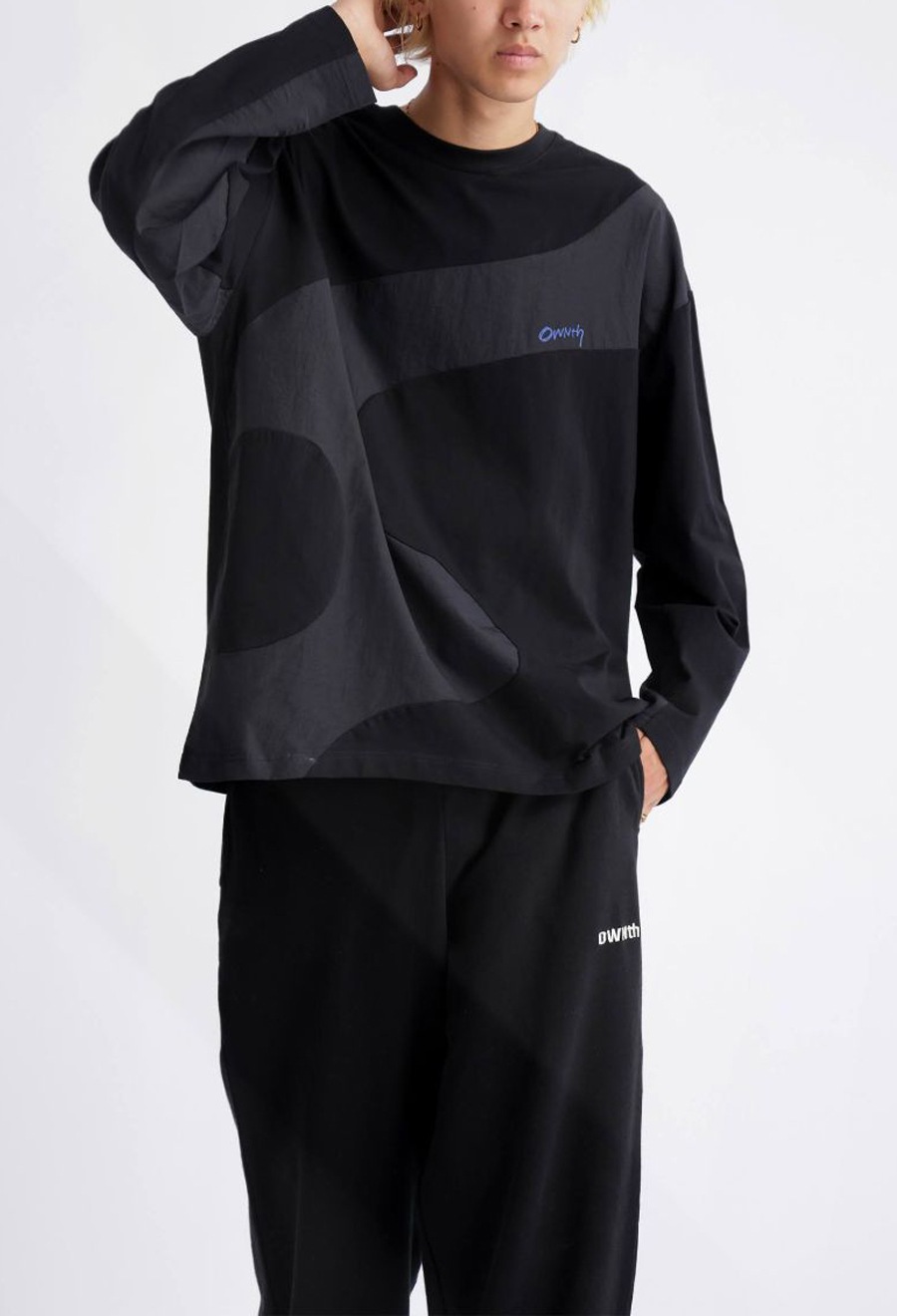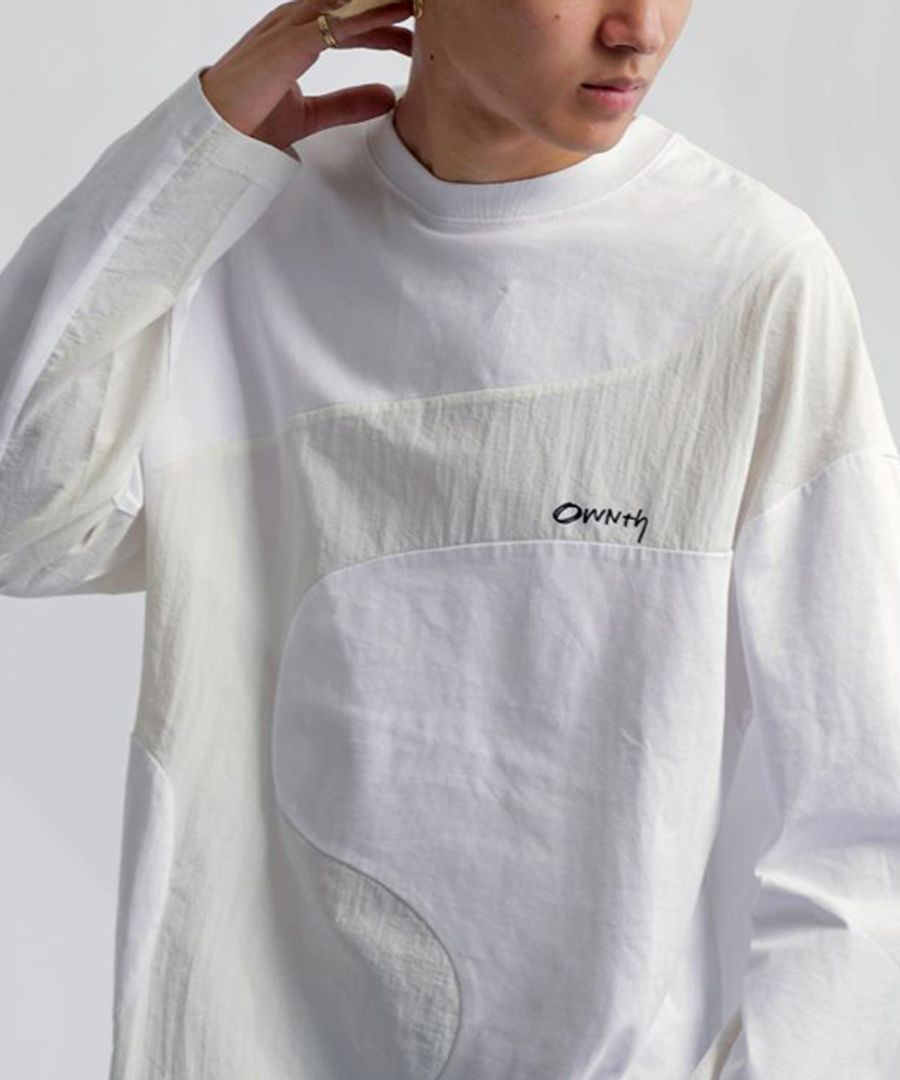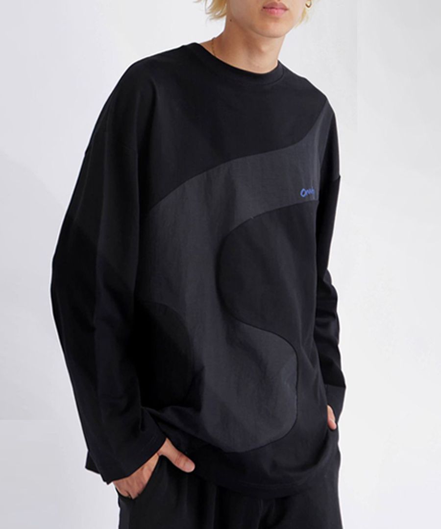 大胆なウェーブラインが印象的な、異素材ドッキングのロングスリーブTシャツ。