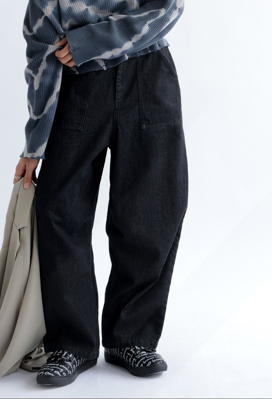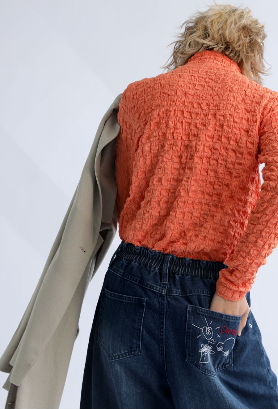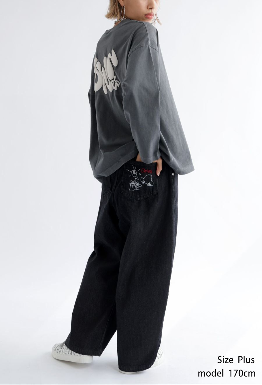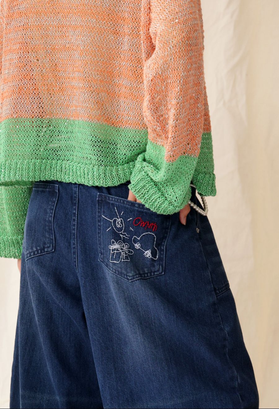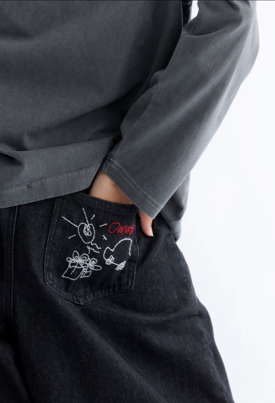 後ろポケットには、デザイナーによる刺繍イラストをあしらい、シンプルな中に遊び心をプラス。