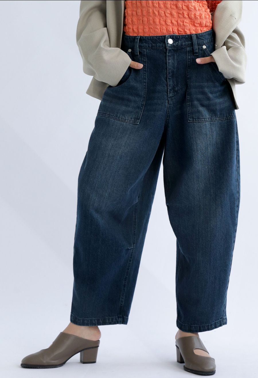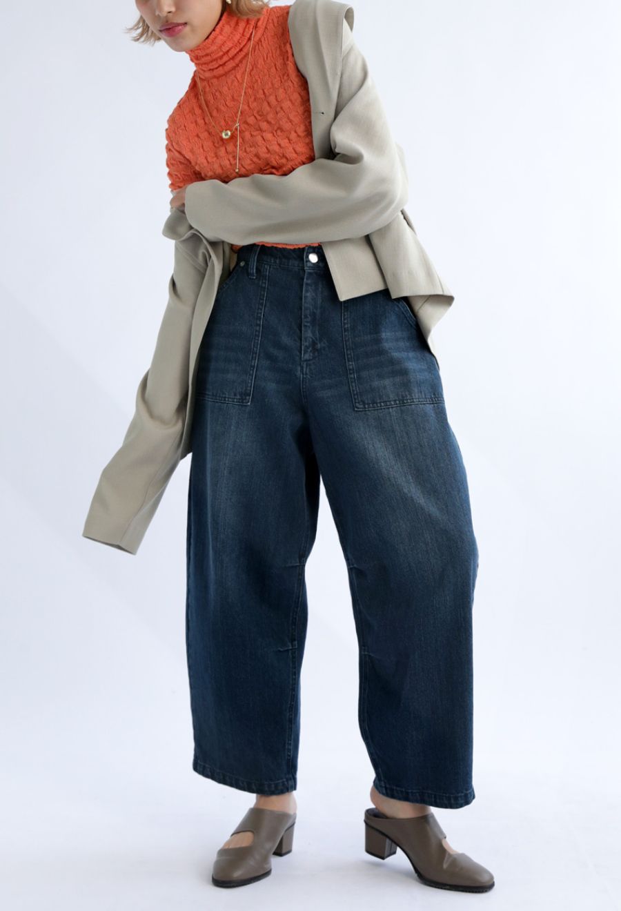 穿くだけで雰囲気のある着こなしが決まる綿100%のデニムバレルレッグパンツ。