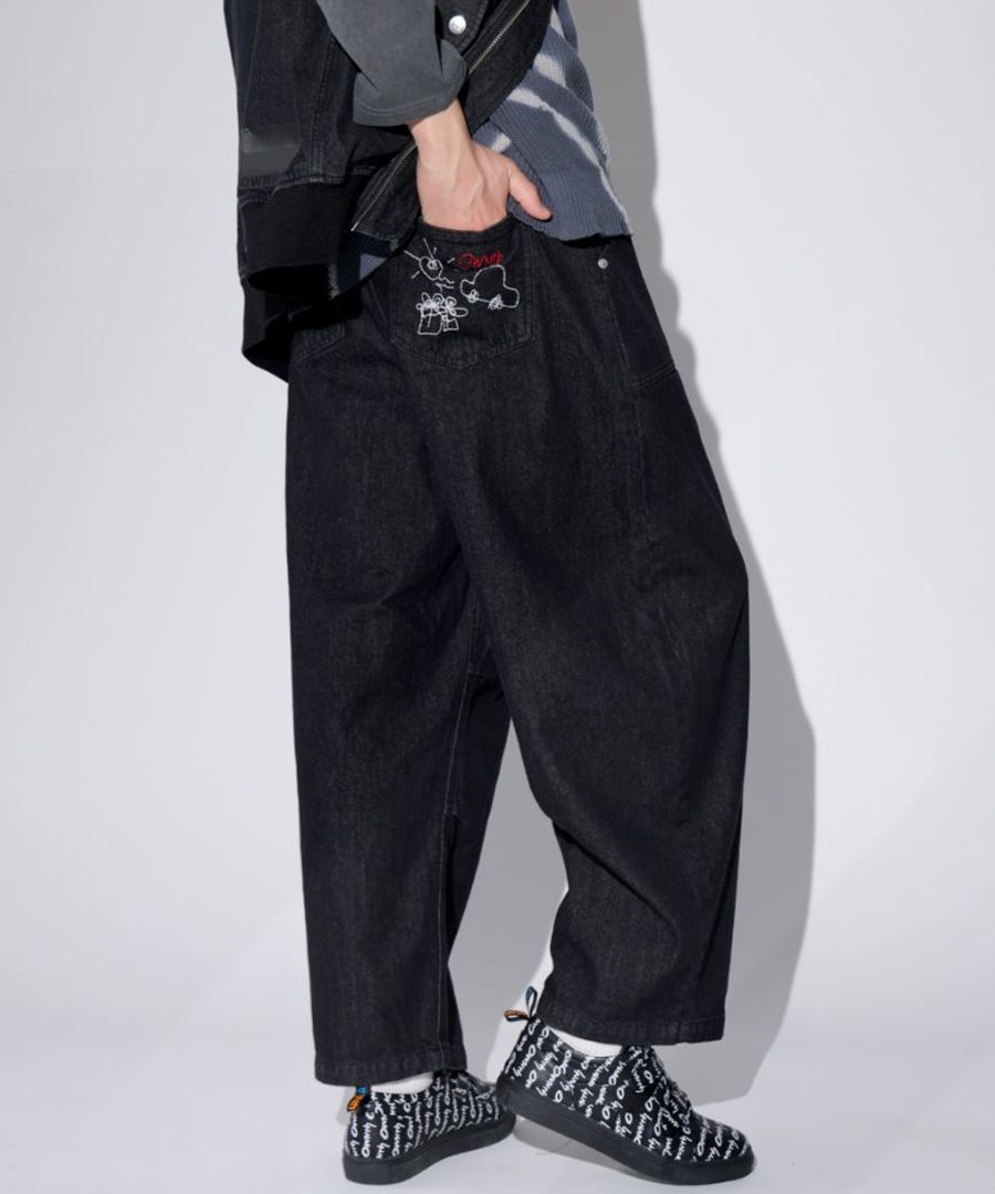 【クリアランスバーゲン30%OFF!4日10時迄】刺繍デザイン デニム バレルパンツ メンズ 綿100・メール便不可(返品・キャンセル・交換不可)