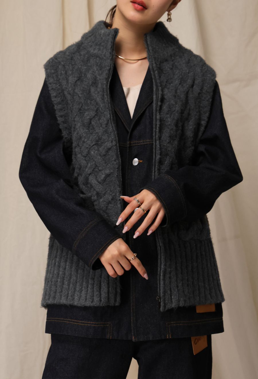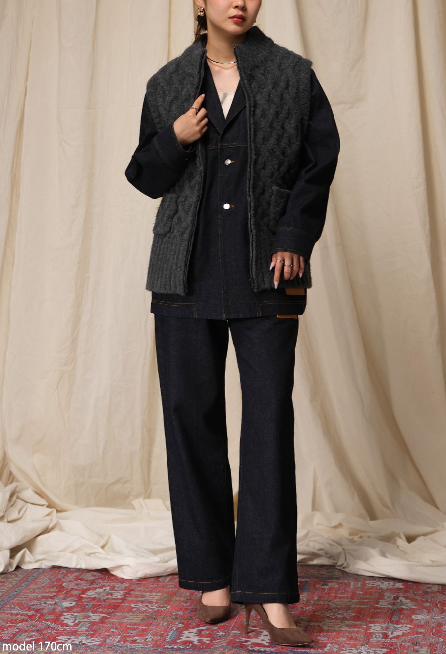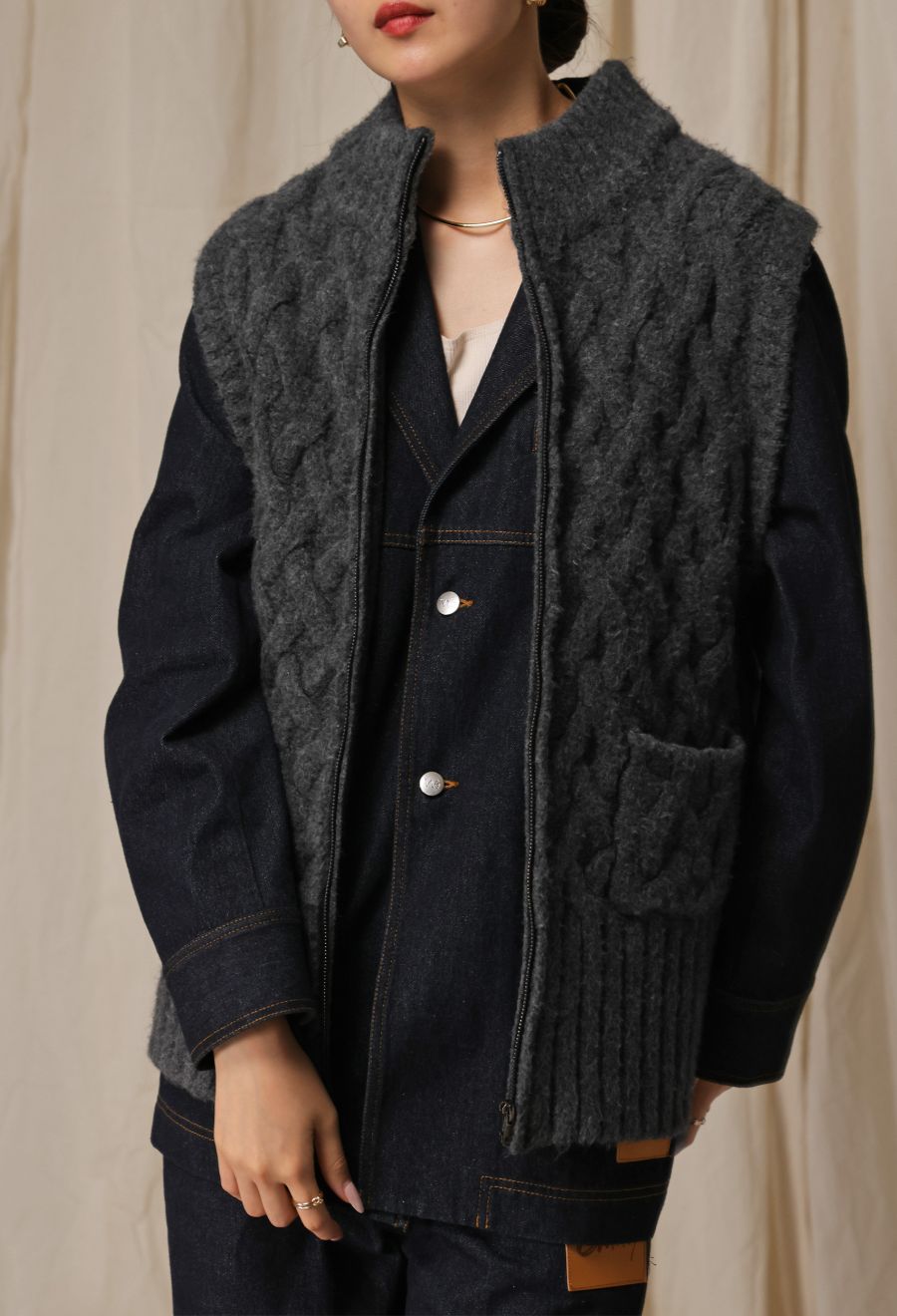どちらもベーシックで合わせやすく、秋冬の重ね着にひとつあると便利な1枚です。