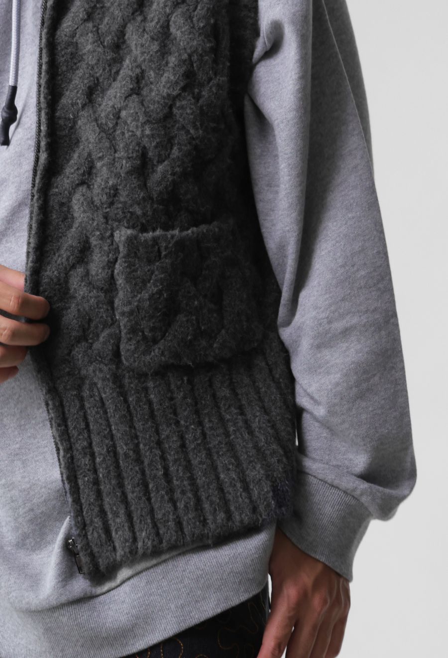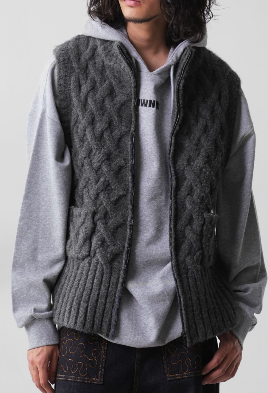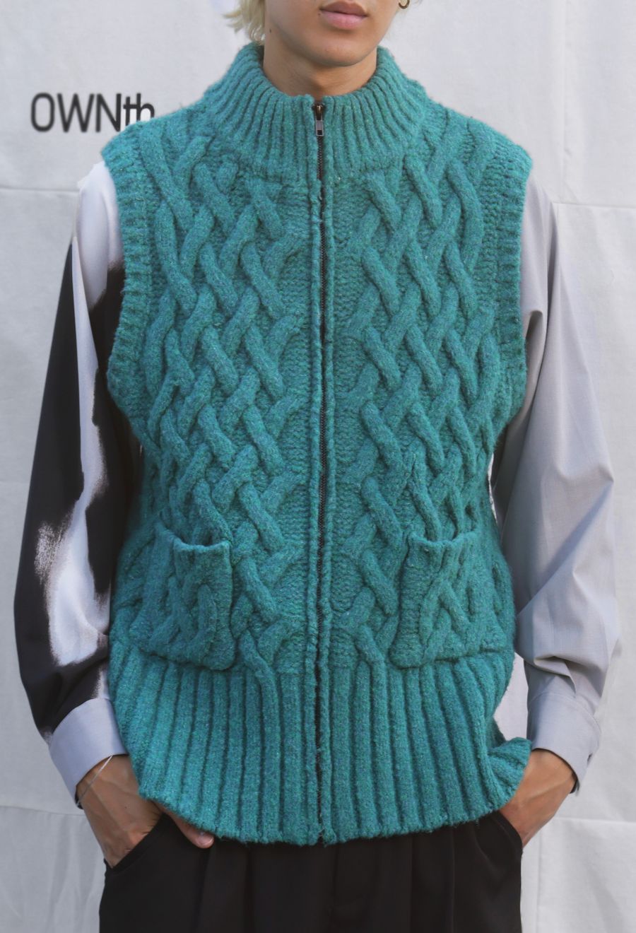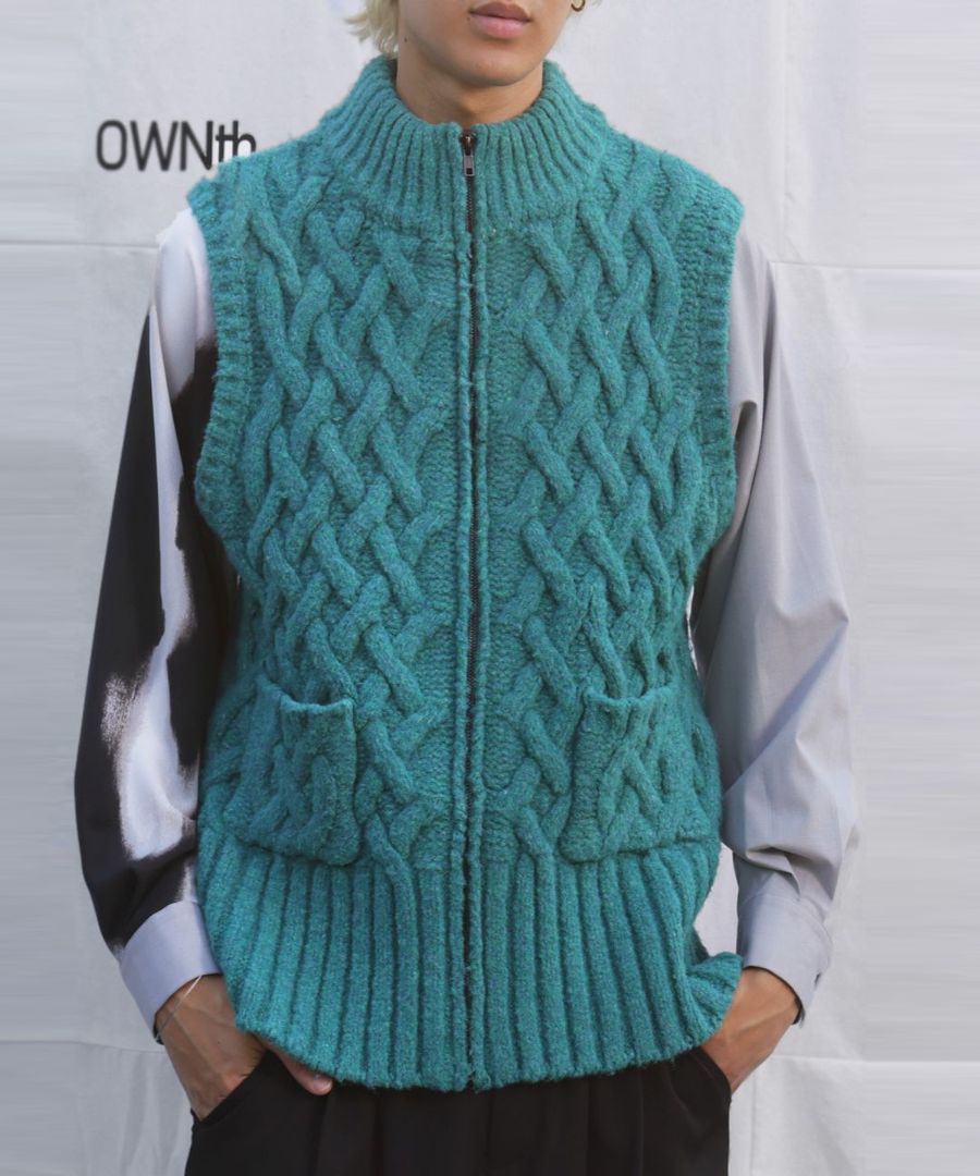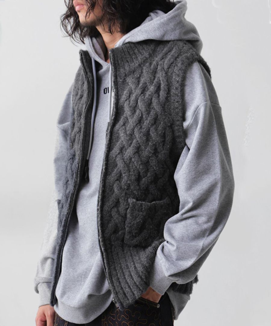 立体的な籠編み風デザインが印象的な、レイヤードコーデに映えるユニセックス仕様のニットベストです。