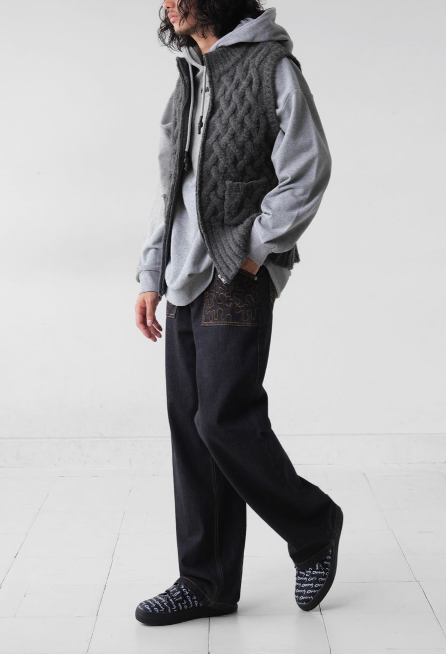 袖ぐりは広めで、ロンTやシャツ、スウェットなどを中に重ねやすいノースリーブ仕様。