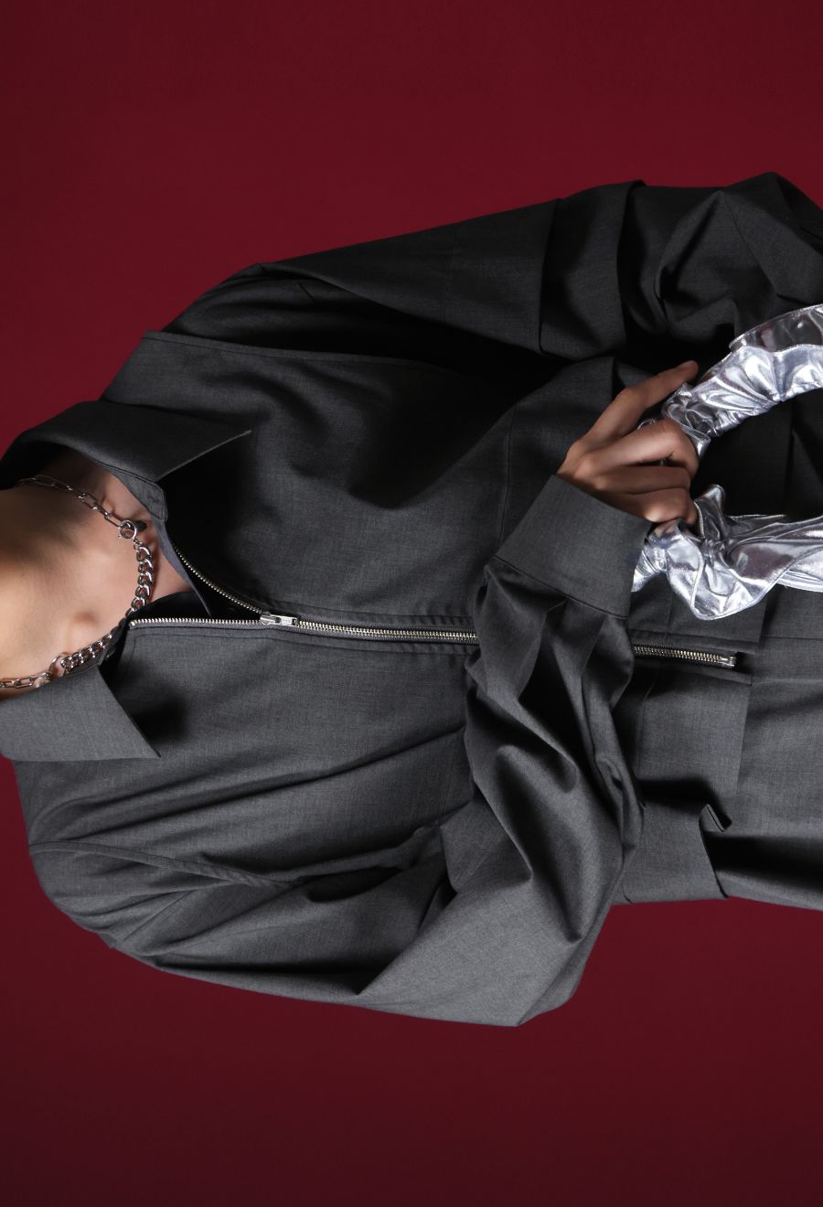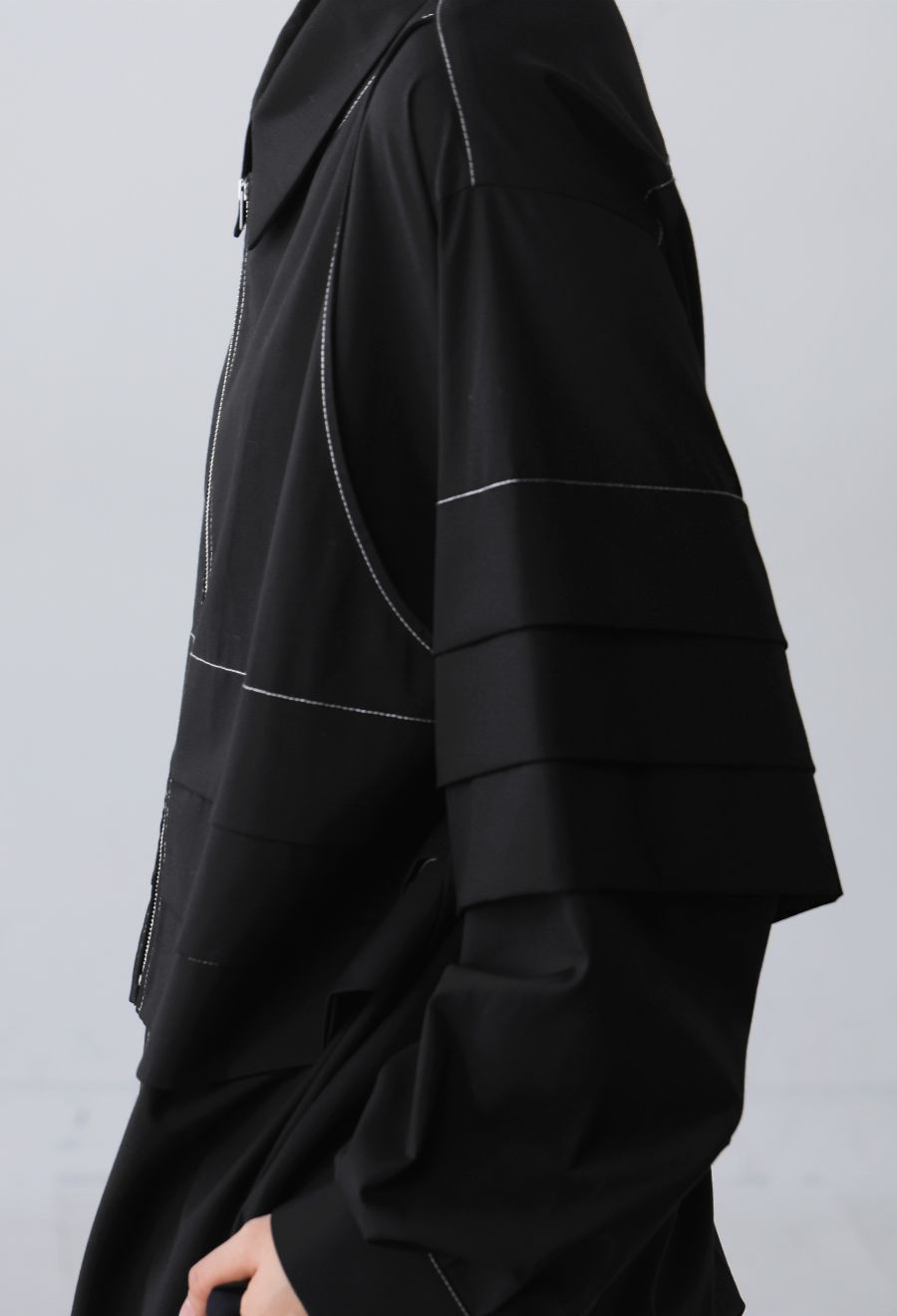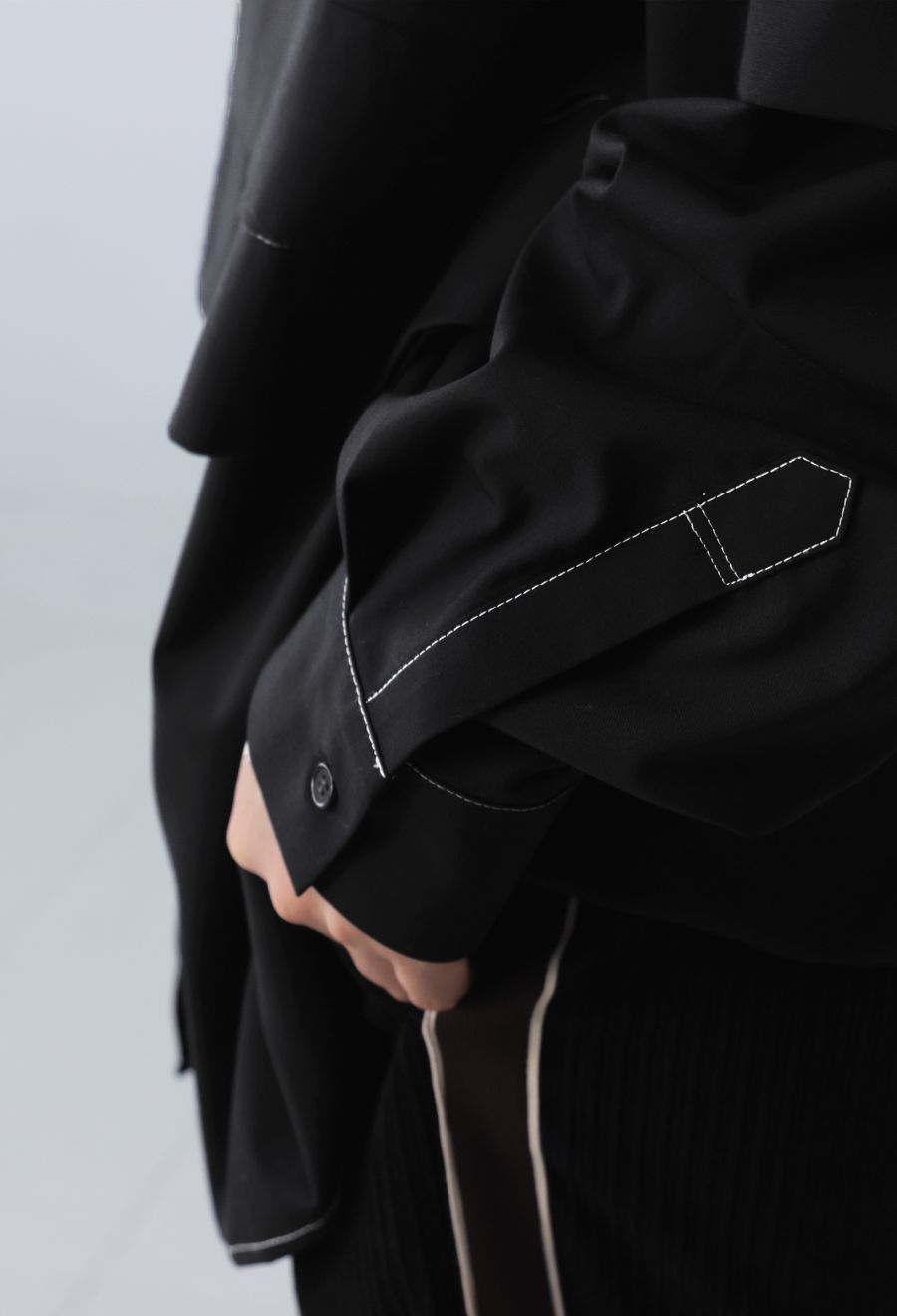 ネックラインはレギュラーカラーで、モードな雰囲気を保ちながらも、程よく力の抜けたおしゃれな印象に。