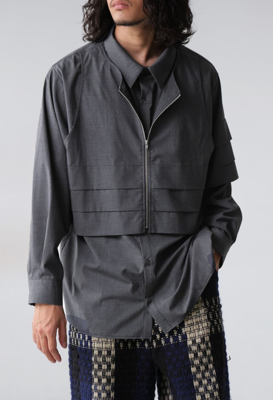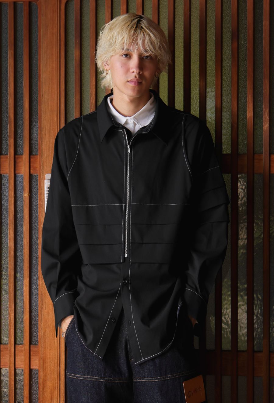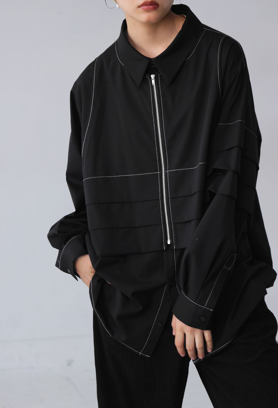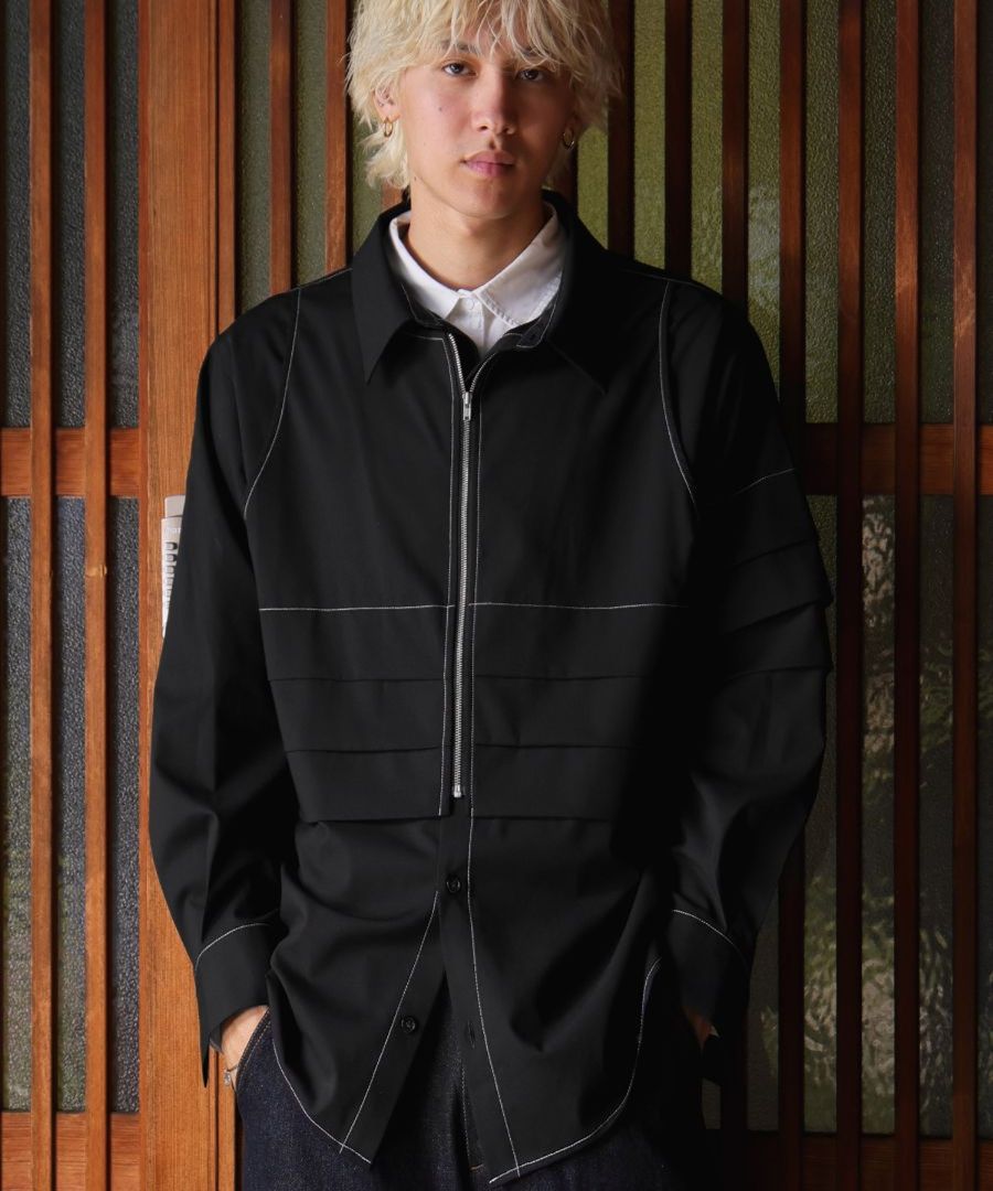 前開き仕様のジップ×ボタンのフロントがアクセントになり、アレンジの効いた着こなしが楽しめます。