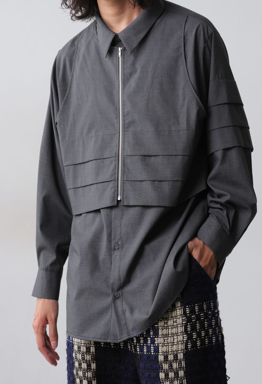 ベストを重ねたようなレイヤード風の切替が特徴のトップスは、シャツのきちんと感に遊びを加えた重ね着風デザインです。