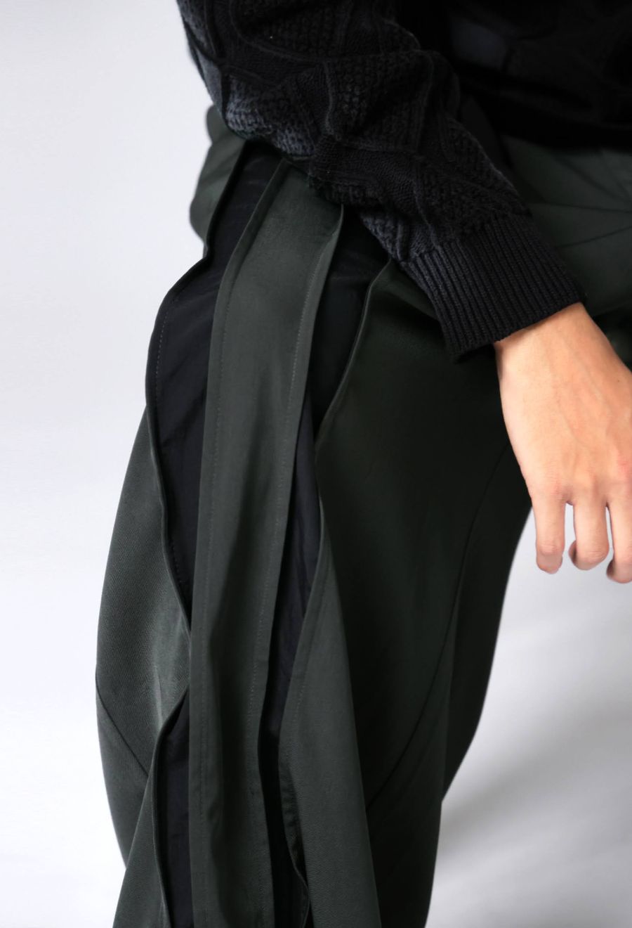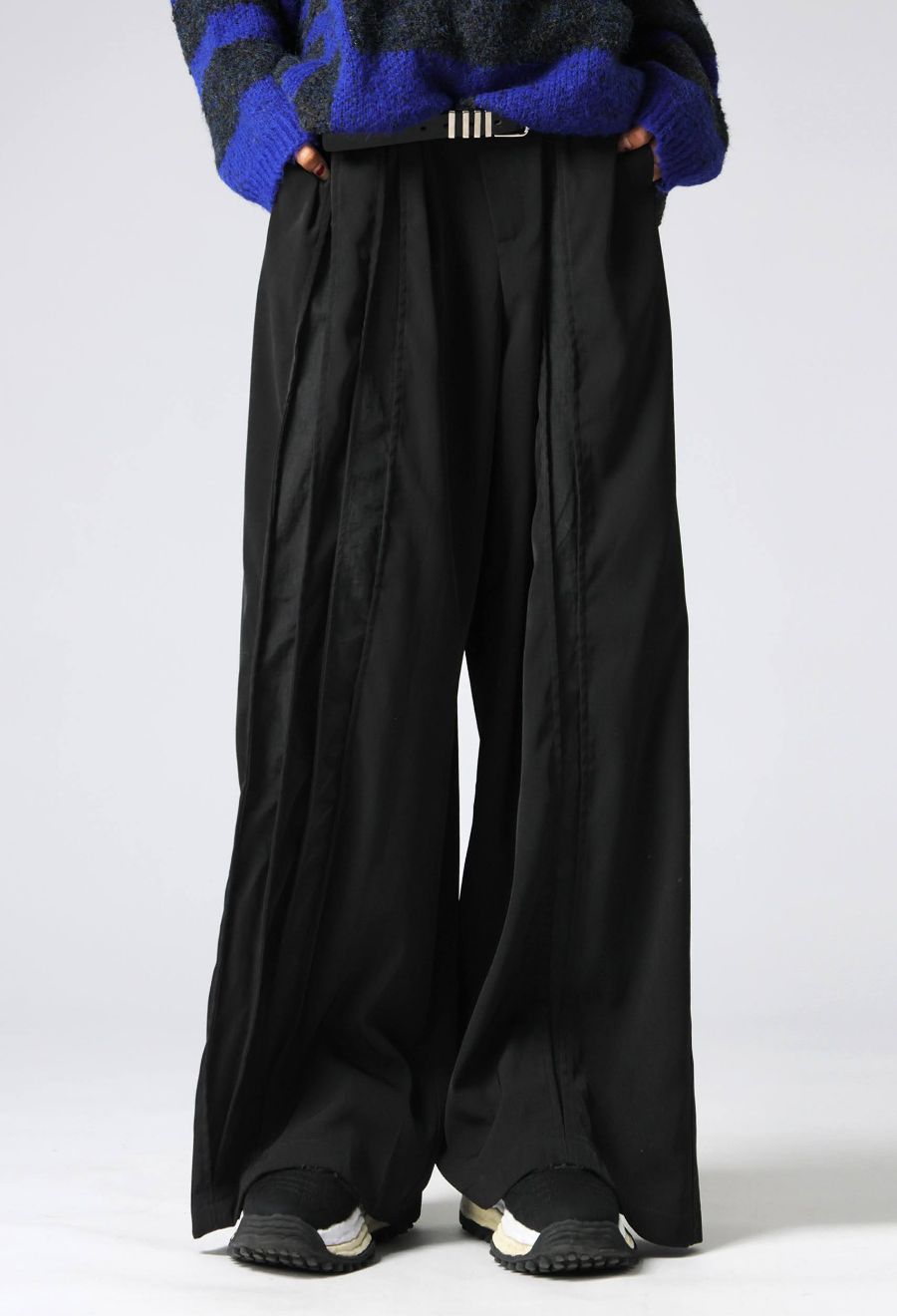 スラックスらしい端正な表情に、ナイロン素材の切替ラインをアシンメトリー(アシメ)で施したユニークな1本。