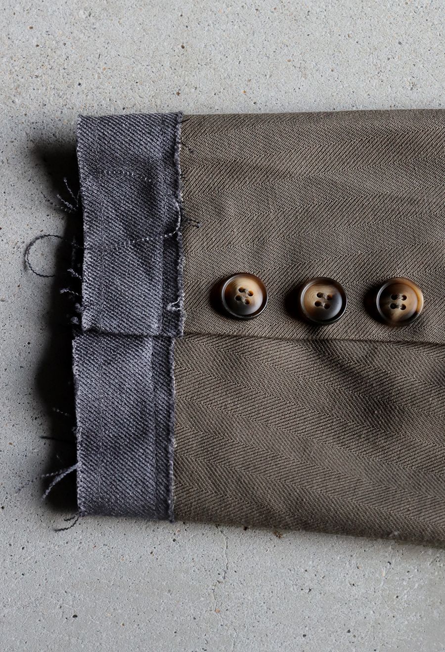 左右の身頃にあしらわれた異なる色味のヘリンボーン生地は、配色による切替で視覚的にもメリハリのあるデザインに。