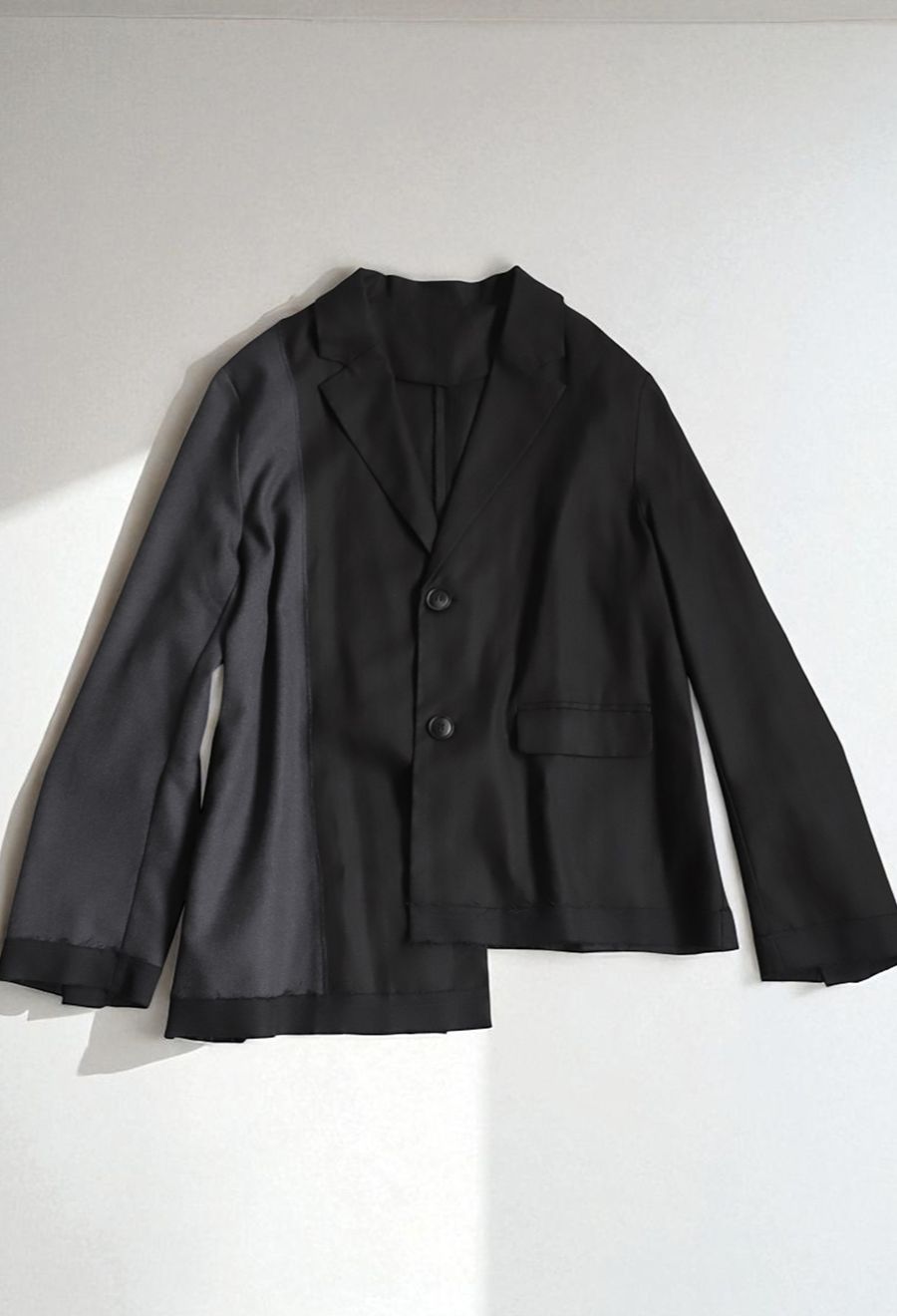 縦のラインで美しく凛とした雰囲気に仕上げた、異素材切替デザインのアシメジャケット。