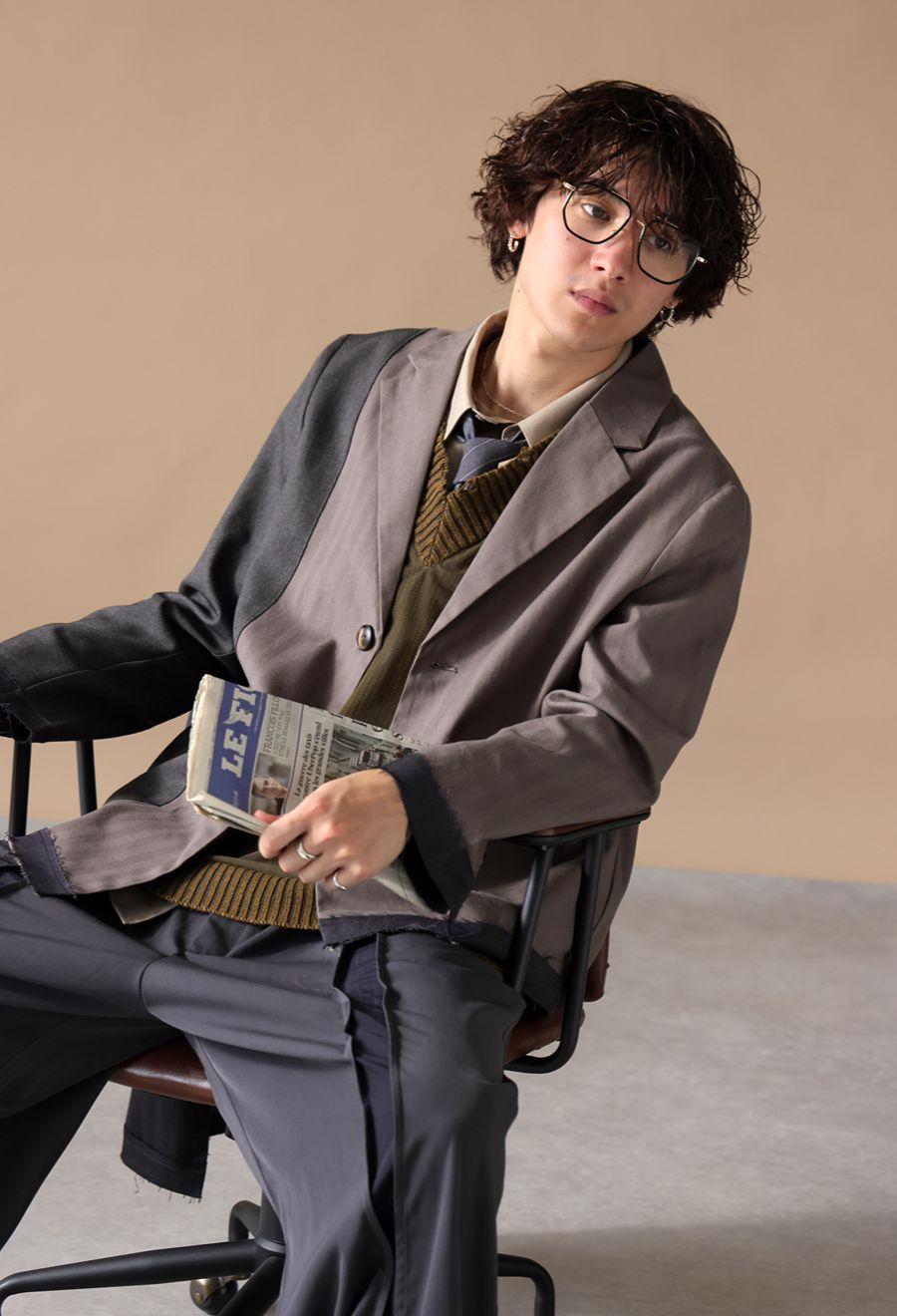 あえて縫い代を表に出したディテールや、マーブル模様のボタンがアクセントになり、メンズライクながらもモード感のある一着に。