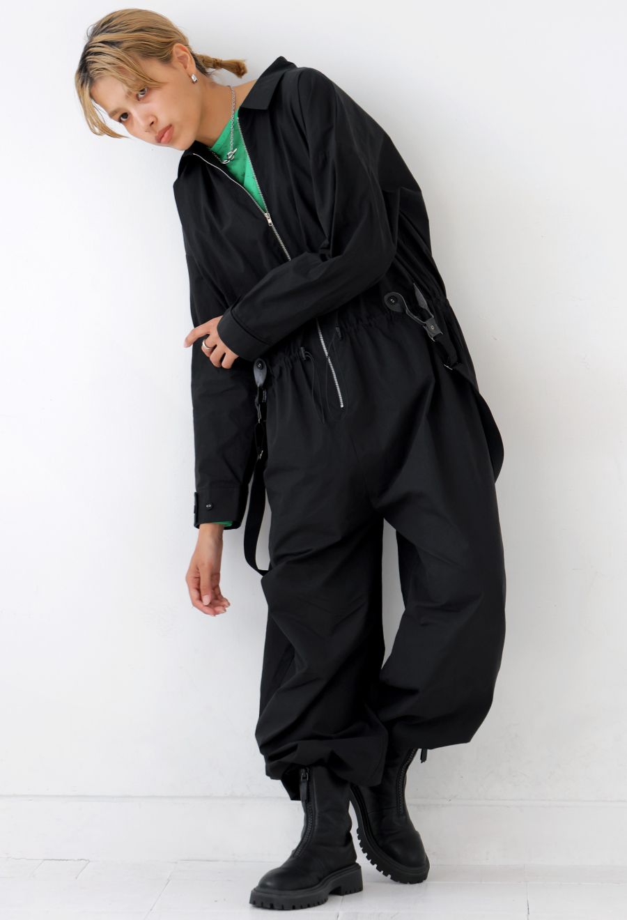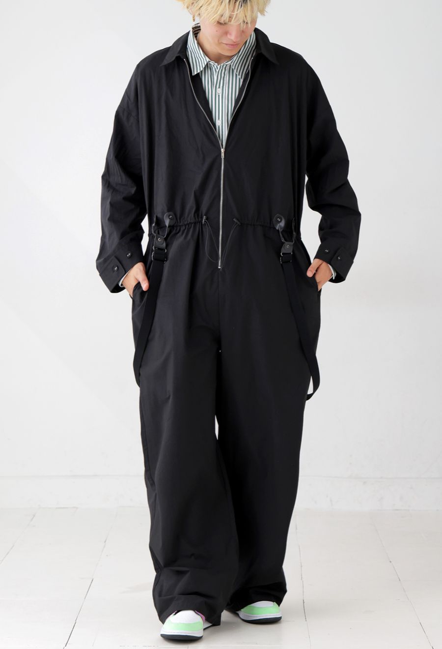 ゆったりとしたオーバーサイズとワイドシルエットで、リラックス感のある着こなしが楽しめるサスペンダー付きジャンプスーツです。