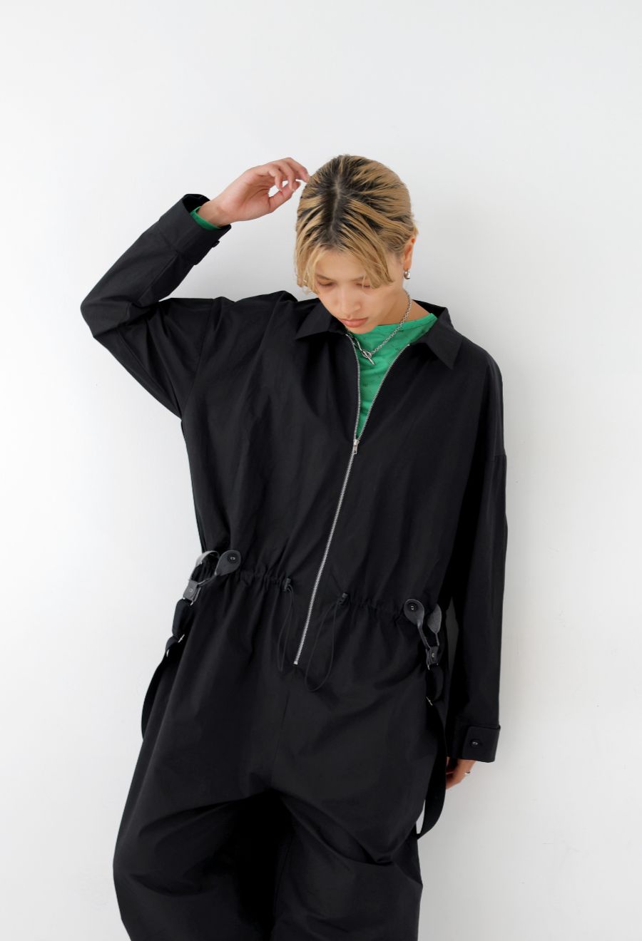 フロントはジップ開きで着脱もスムーズ。袖丈は長袖仕様で、ロールアップしての着こなしにも対応します。