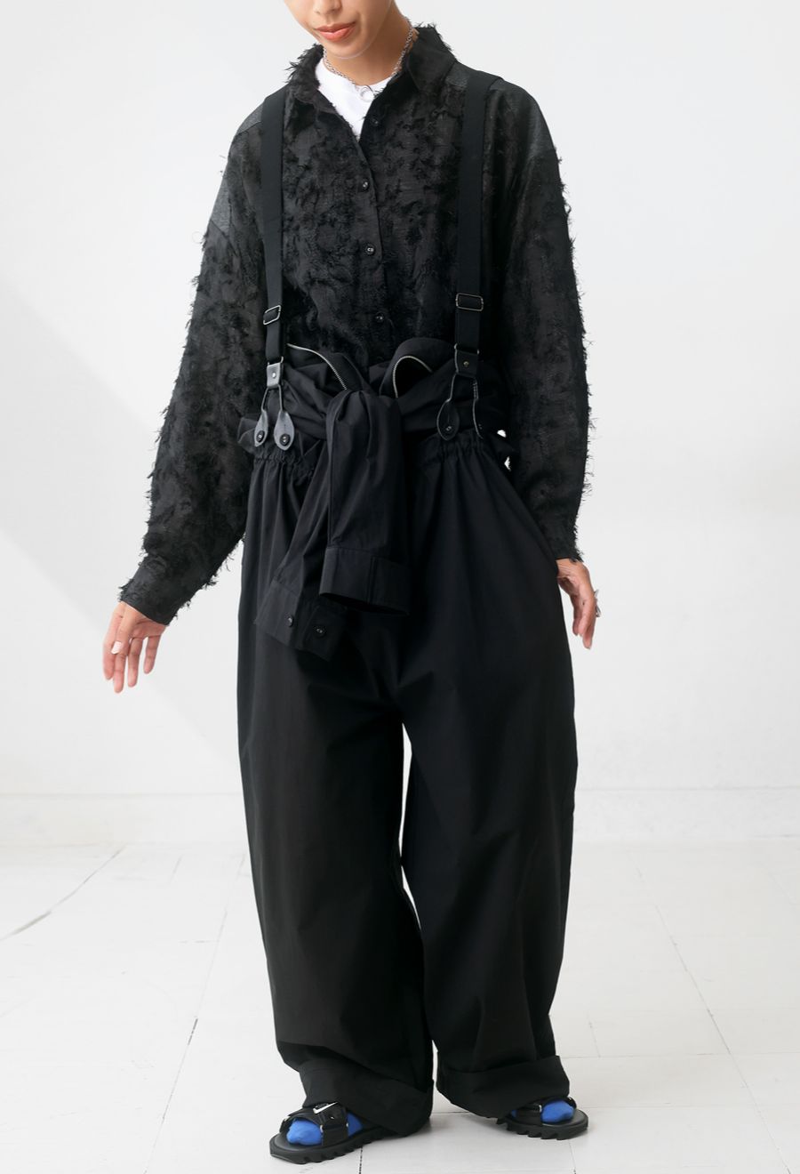 取り外し可能なボタンタイプのサスペンダーは、肩にかけても垂らしても様になり、アレンジの幅を広げてくれます。