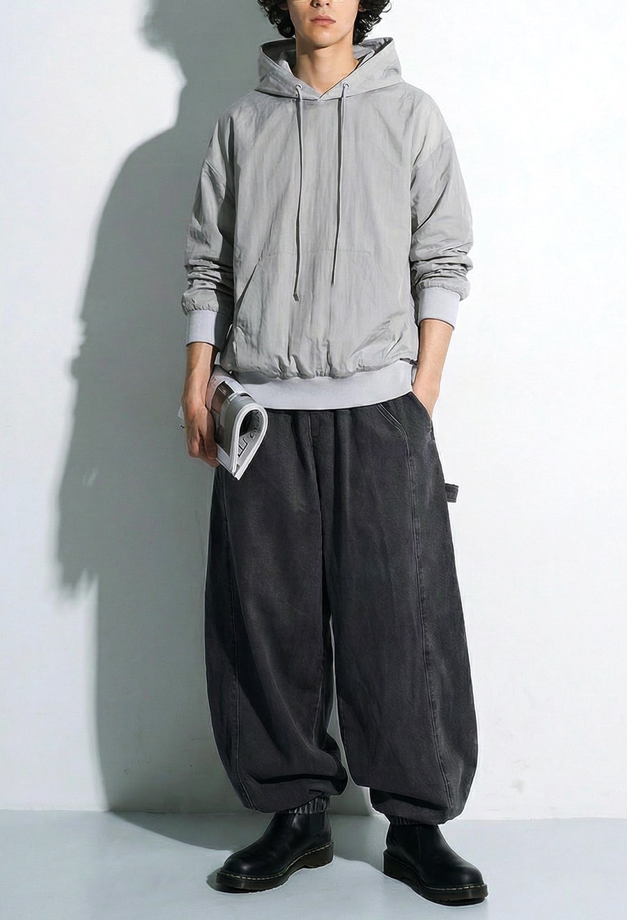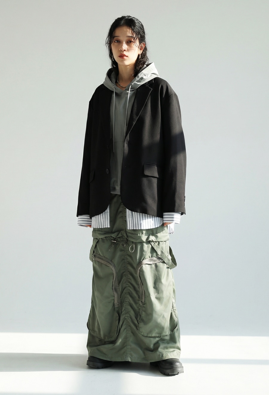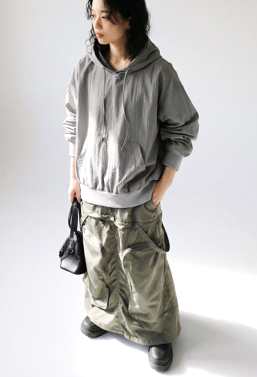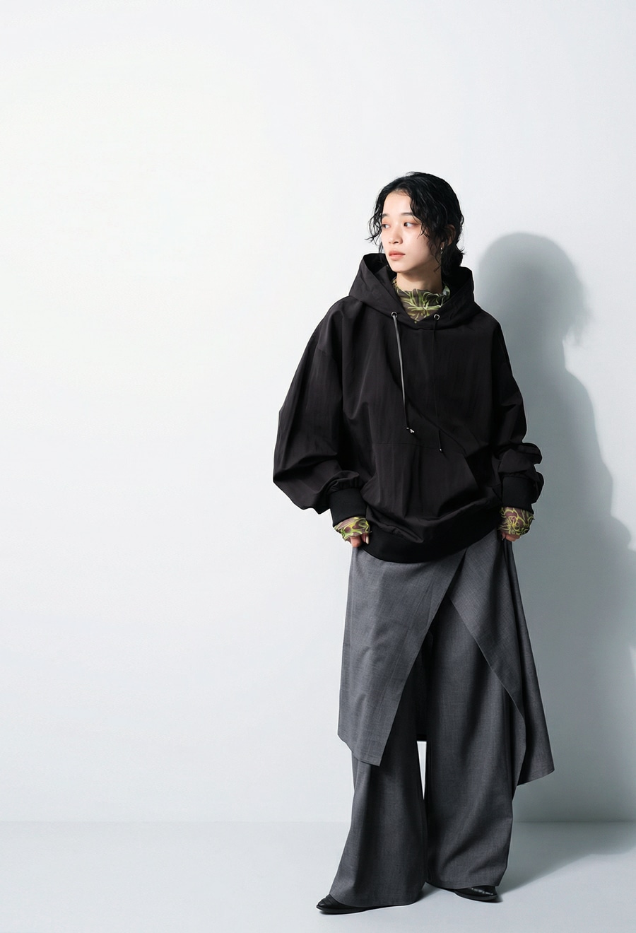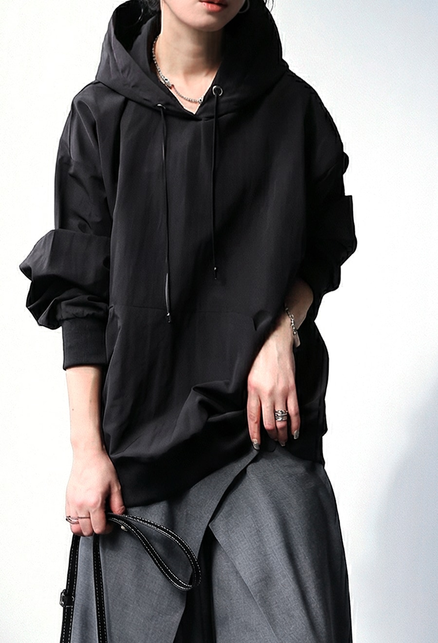 立体的なフードデザインのネックラインが首元に自然な抜け感を生み、シンプルながら存在感のある佇まいに仕上げました。