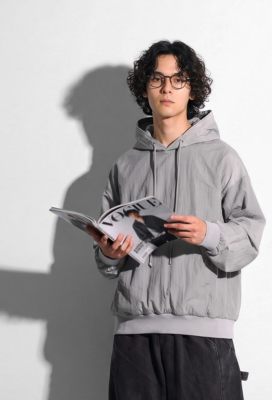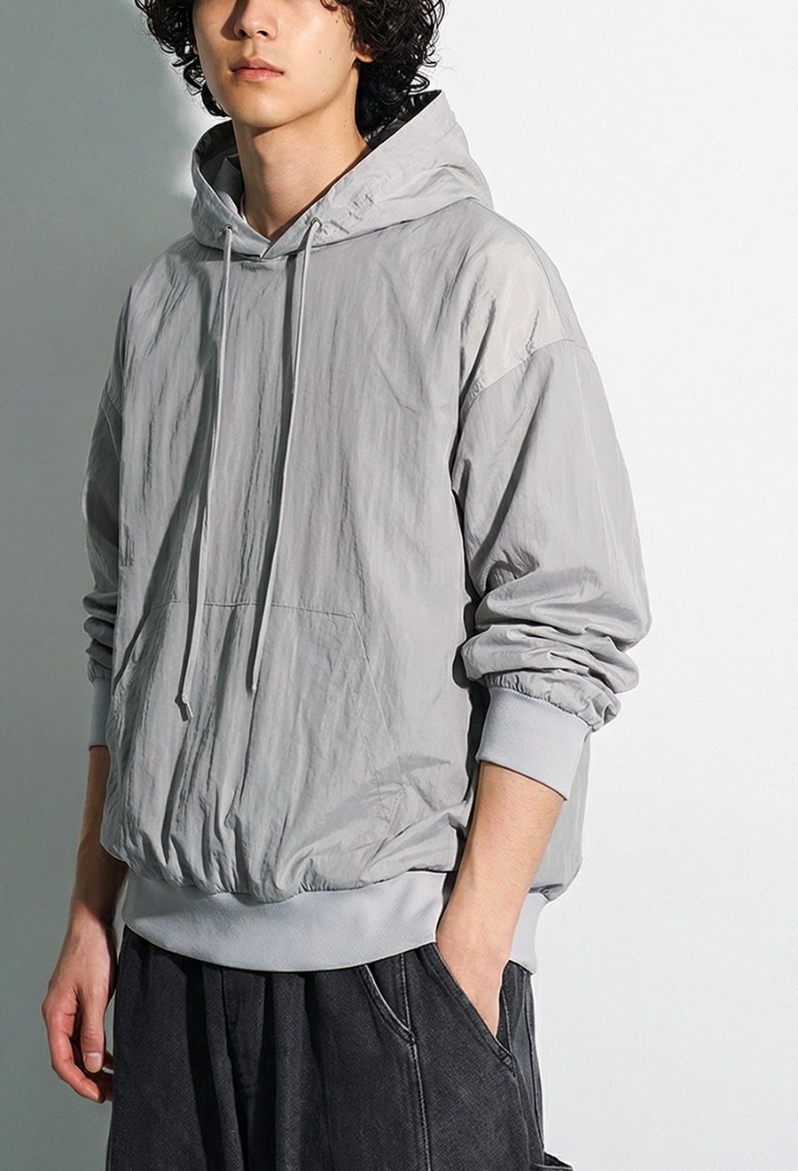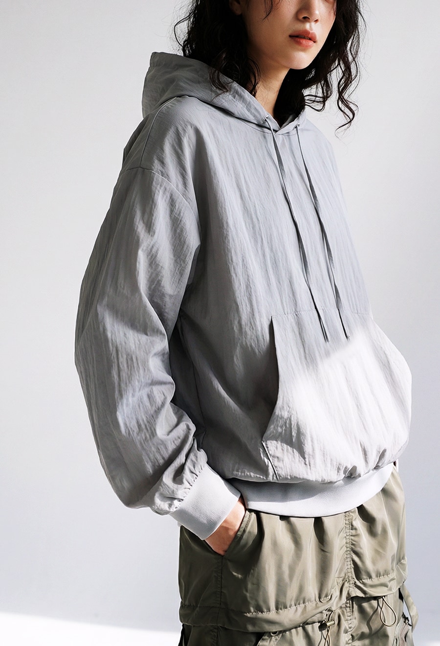 無地の柄をベースに、さりげなく煌めくシルバーのハトメがアクセントとなり、光沢感のあるフード紐が上品さを添えます。