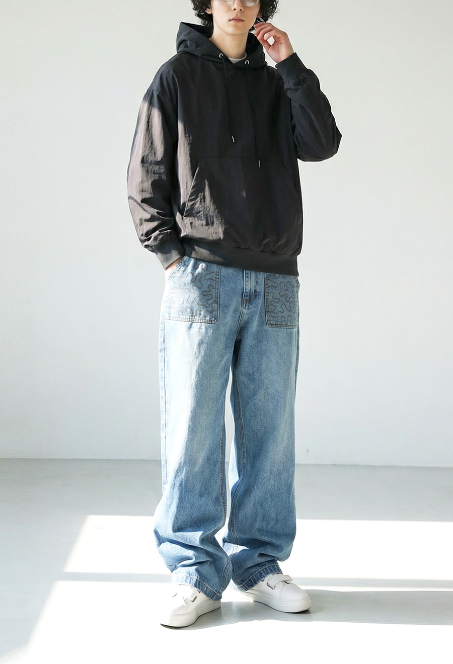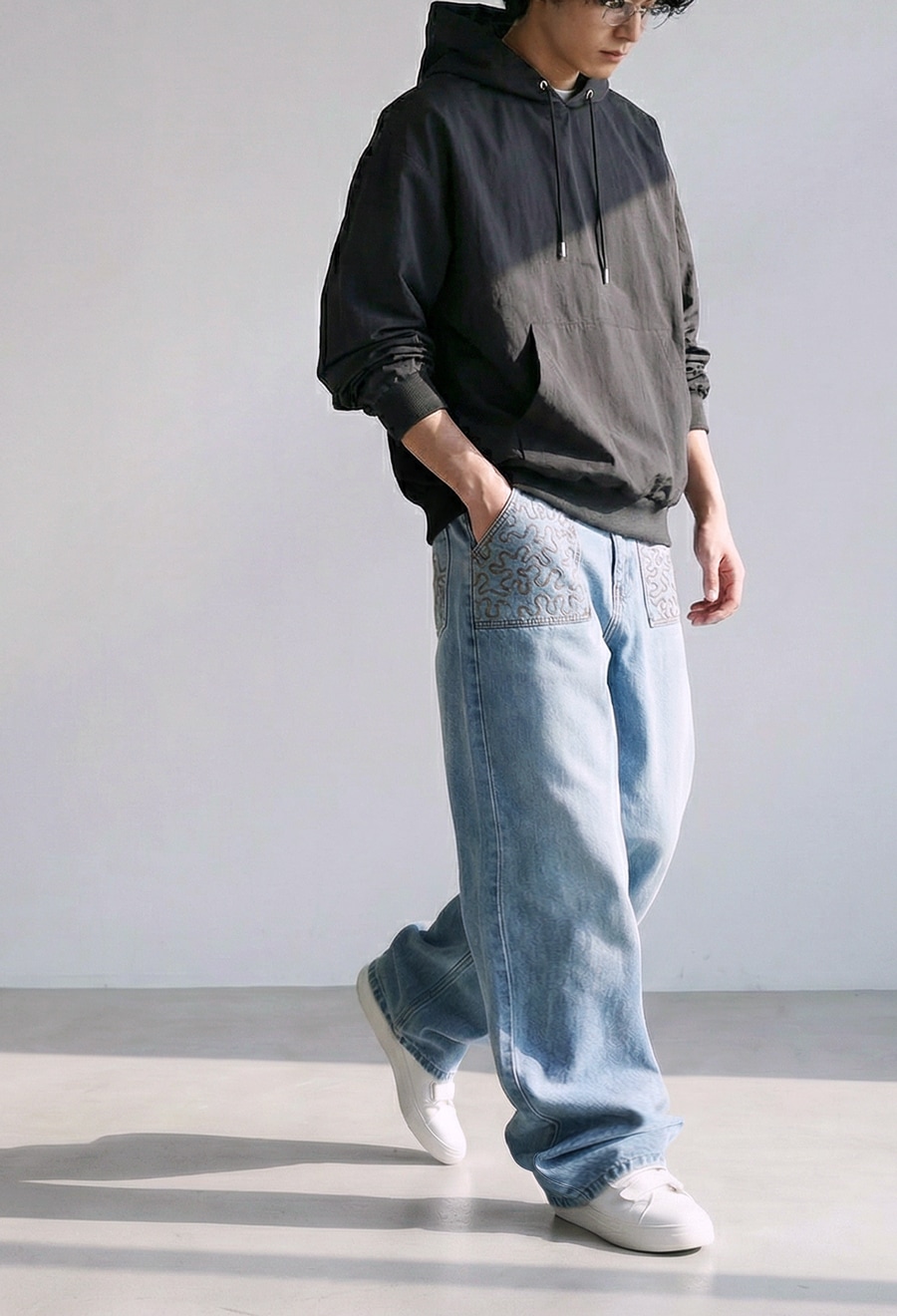 袖丈はやや長めに設計し、ゆとりを持たせた形状がラフでこなれた印象を演出します。