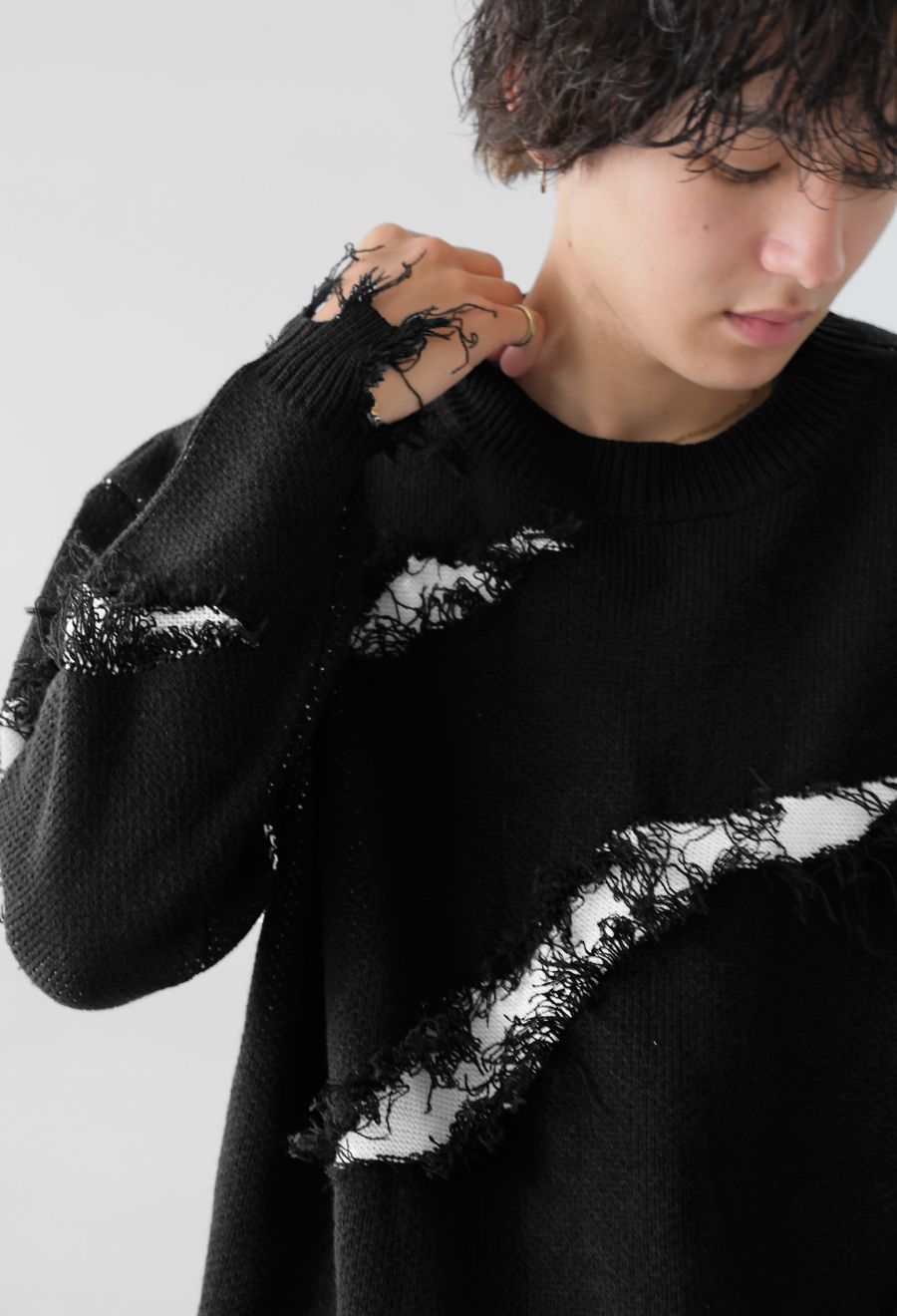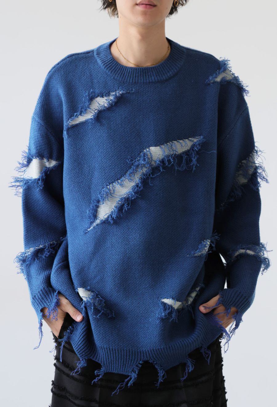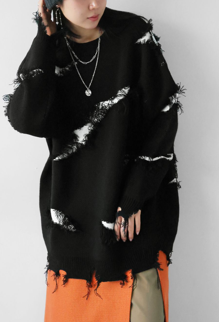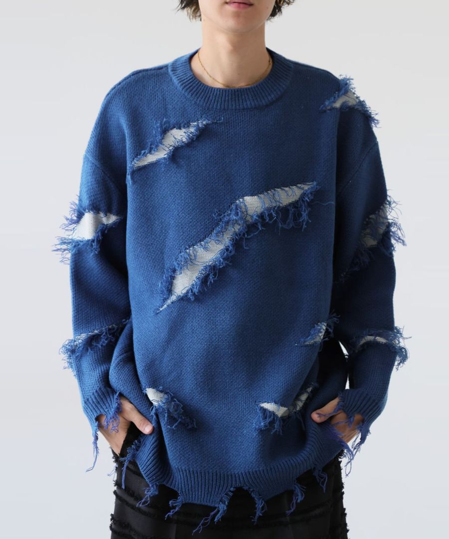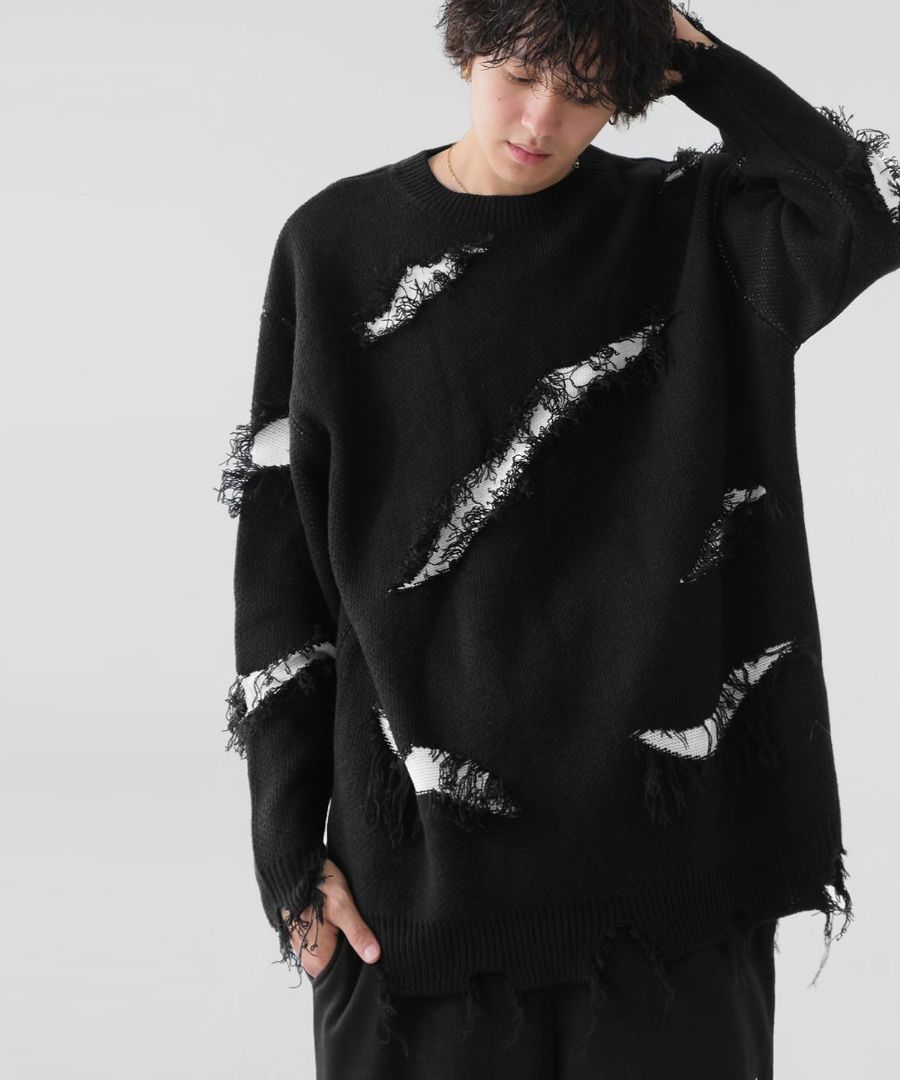大胆なスラッシュダメージが目を惹く、個性派デザインのニットトップスです。