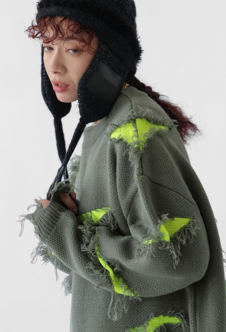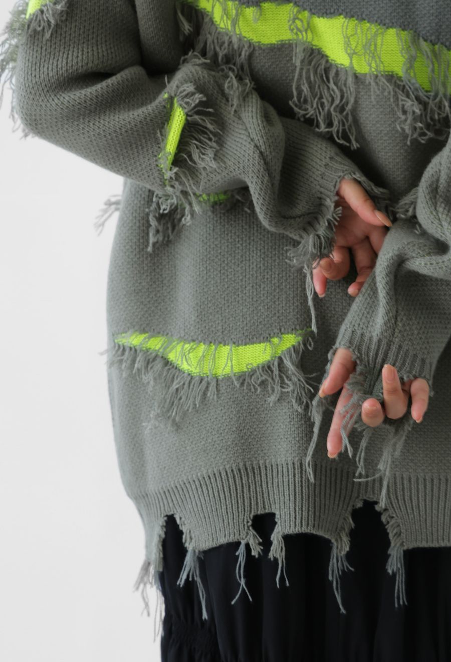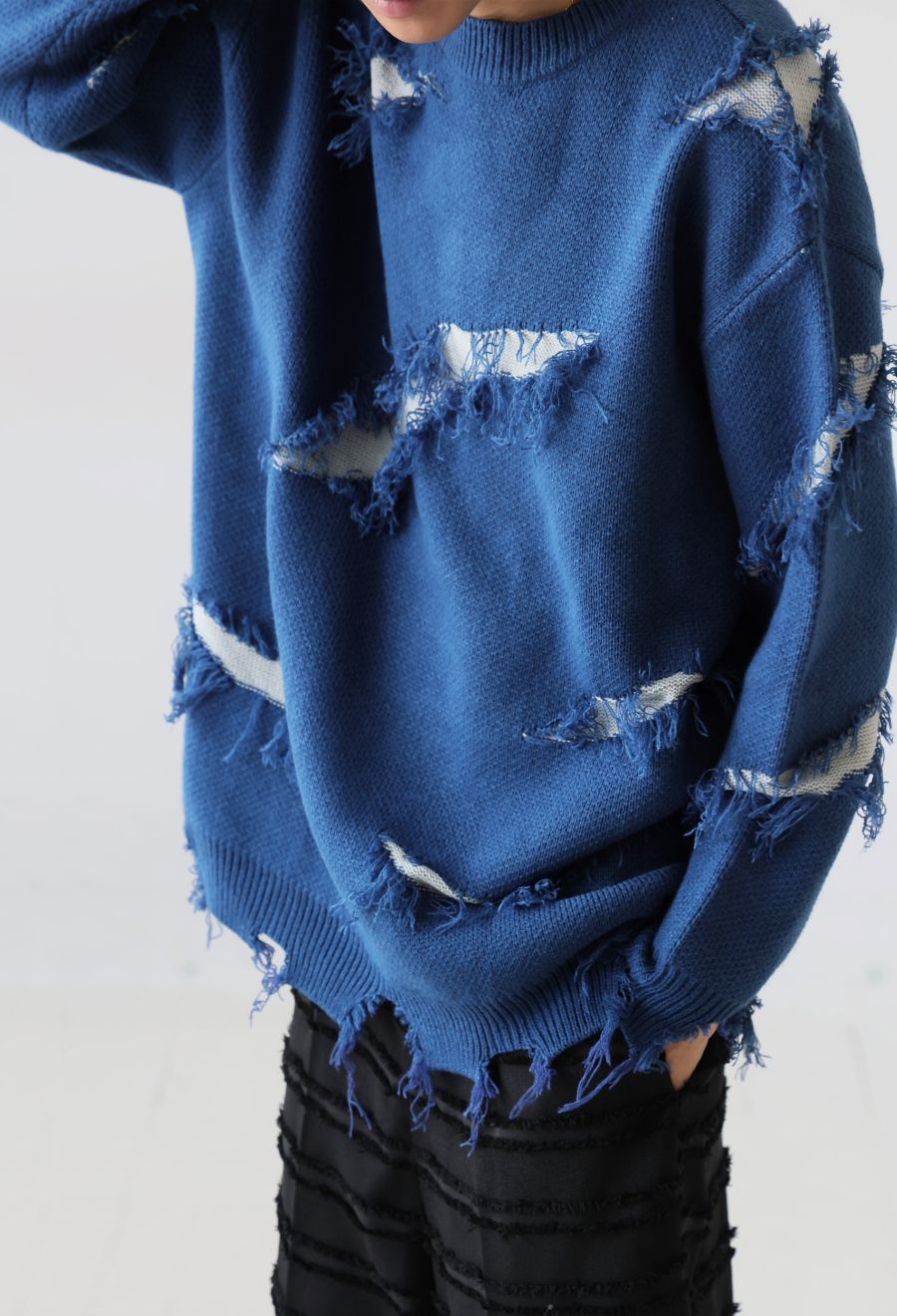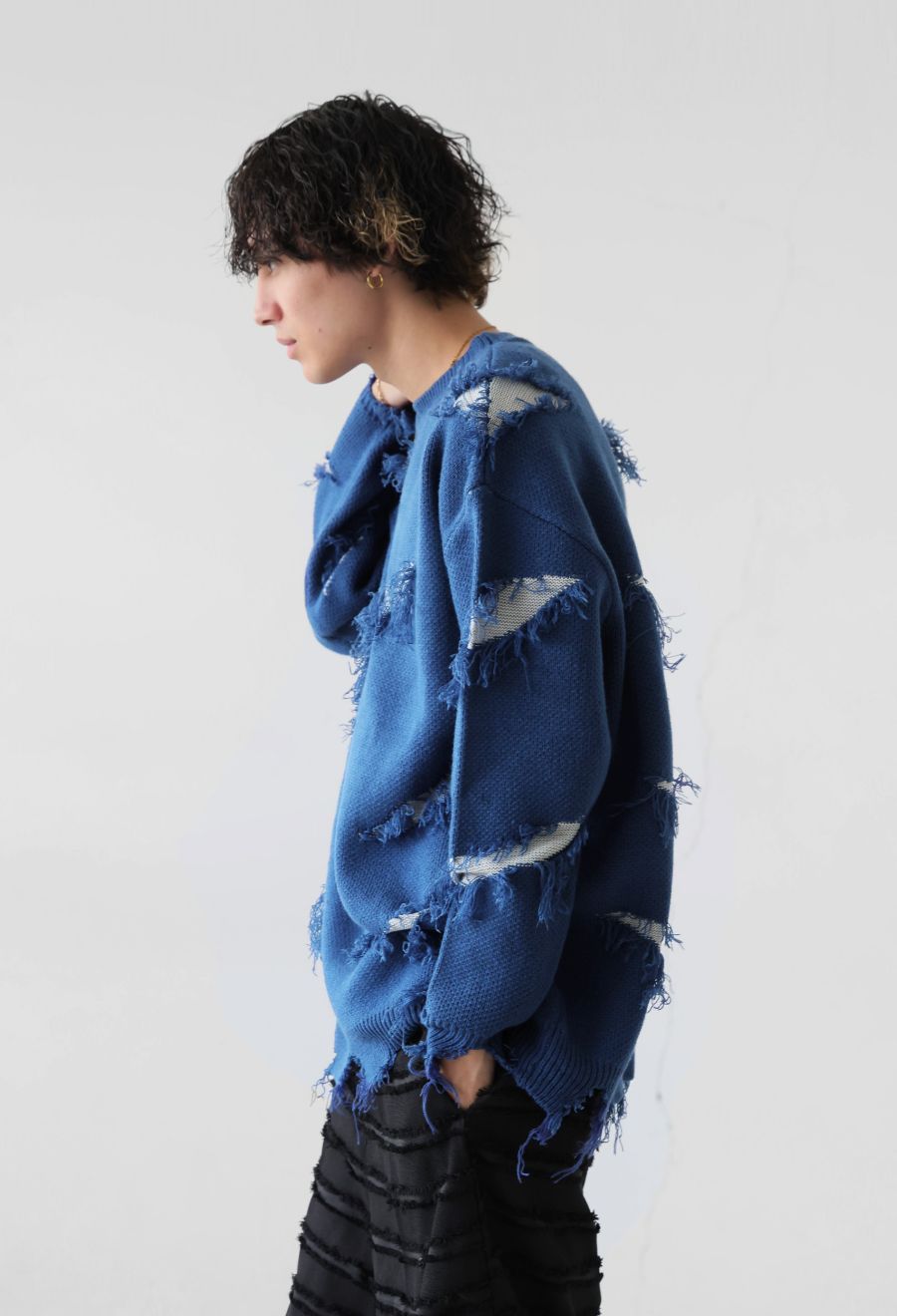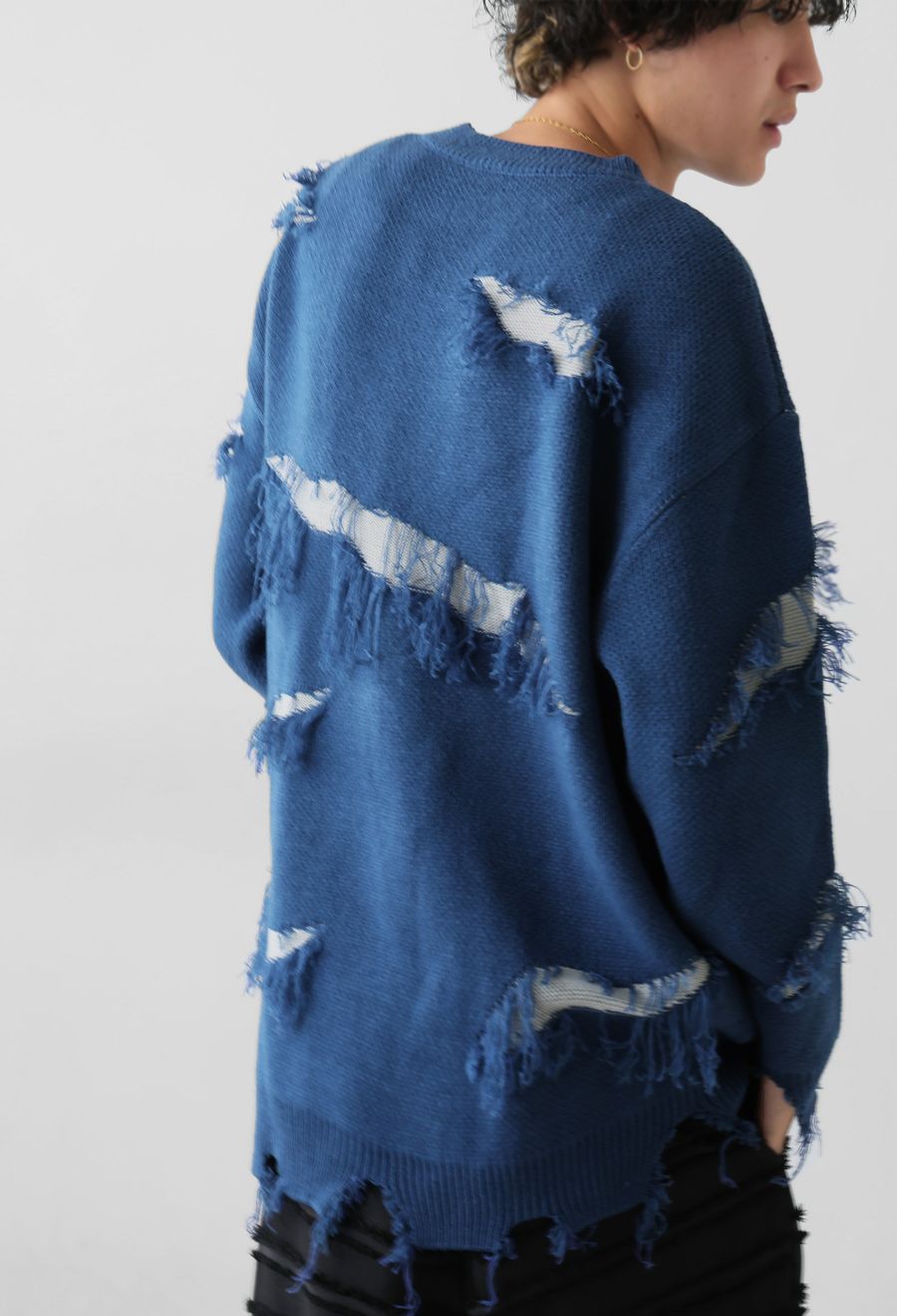大胆なスラッシュダメージが目を惹く、個性派デザインのニットトップスです。