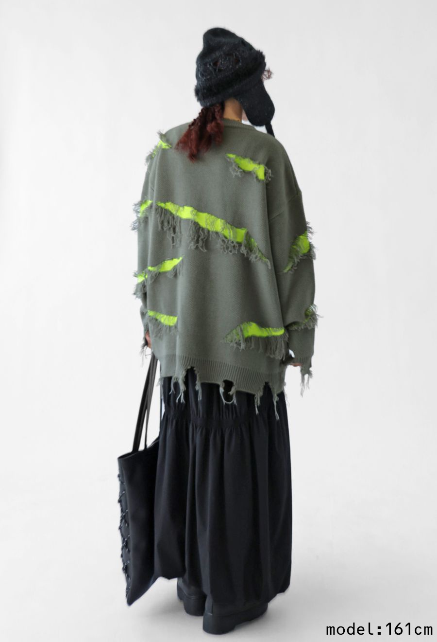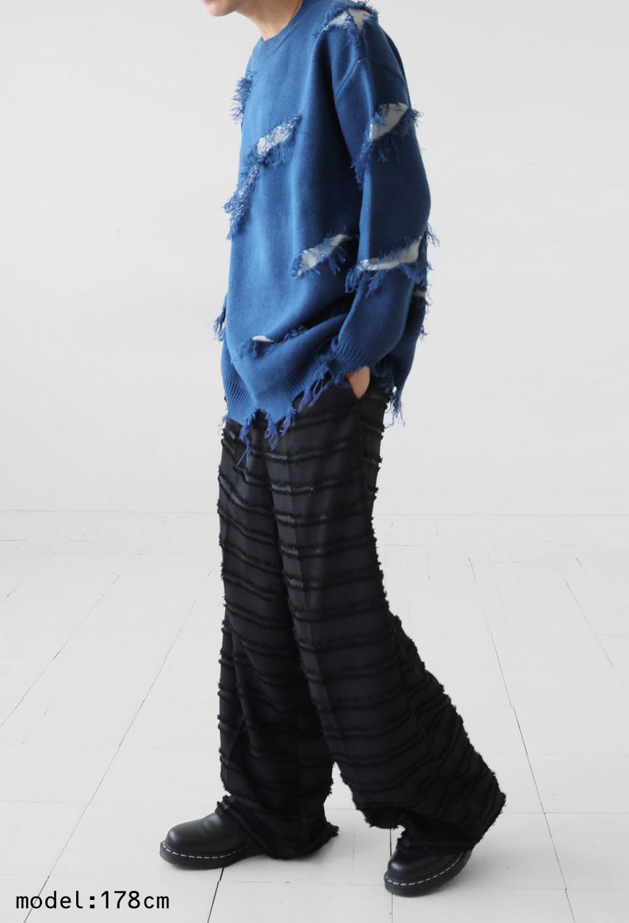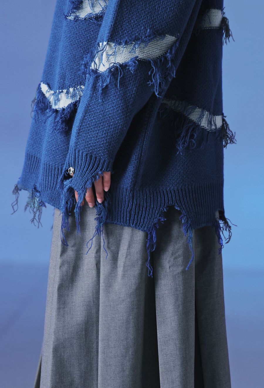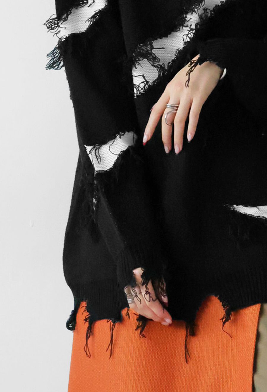 大胆なスラッシュダメージが目を惹く、個性派デザインのニットトップスです。