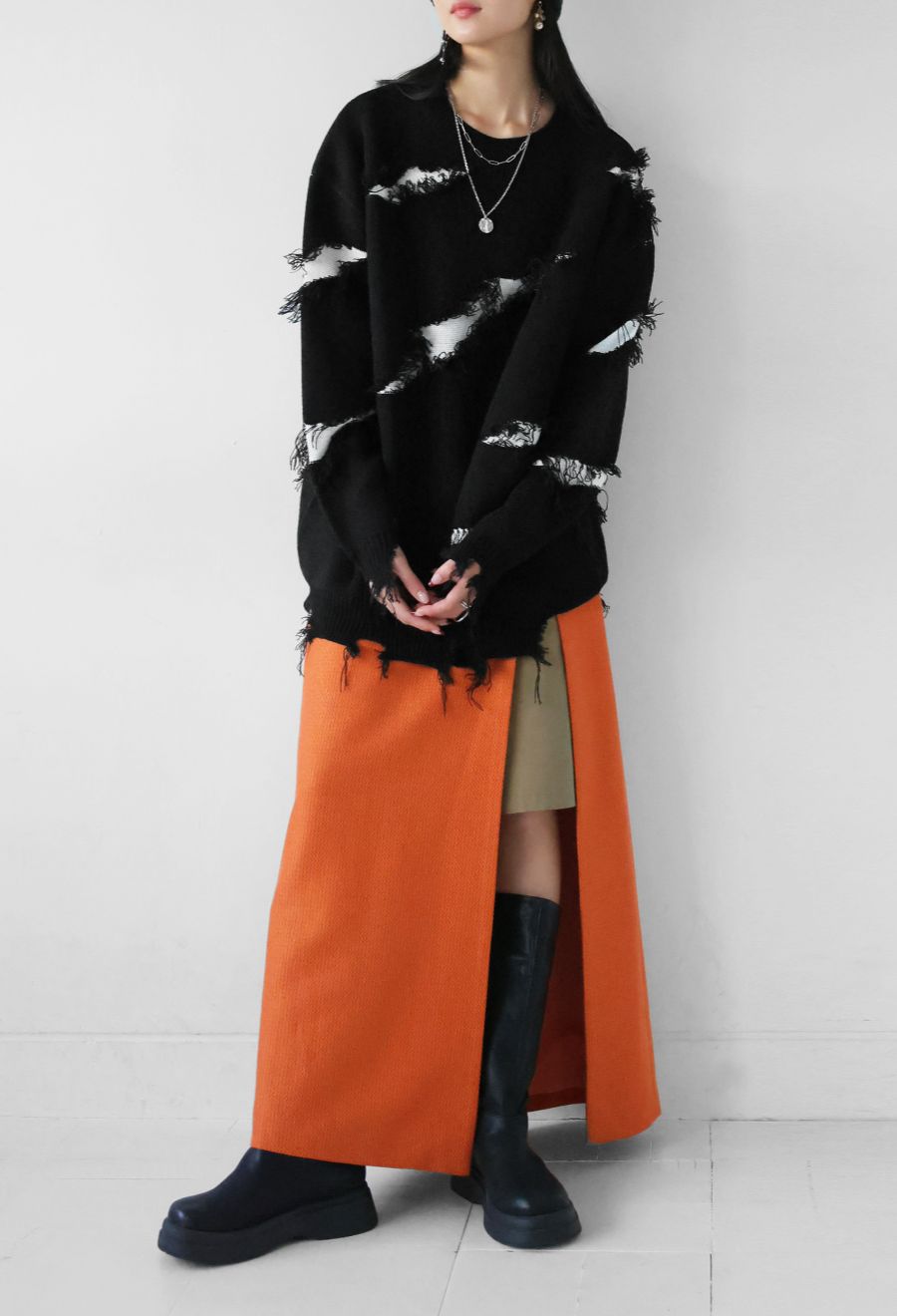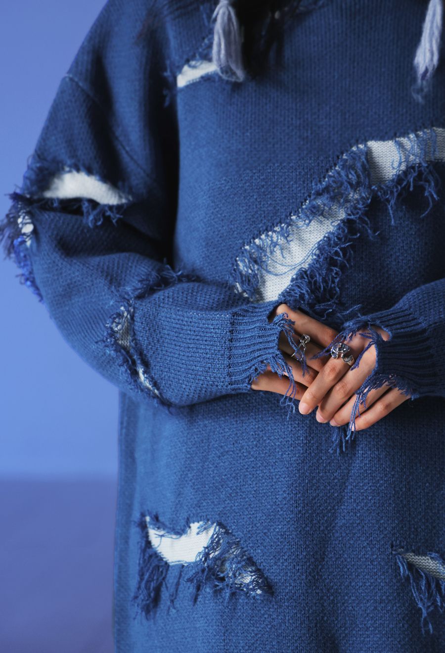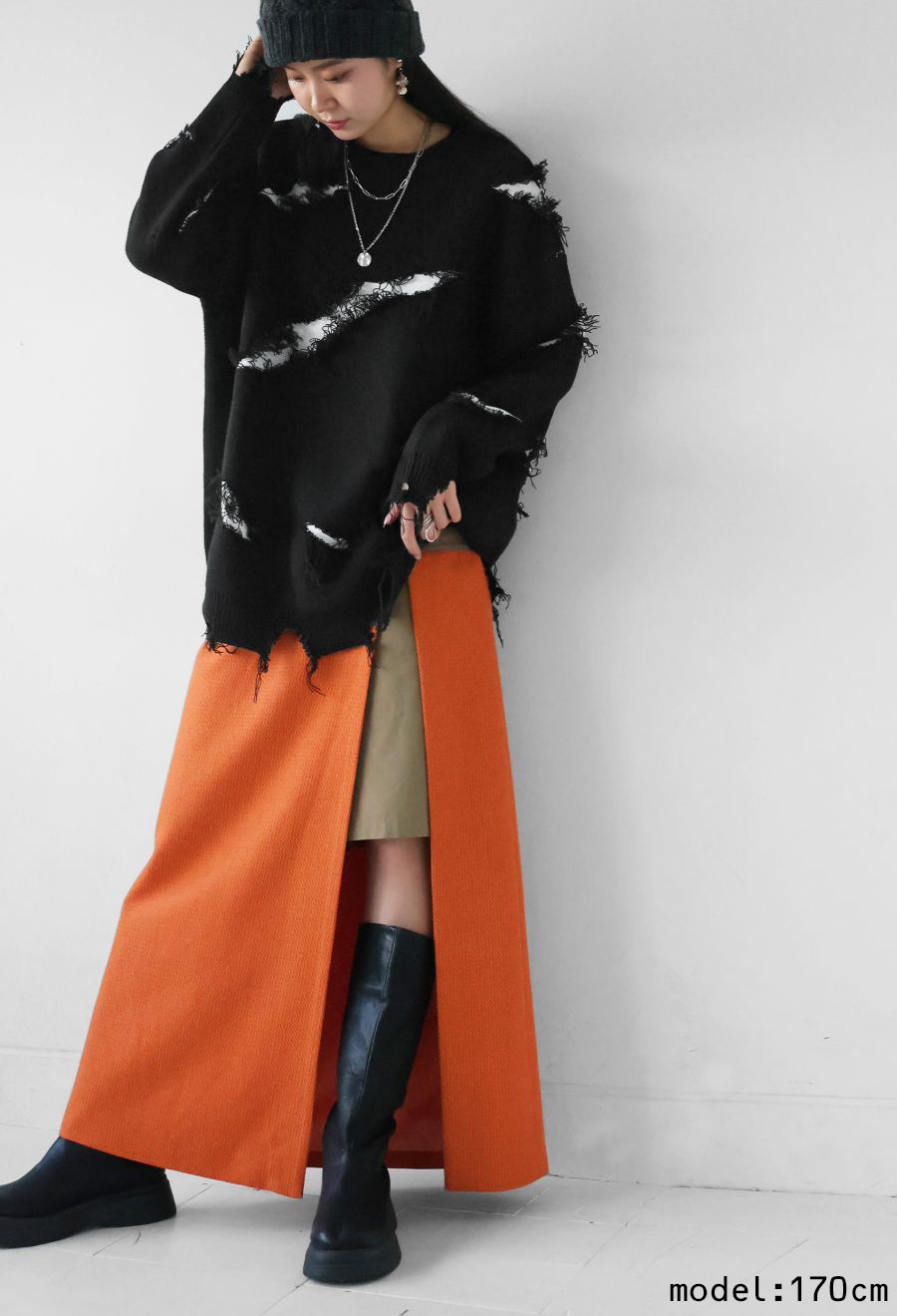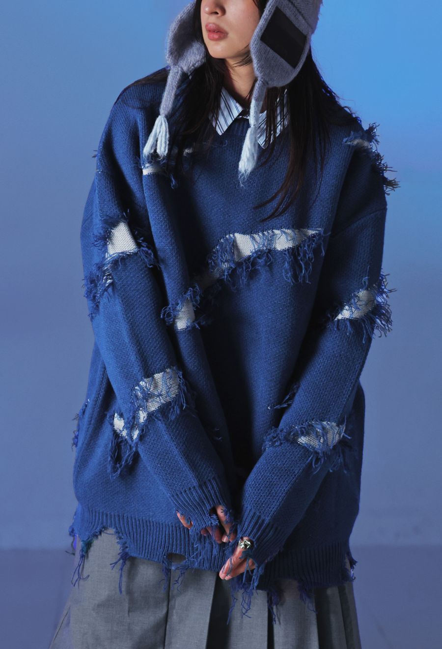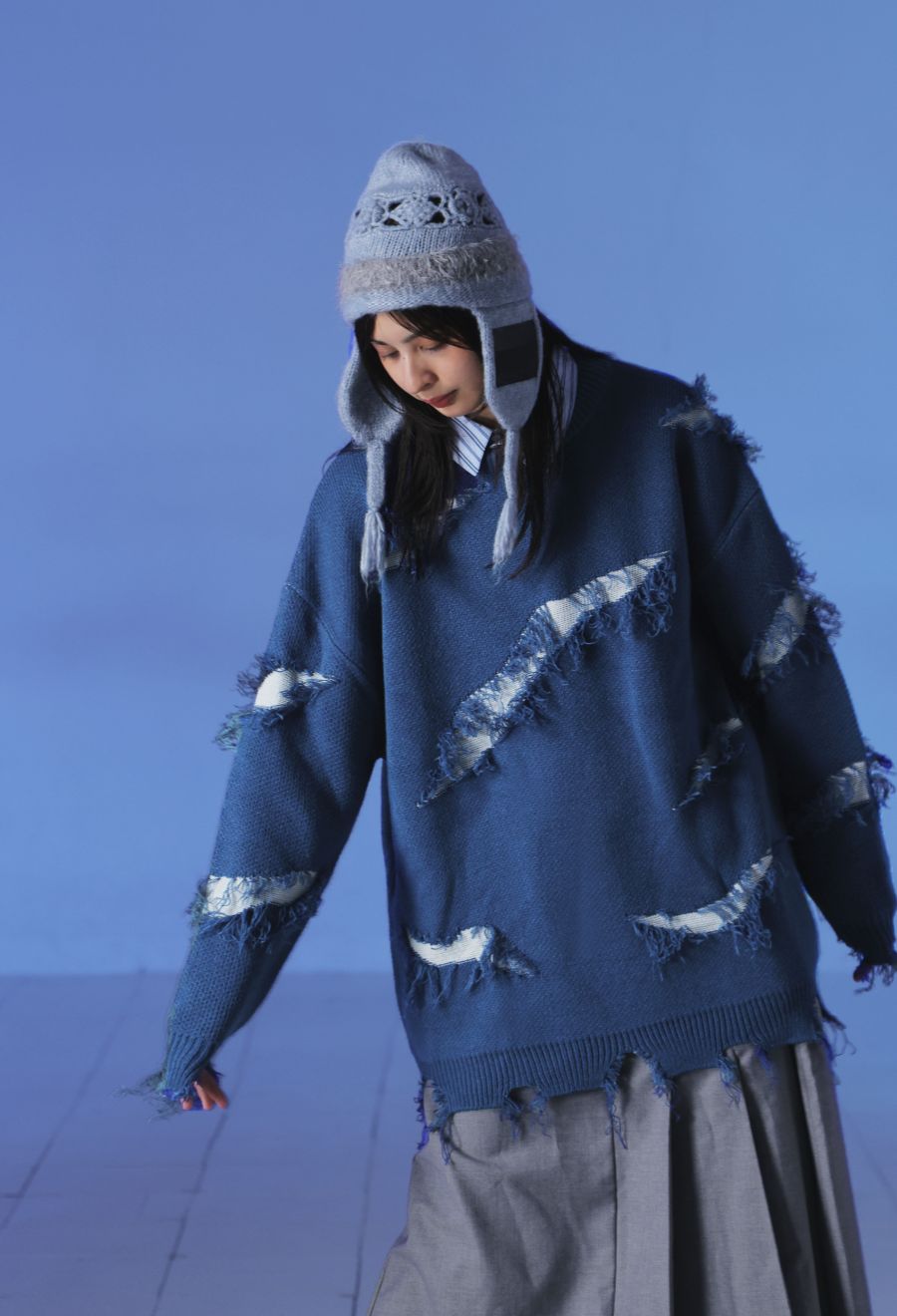 大胆なスラッシュダメージが目を惹く、個性派デザインのニットトップスです。