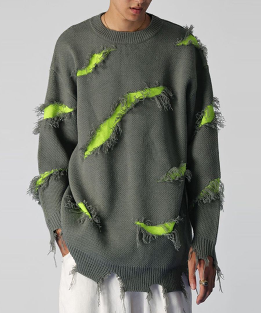 スラッシュダメージ 配色ニット ユニセックス 長袖 送料無料・メール便不可