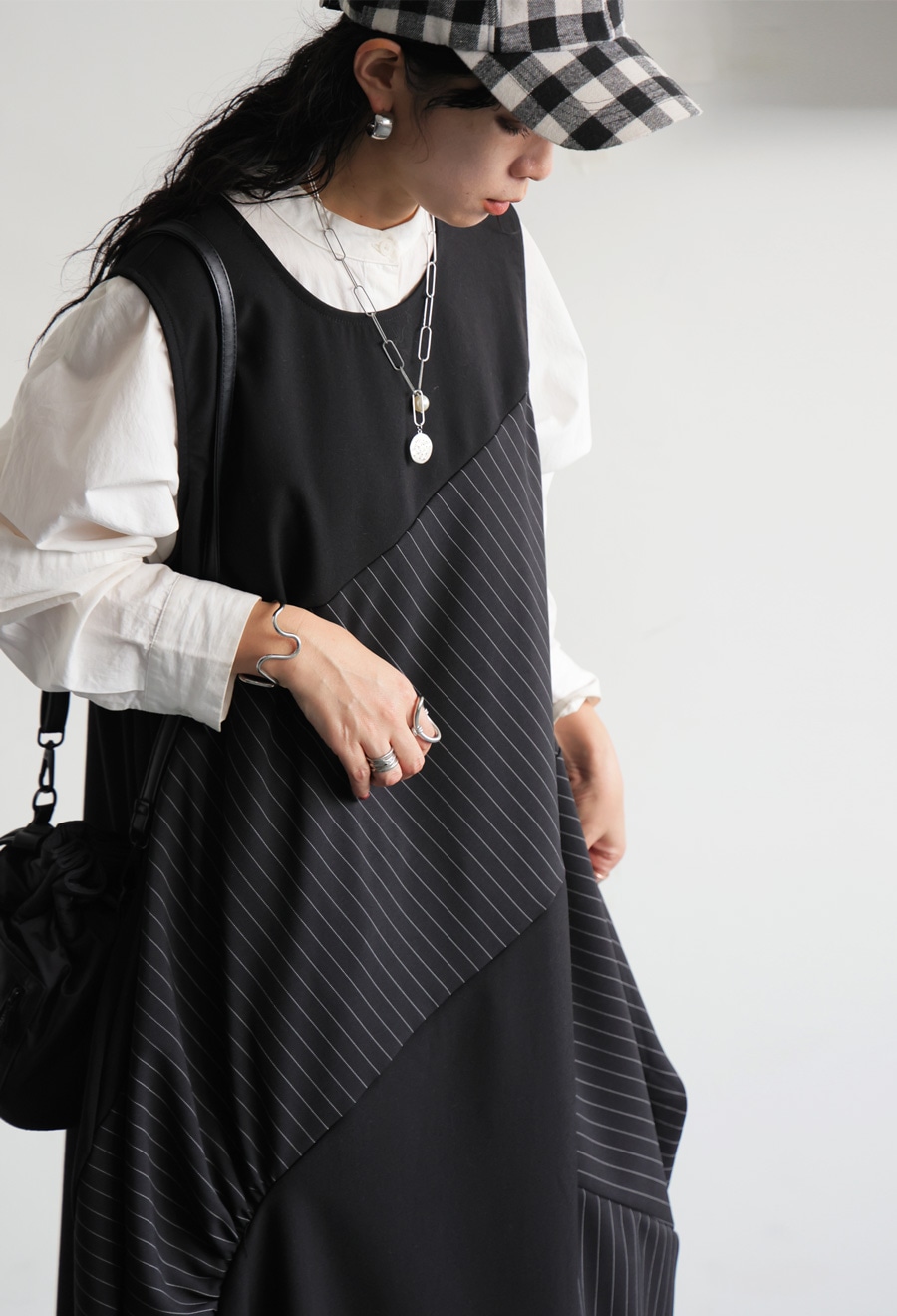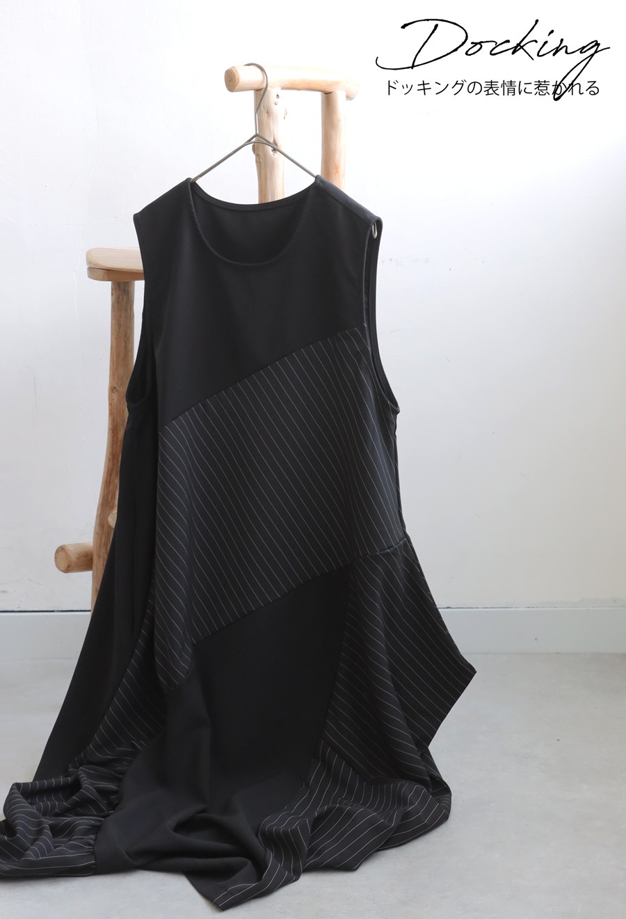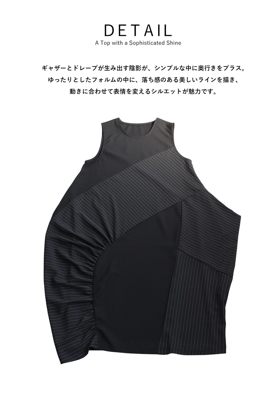 片側に寄せたギャザーがアクセントとなり、柄の異なるピンストライプと無地の切替で動きのある表情を演出。