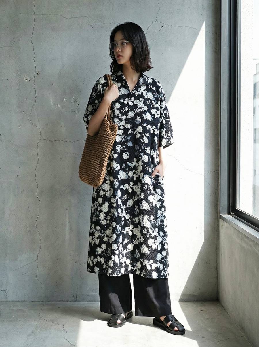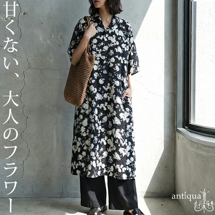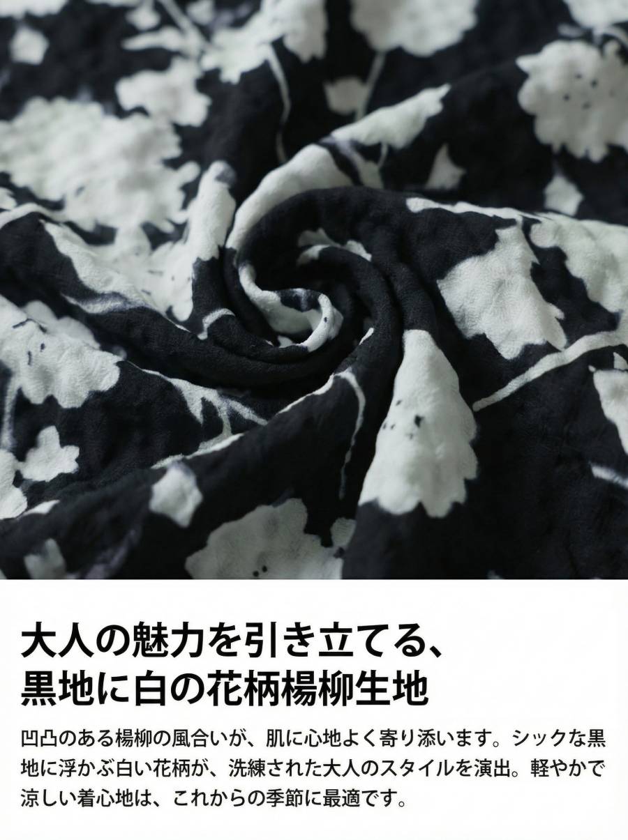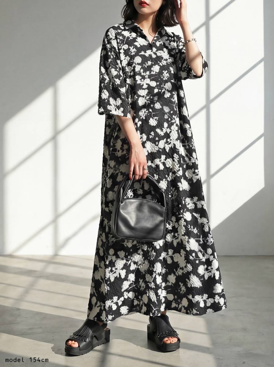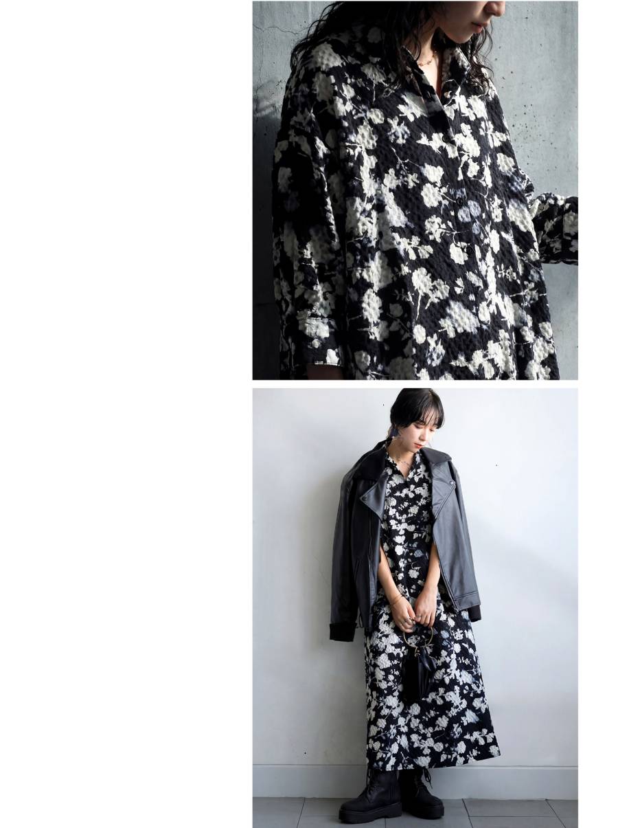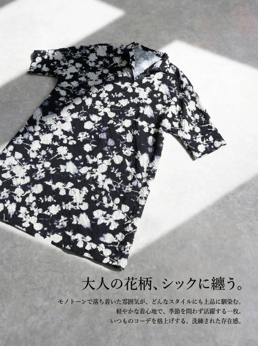 柄は黒地に白の花柄デザインで、甘くなりすぎず大人らしい雰囲気に。